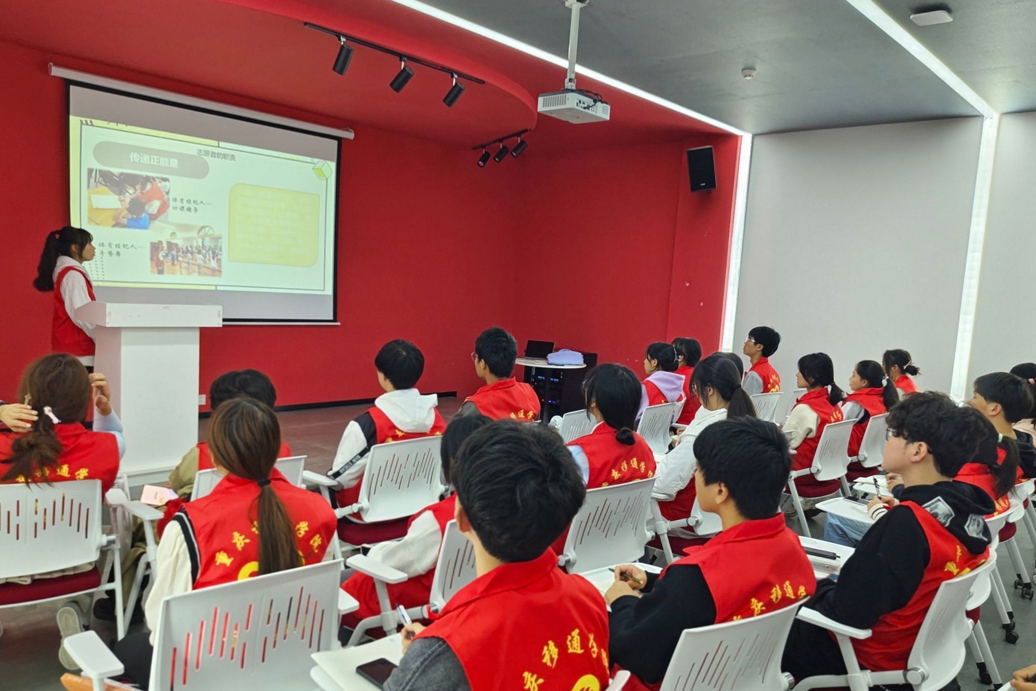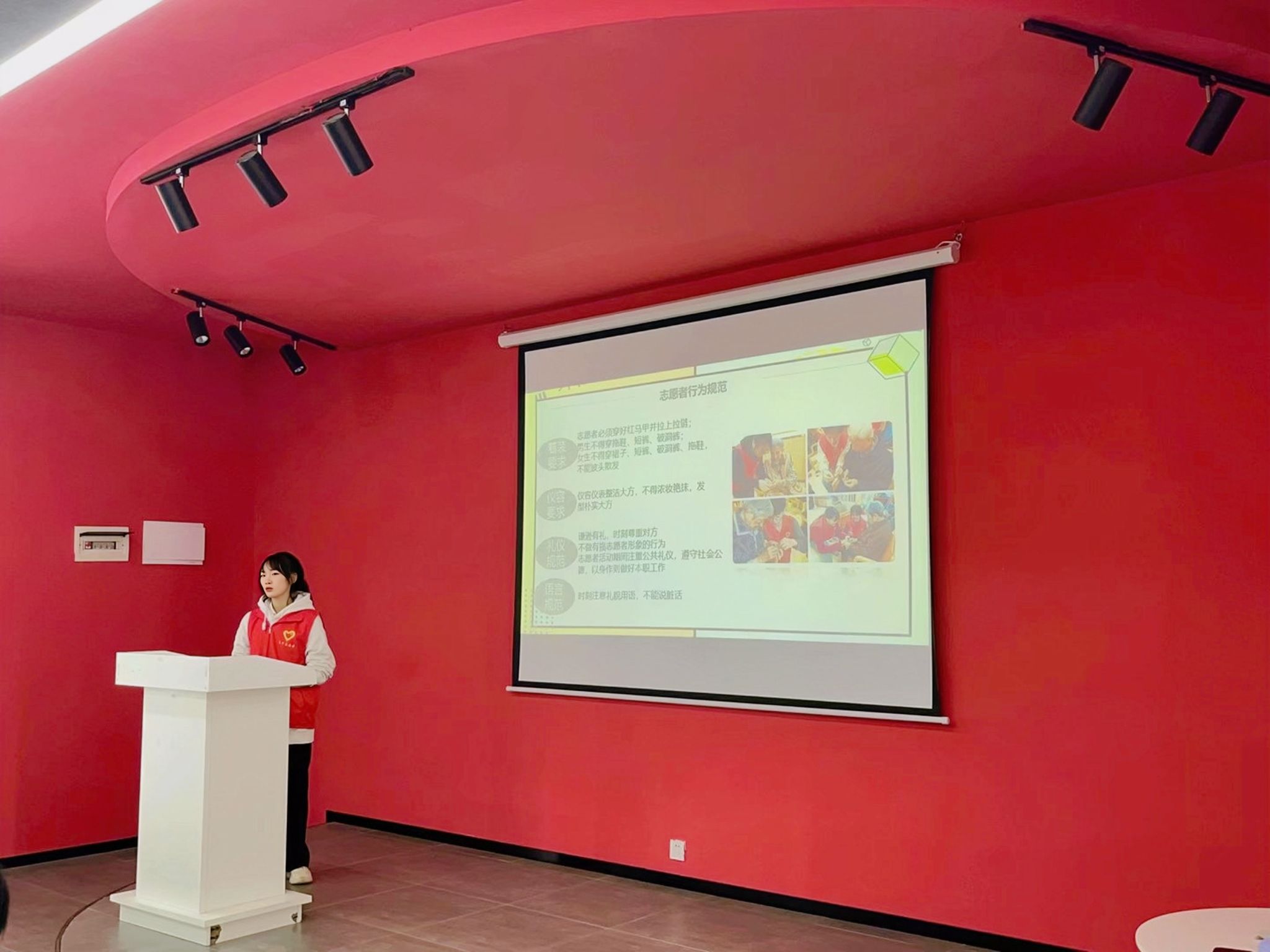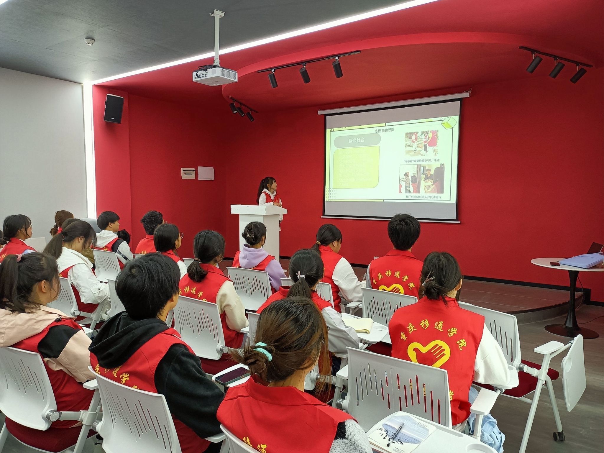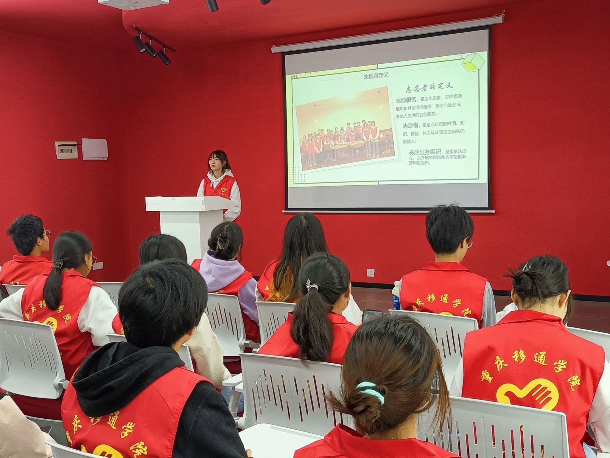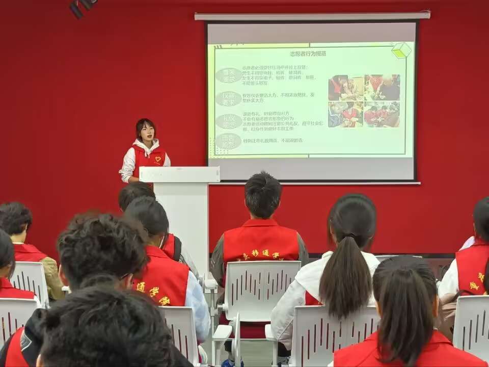 奉献时间,收获充实;奉献爱心,收获感动。志愿者如点点星光,星光汇聚便无比耀眼,散发光芒。主讲人倪熔以杭州亚运会志愿者为切入点,引出志愿者的定义。紧接着,主讲人倪熔从“服务社会”、“关爱他人”、“传递正能量”、“提高自身素质”和“维护志愿者形象”五个方面来诠释着志愿者的职责,希望志愿者可以得到自我提升,提高自己的社会责任感,承担志愿者的担当,为祖国贡献力量。同时,主讲人倪熔为志愿者讲述志愿者的义务,志愿者必须接受志愿服务活动组织者的指导和安排,履行志愿者承诺,不做与志愿服务活动宗旨、目的不符的行为。