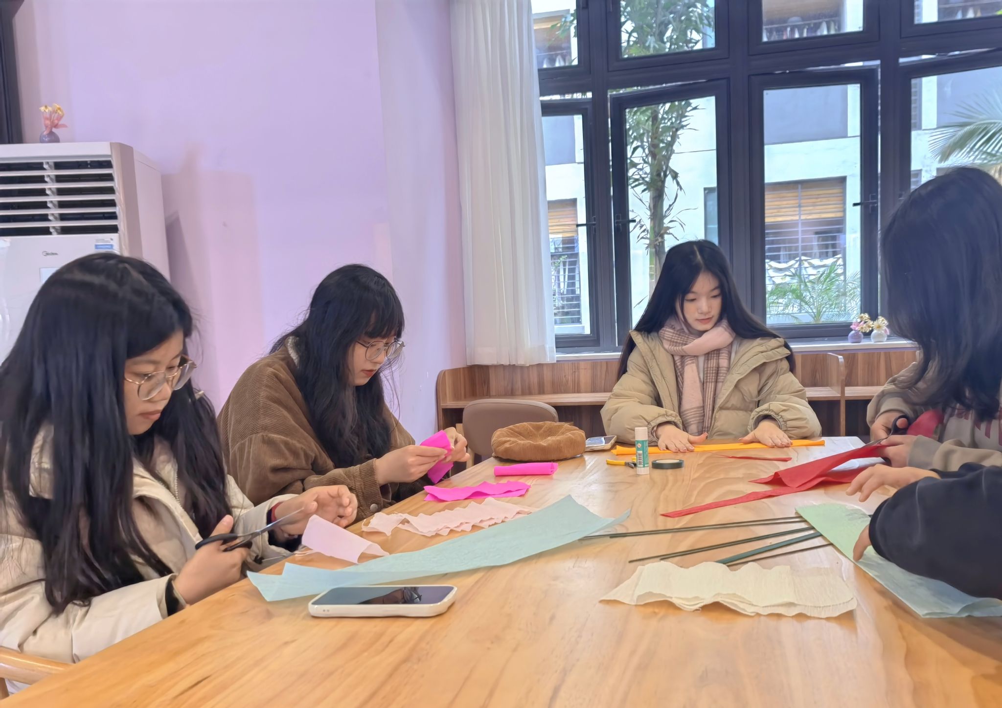 细微之处见匠心,精心制作方传神。本次玫瑰花制作活动分小组进行,5人一组,每人一份材料,指导老师现场分步骤制作讲解,每人完成一朵玫瑰花制作。纸艺玫瑰花制作材料主要用到各色皱纹纸、花杆、胶棒、剪刀等,学生们们根据彭丽珺老师的示范,各自裁剪好皱纹纸花瓣雏形。彭丽珺老师偶尔在集体讲解步骤,或在个别指导细节。学生们有序进行着每一个步骤,面对复杂的花瓣造型捏造,有些学生感到寸步难行,彭丽珺老师会耐心指导,有针对性的操作示范,鼓励学生多加练习,抓住花瓣特点,先观察后制作。