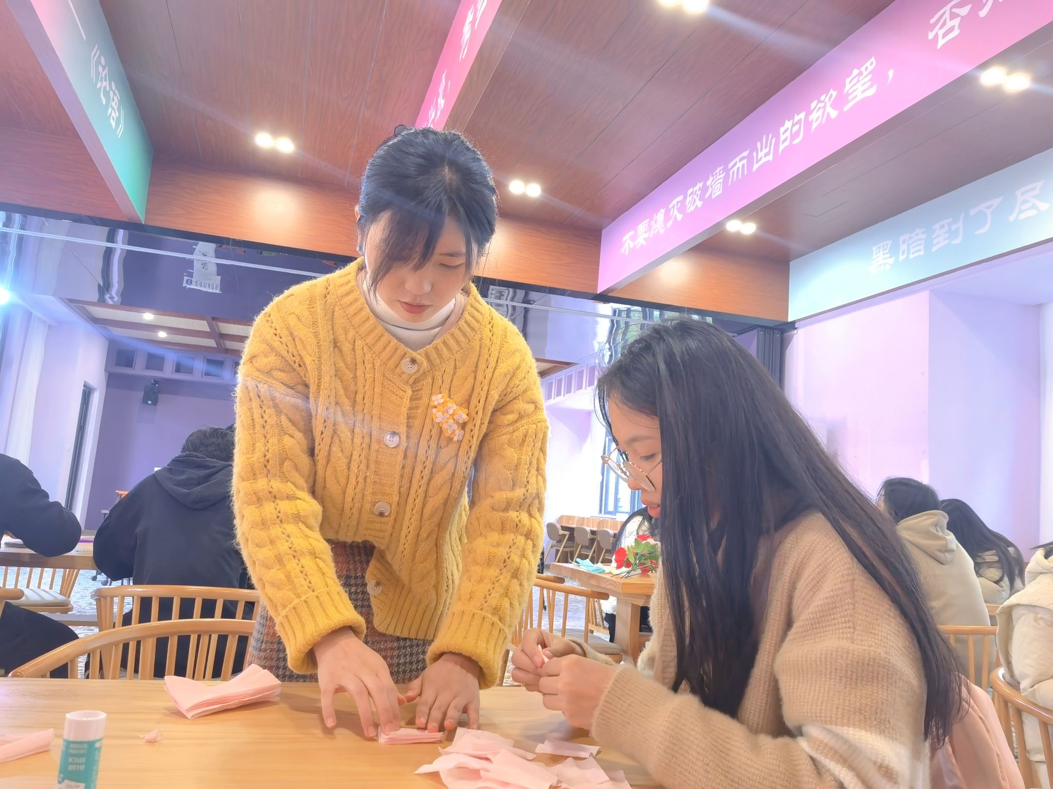 用时间,感受美好的事物。随着活动步骤的推进,学生们的玫瑰花瓣基本捏造完成,到了最重要的花瓣粘贴塑造花型的部分。彭丽珺老师重点强调:“整体花瓣注意高度位置;每片花瓣涂胶水以后一定要捏紧防止后期从花杆脱落;花芯部分紧凑,外围花瓣逐渐舒展;从第四瓣起每片花瓣位置从上一瓣中间位置粘贴;全部花瓣粘贴完成后用花杆卷出花瓣弧度塑造形态”。倾注的心血,花费的时间,付出的劳动,每一朵玫瑰都是独属于自己的美丽。