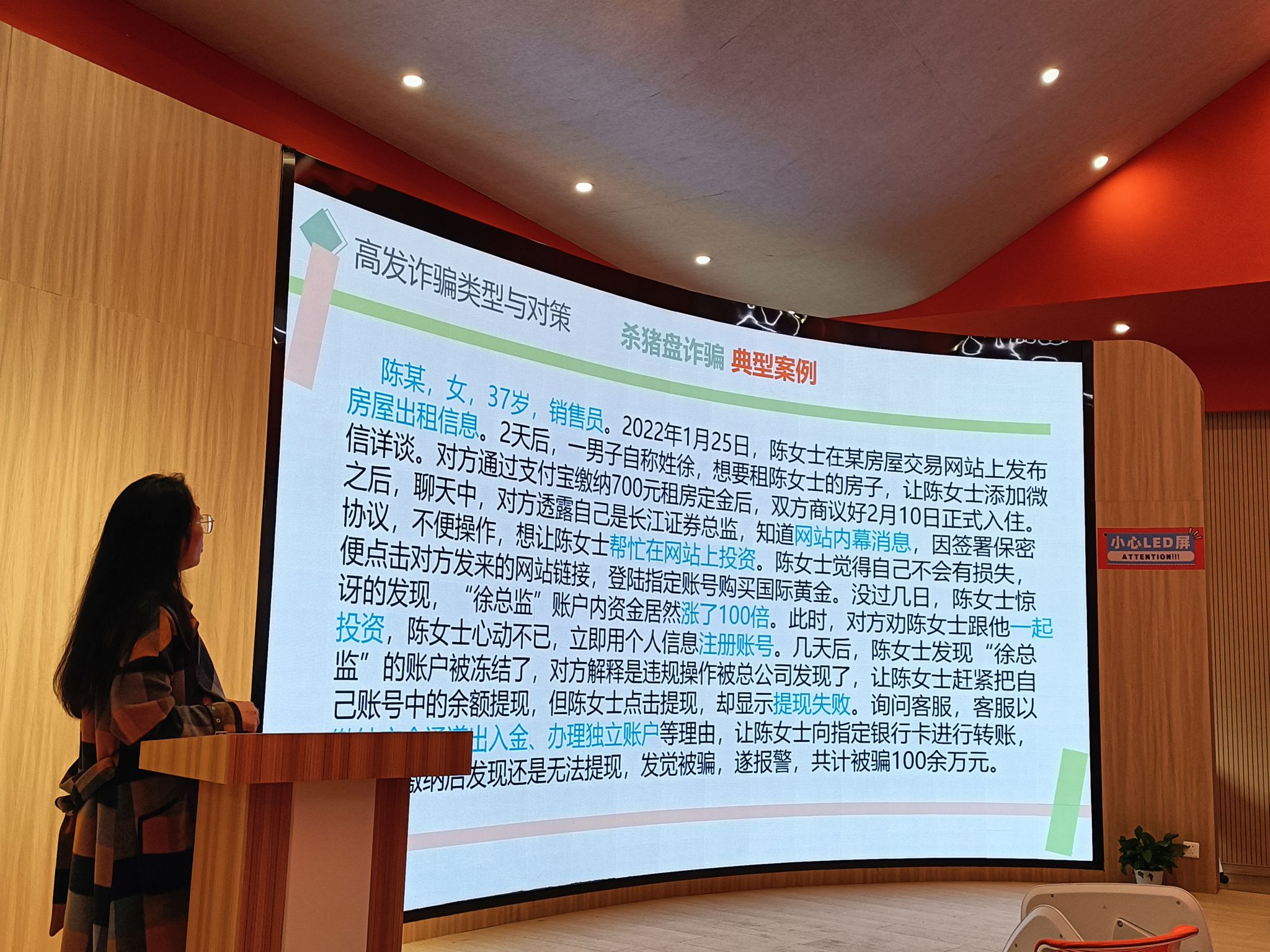 随着信息技术的日益发展,电信诈骗在生活中出现的频率也越来越高,对同学们的安全构成了潜在危险。为了让同学们对电信诈骗有着更加深刻的认识,董老师给同学们展示了几个真实案例,这些案例涉及了冒充公检法工作人员、亲友、客服等常见的诈骗形式。 她强调这些骗子通常是以各种理由要求受害人转账或提供个人信息, 并提醒同学们要时刻保持警惕,不轻信陌生人。