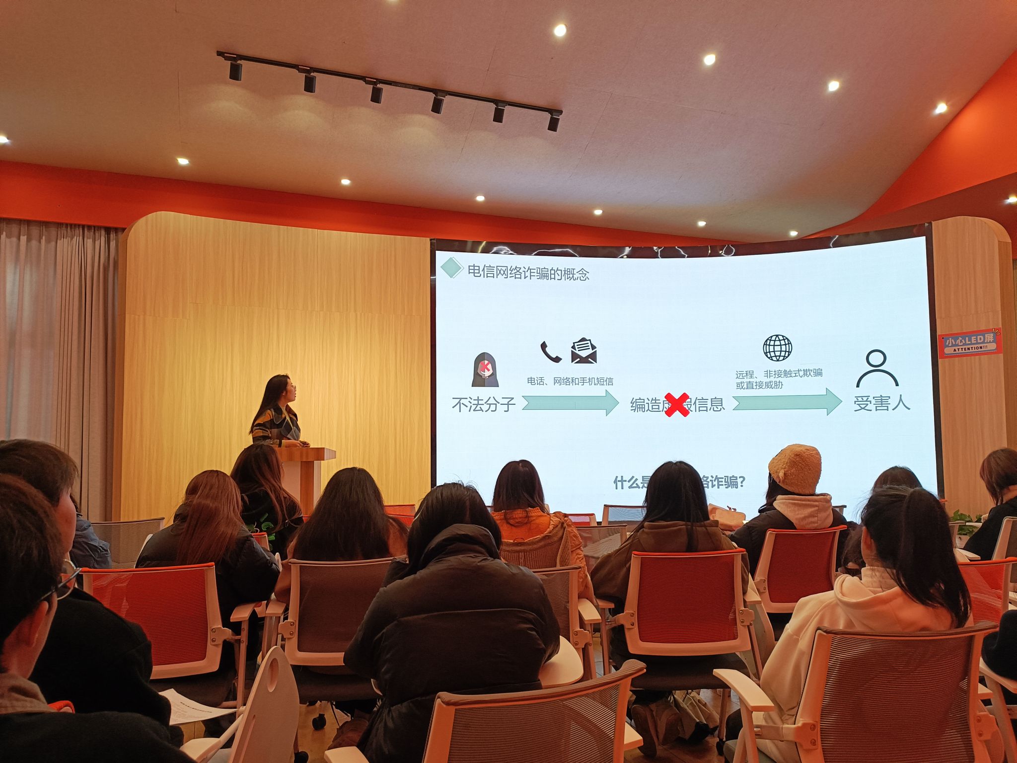 在活动开始阶段,导师首先详细讲解了电信诈骗的概念,通过一幅生动的图片,让同学们深入理解了电信诈骗的含义。同时,她也向同学们阐述了电信诈骗的基本流程以及如何通过仔细辨别来避免受骗。