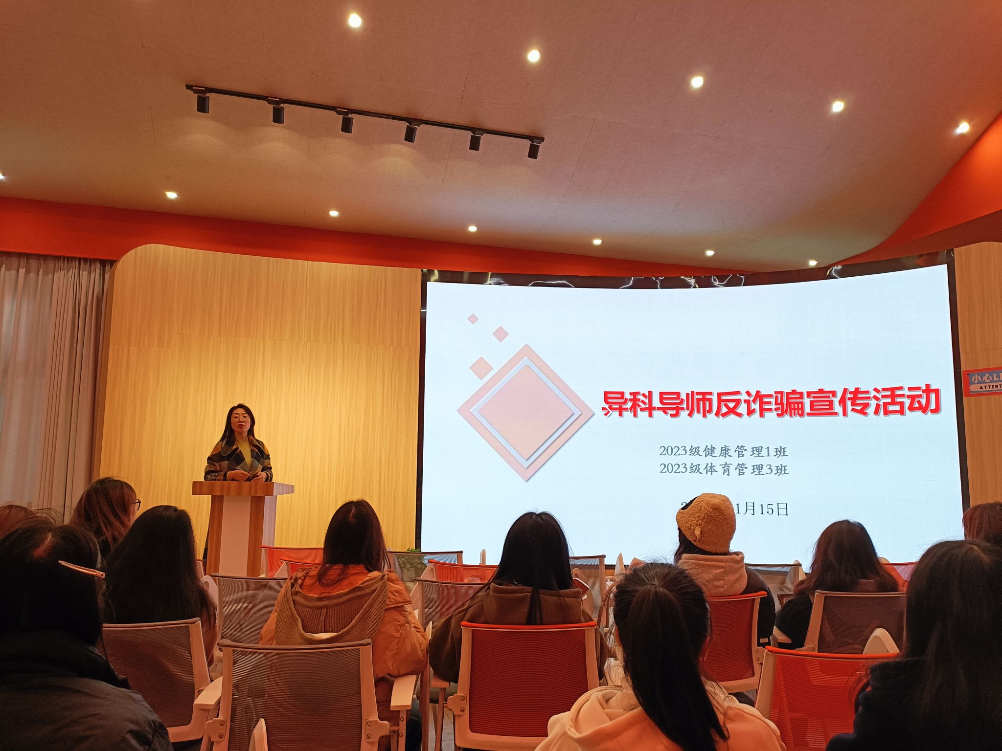 建设和谐大社会,谨从防诈骗做起。为了提高同学们的防诈骗意思,营造和谐安全的校园环境,健管一班和体管三班的异科导师董胜英于11月15日下午在古剑书院含光.报告厅举行了一场防诈骗宣传活动。这次活动旨在提高同学们的防诈骗意识,建设和谐校园。