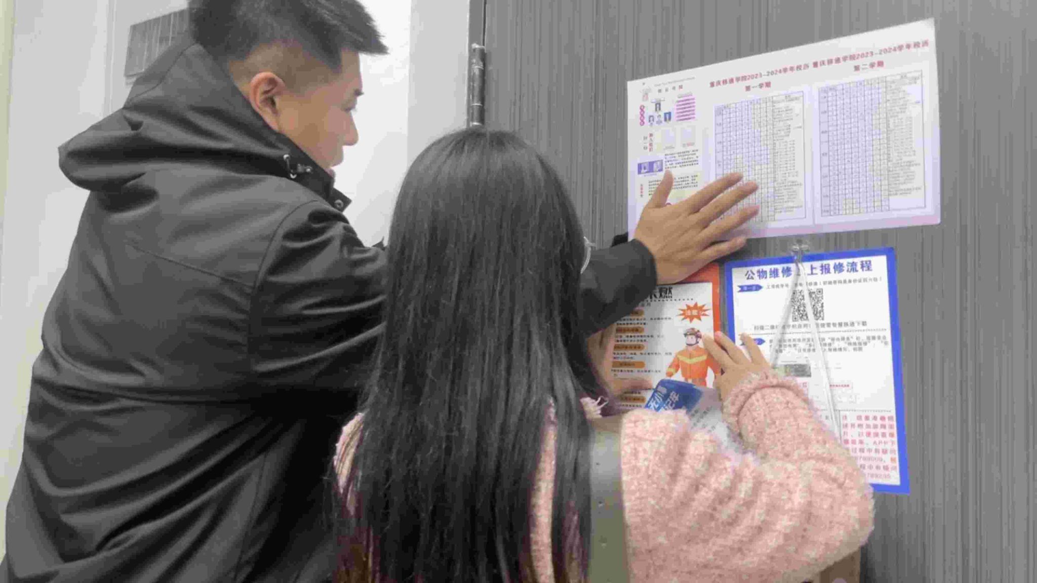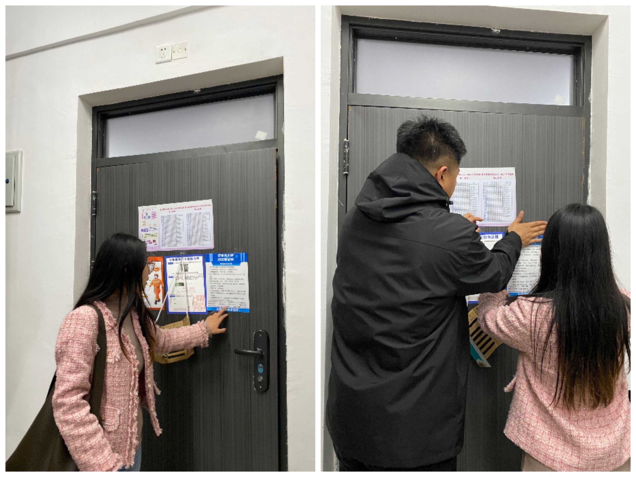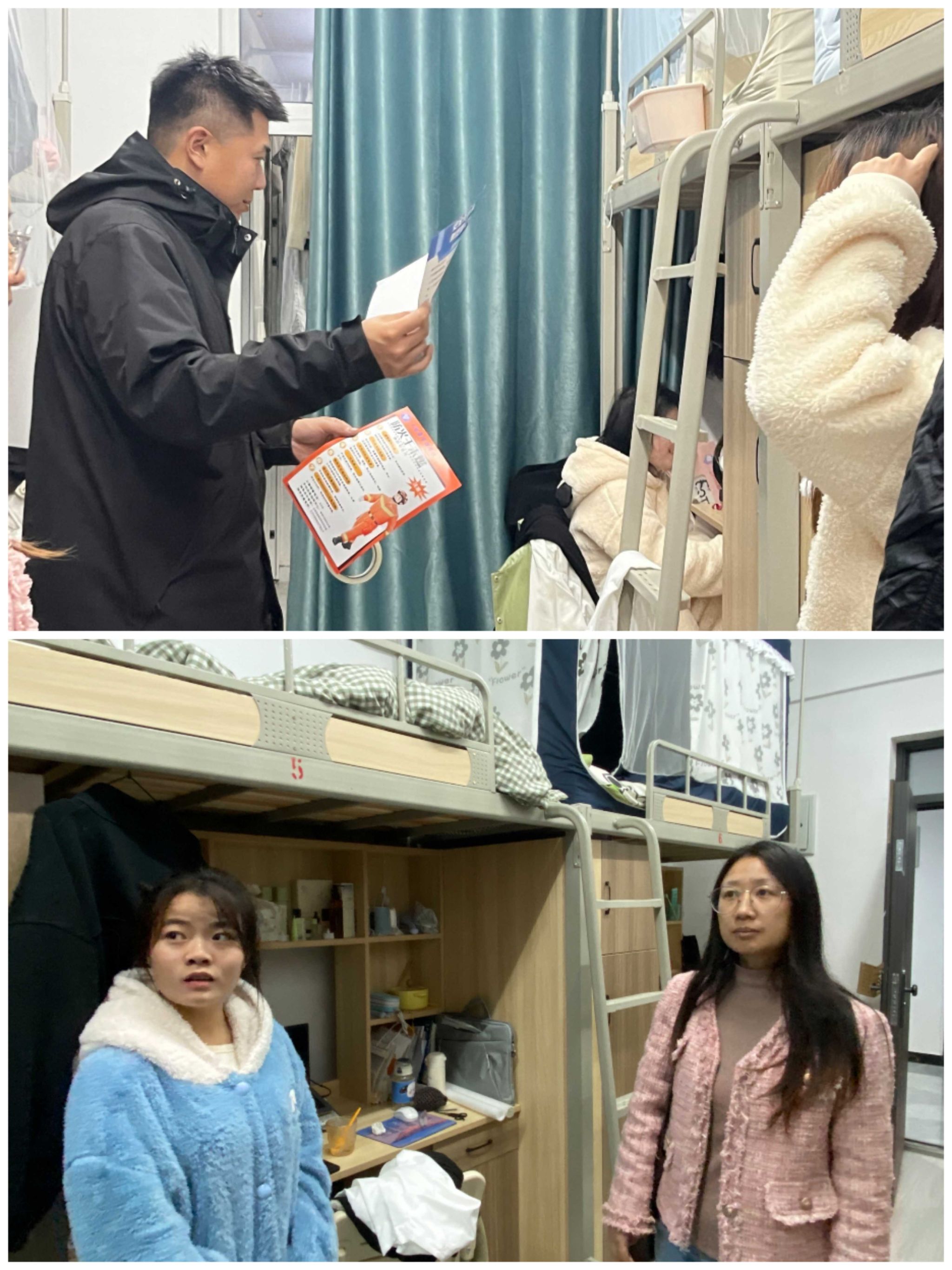 除此之外,孙泽宇老师和童学容老师为每个寝室都粘贴了关于消防安全的宣传册,并对消防安全知识进行普及。提醒同学们不使用热得快、电炒锅、电茶壶、电热毯等大功率危险电器,及时制止周围同学使用类似电器。离开宿舍前,一定要关闭所有电源开关,拔掉所有电源插头。留意宿舍楼内的消防器材放置地点和使用方法,熟悉宿舍楼内的安全通道,以防意外。不要将电源接线板放在床上,电源不要与床架等金属物接触,以防漏电引发事故。不要私接电线,使用的插座、电线等必须符合安全质量标准,电器安装符合有关规范,发现破损要及时更换。如遇火灾,不要贪恋财物,要及时逃离火灾现场,并拨打119火警电话报警。检查途中,两位老师也关注到了最近天气的变化,提醒了各寝室同学,气温降低,注意防寒保暖,预防感冒。在同学们的积极配合下,本次寝室安全卫生检查工作开展顺利。
