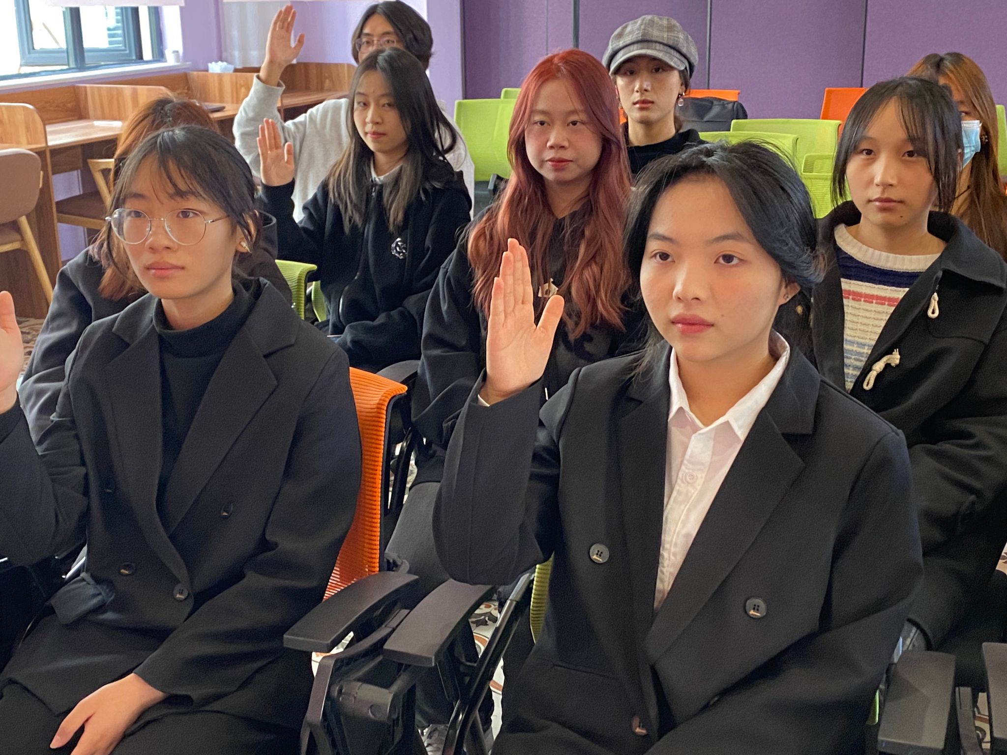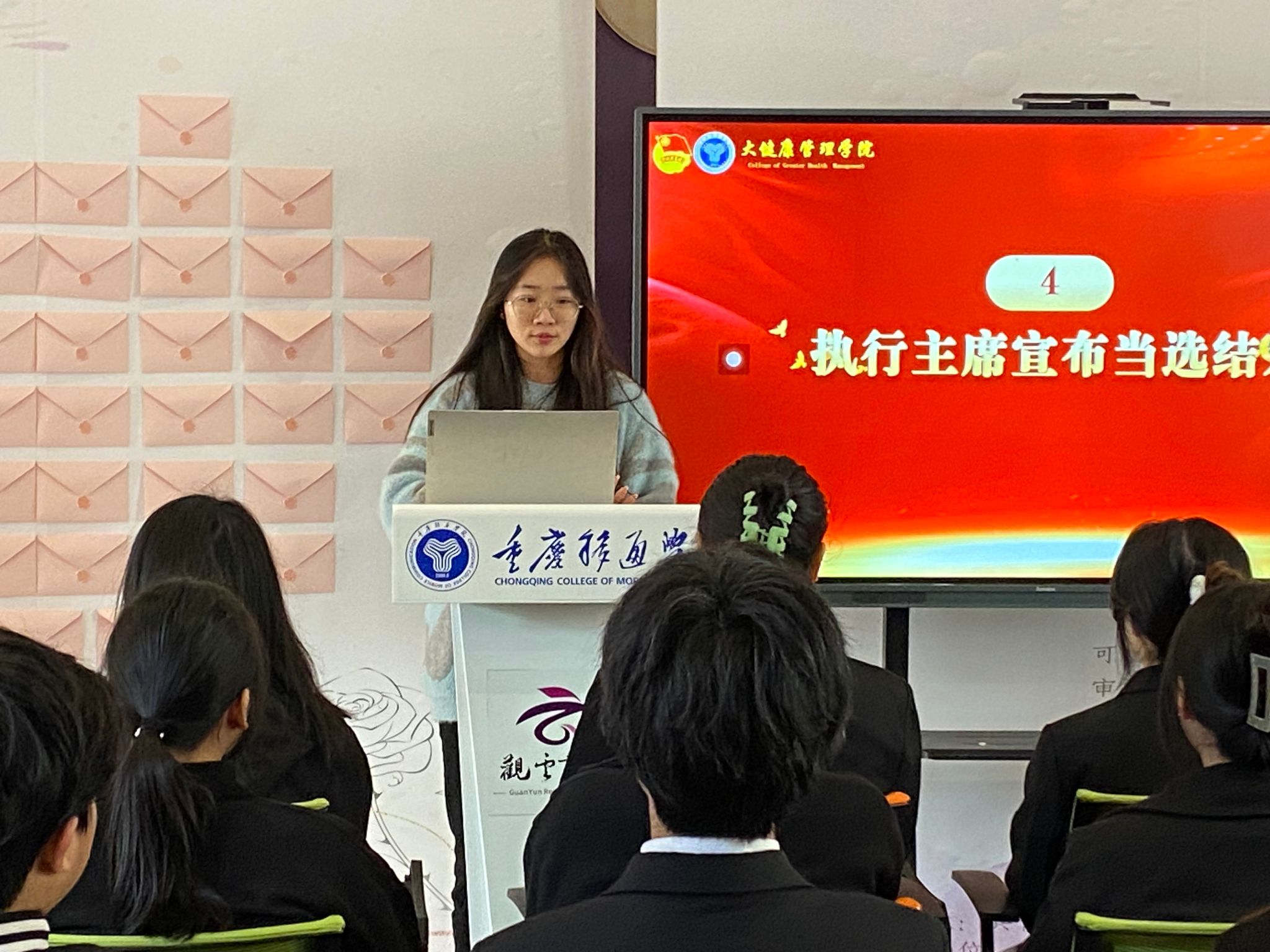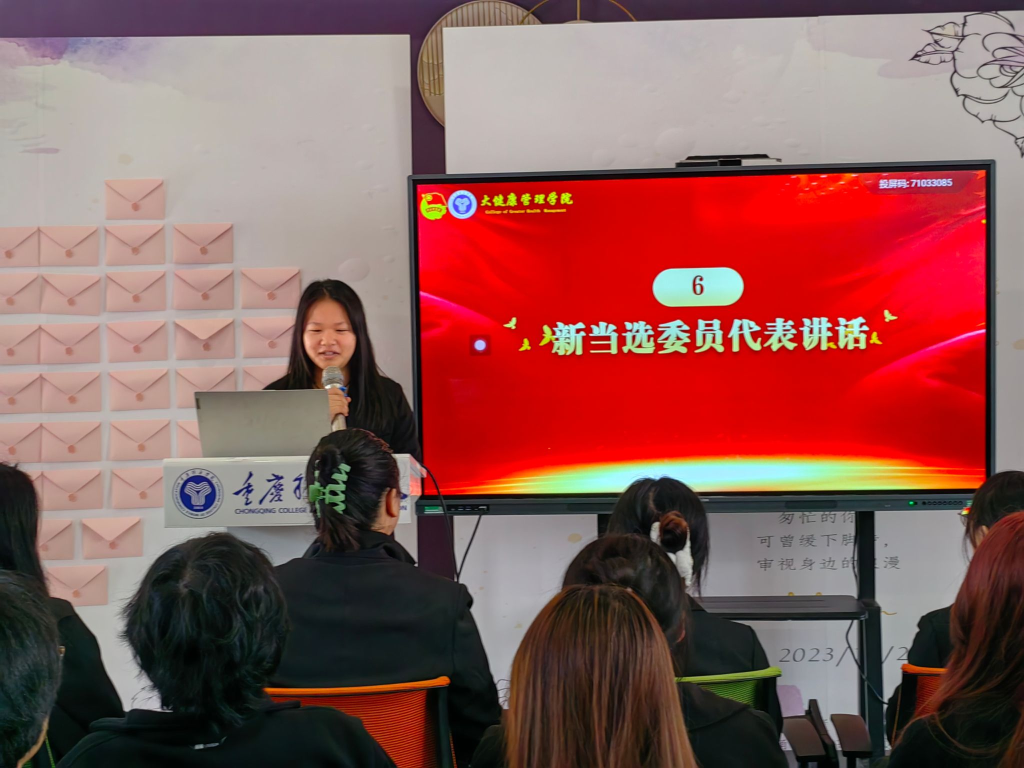 最后,新当选的团支部委员代表周颖上台发言。她表示将以更饱满的热情,更坚定的信念为广大同学服务,努力打造一个充满活力和温馨氛围的大家庭。期望大家用青春作浆、以梦想为帆,以更昂扬的姿态建功新时代。团结协作谋发展,勇于担当共前行。有了孙老师的鼓励、周颖的号召和共青团员们的勇于担当,相信功能型团支部一定会蓬勃发展。