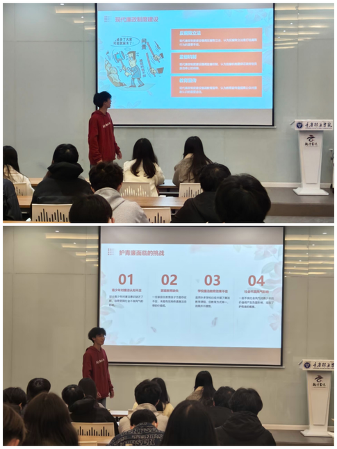 崇尚廉洁美德,培育廉洁文化。清廉的理论基础在马克思主义廉政思想中体现的淋漓尽致,其中最为重要的便是人民的利益,廉政思想强调人民利益至上,为人民服务。而反对官僚主义和政治清明也是我们青年需要牢记和倡导的。接着,体管二班团支书唐学如为同学们讲解了关于青廉的事例。就青年而言,中国传统廉洁文化是我们需要崇尚并去倡导的,无论是道德对人的内在力量和最高追求,还是对法律的尊重,无不体现了廉洁是人的美德和最高追求。在现代廉政制度建设中,通过反腐败立法、监督机制等措施进行保障,而教育宣传是提高公众对廉洁认识的重要途径。弘扬廉洁美德,树立勤廉榜样,倡导廉洁文化,培育守廉风气。