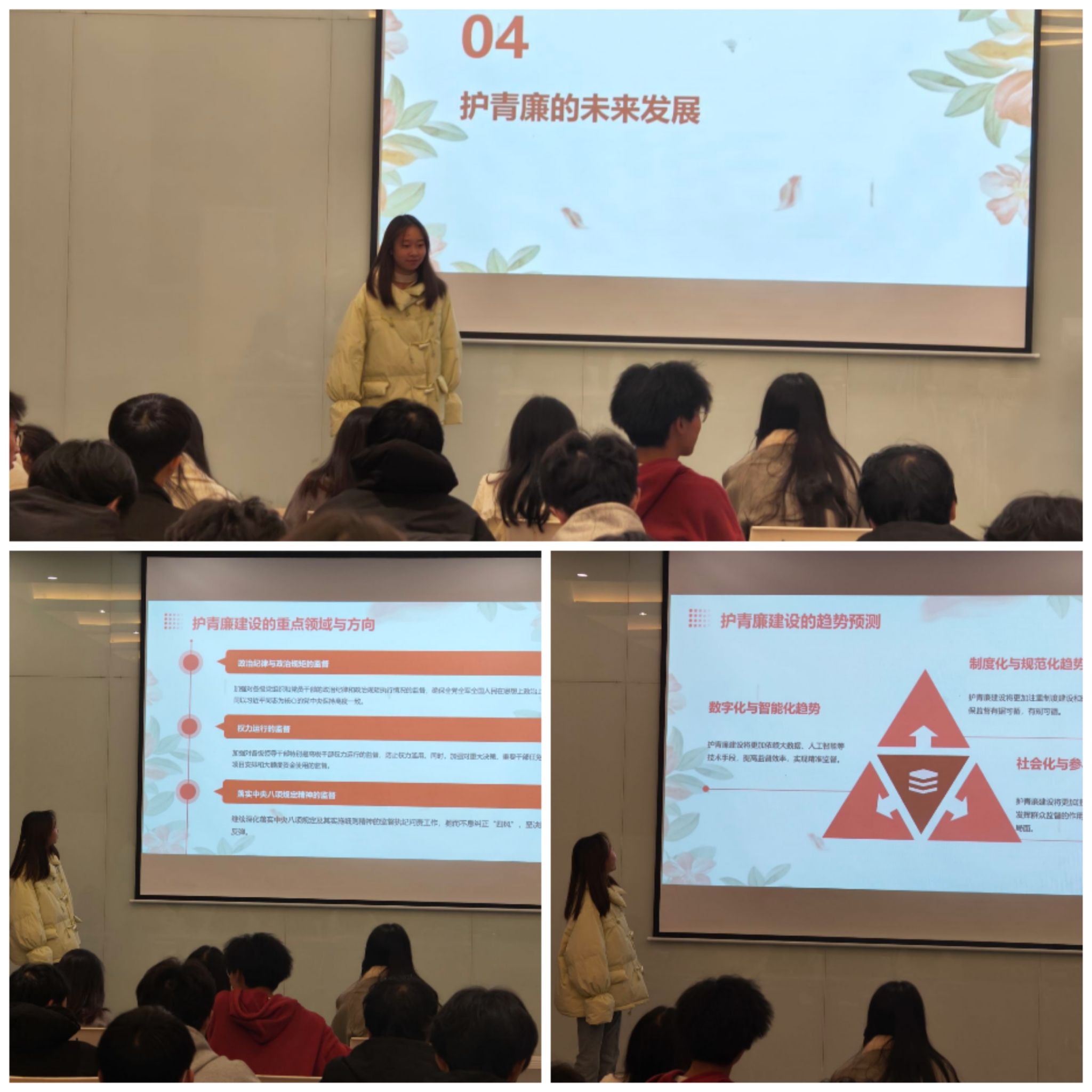 团课最后,就护“青”廉建设的重点领域以及未来发展方向展望,制度建设将逐步完善,教育培训也逐渐加强,监督力度也会逐一强化。这带给同学们的不仅仅是制度层面的自信和光荣感,更多的是对自身的约束和责任感,增强了光大团员和群众的护廉之心和“青”廉意识,愿同学们可以不忘初心,愿青年干部们可以牢记使命。以廉洁之心,护“青”廉之风。