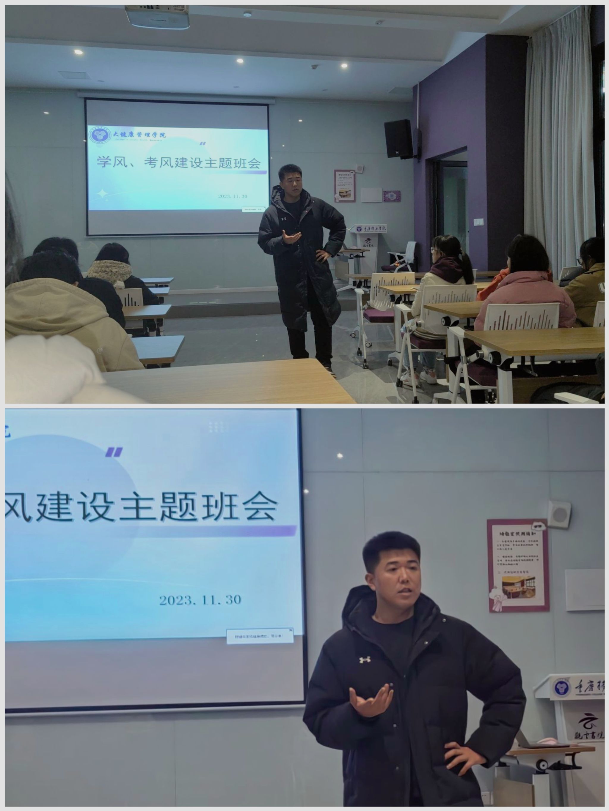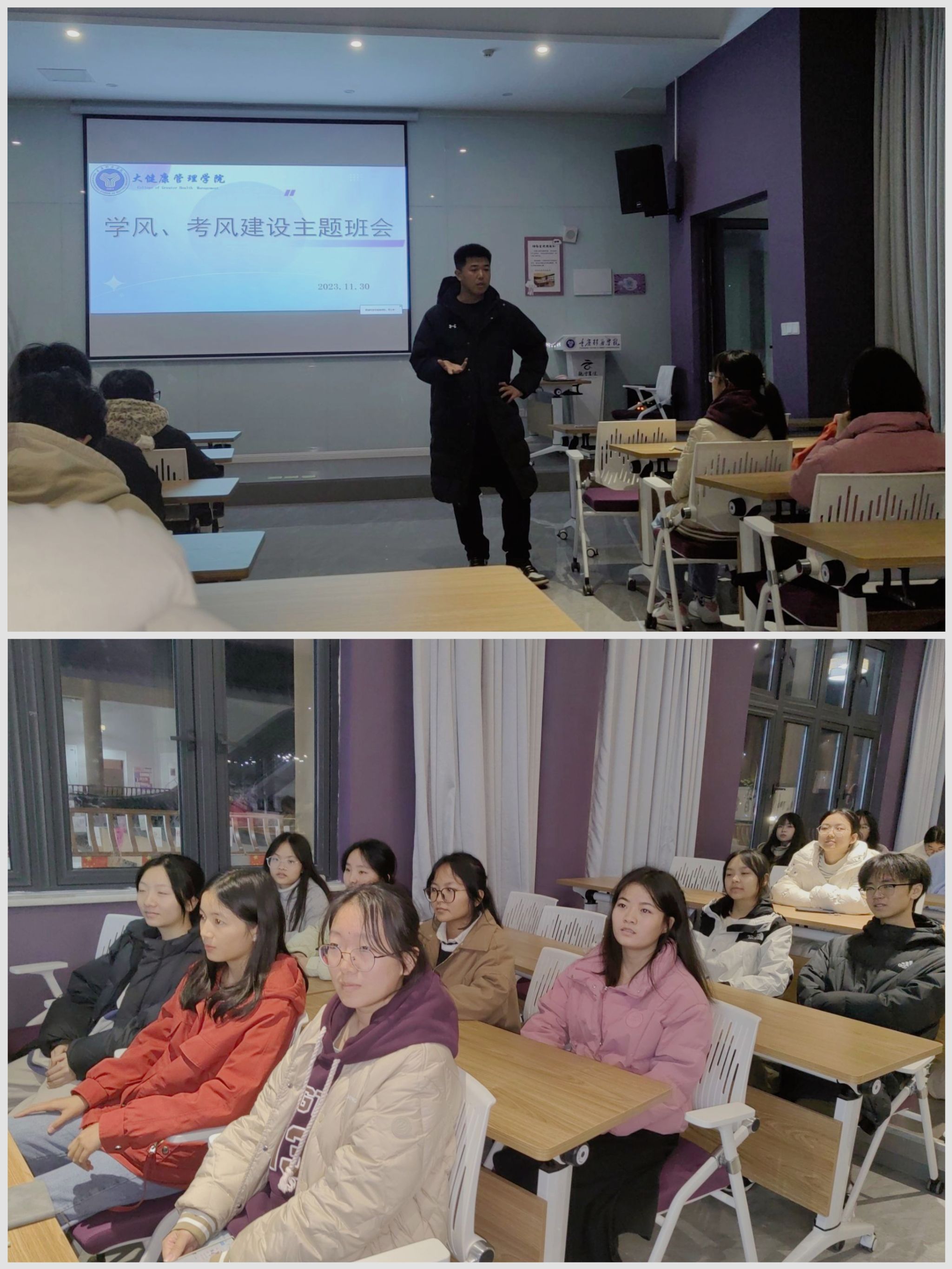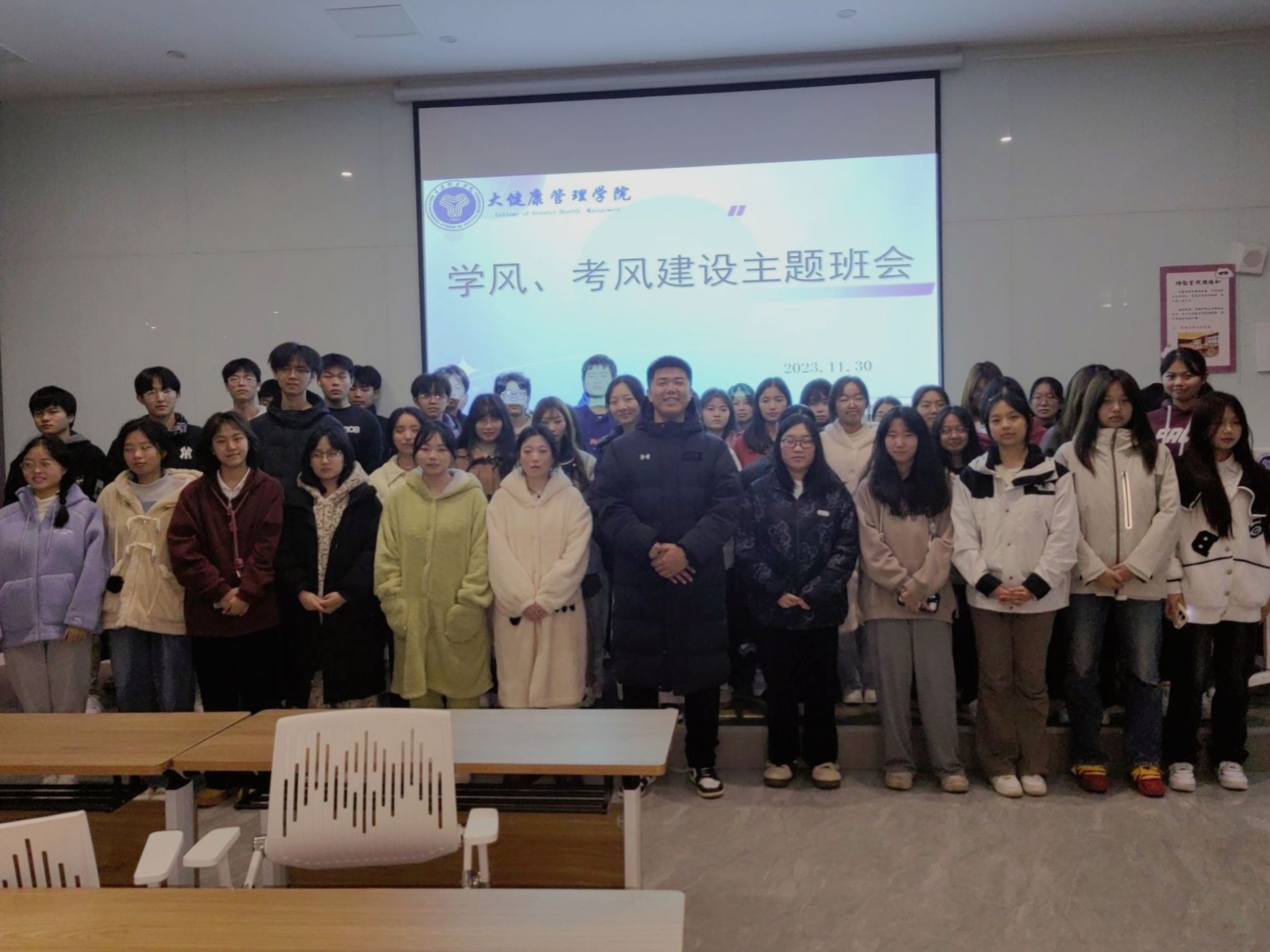 为切实抓好我院学风考风建设,引导学生养成良好的学习习惯,加强考风考纪教育,提高学习积极性和主动性,促进良好班风、学风、考风、校风的形成,营造健康向上、奋发有为、力争上游的学习氛围,2023年12月5日大健康管理学院2023级健康服务与管理专业1—2班于观云书院冬至·多媒体教室召开“学风考风建设主题班会”。此次班会由辅导员孙泽宇主持,健康服务与管理专业1、2班的全体学生共同参与。