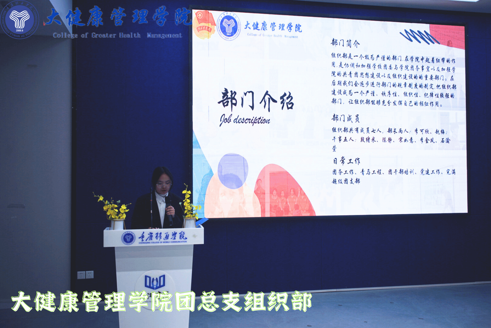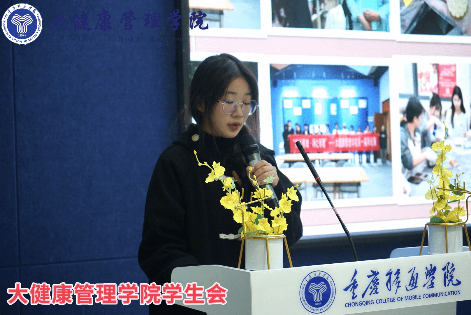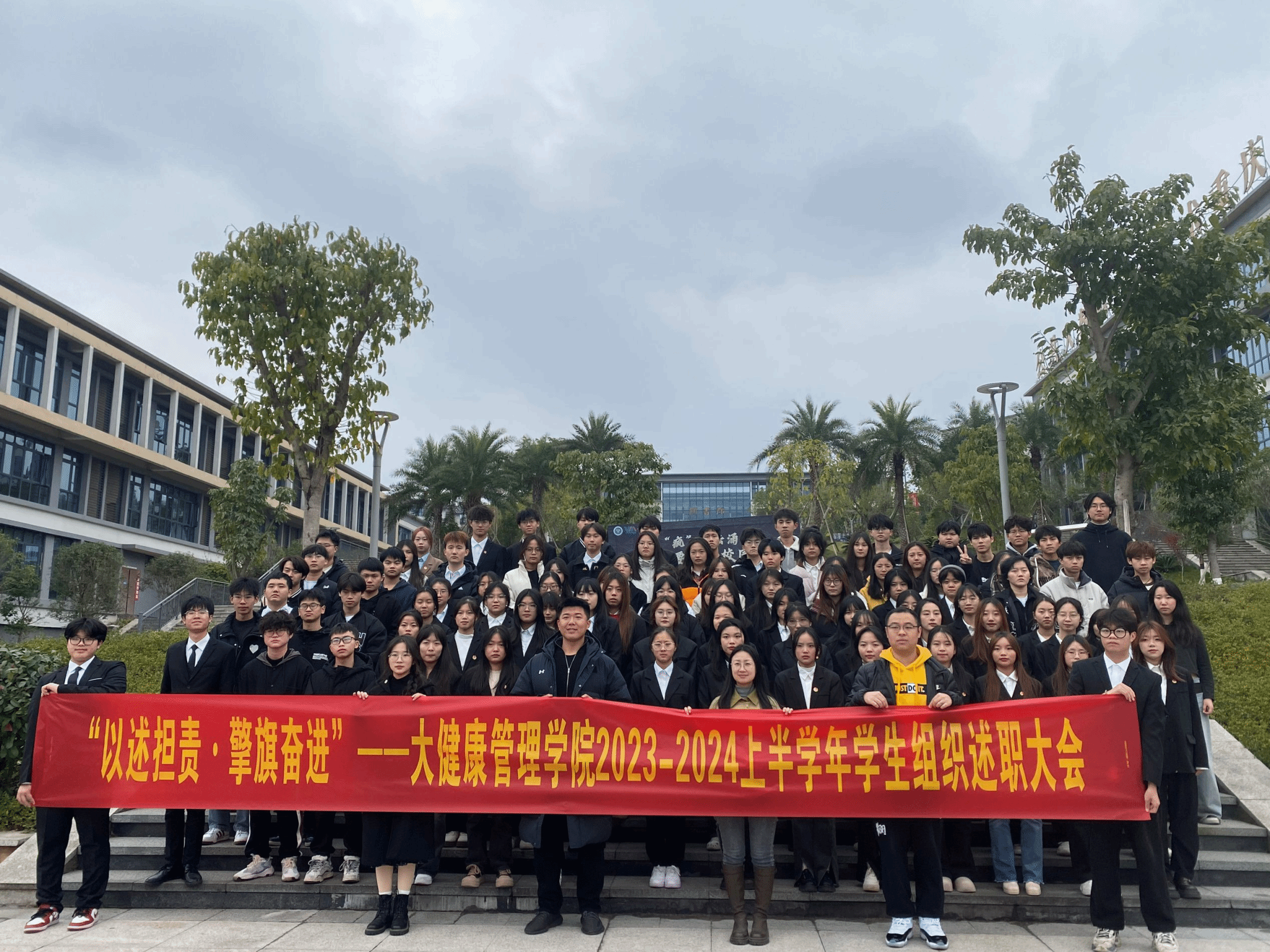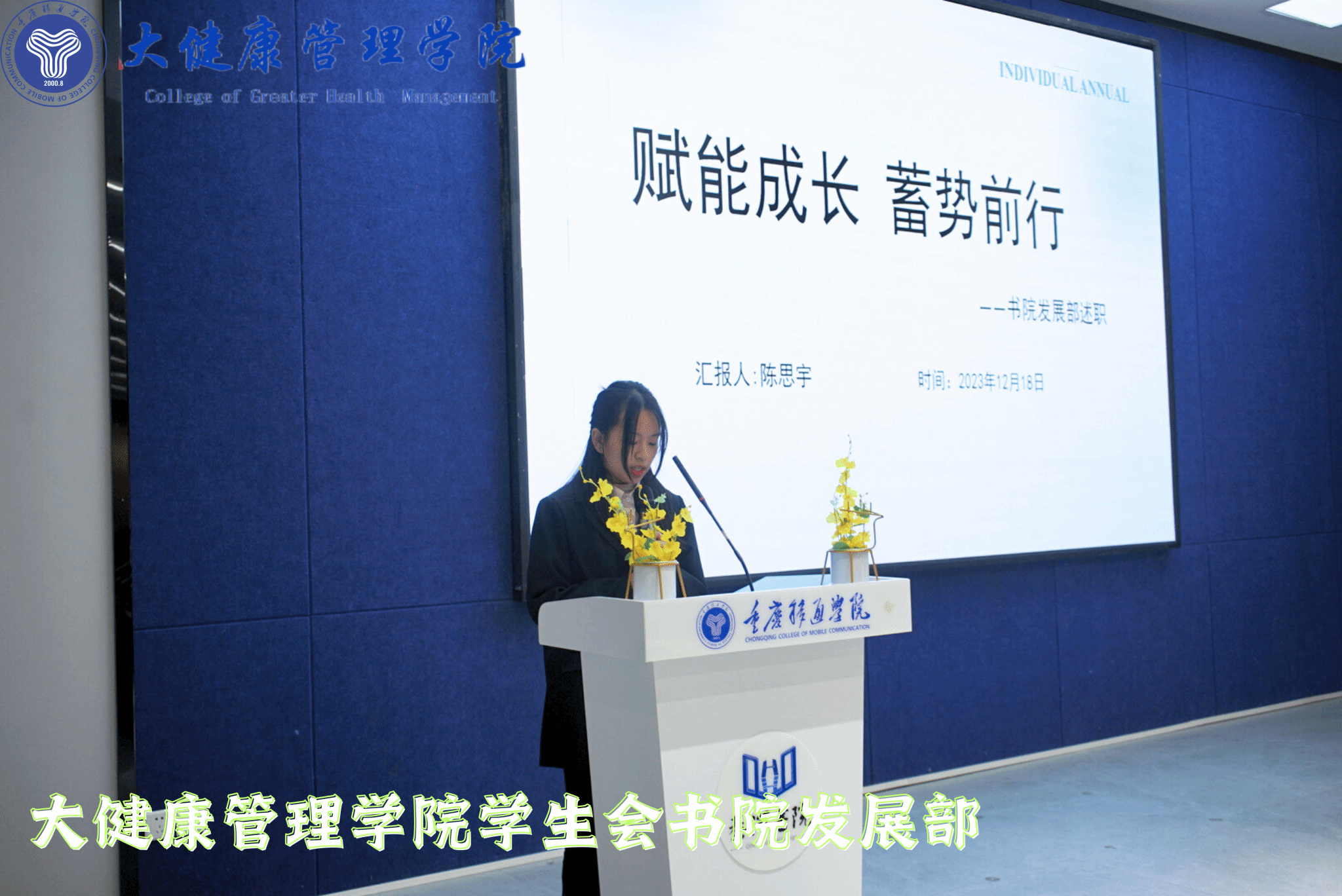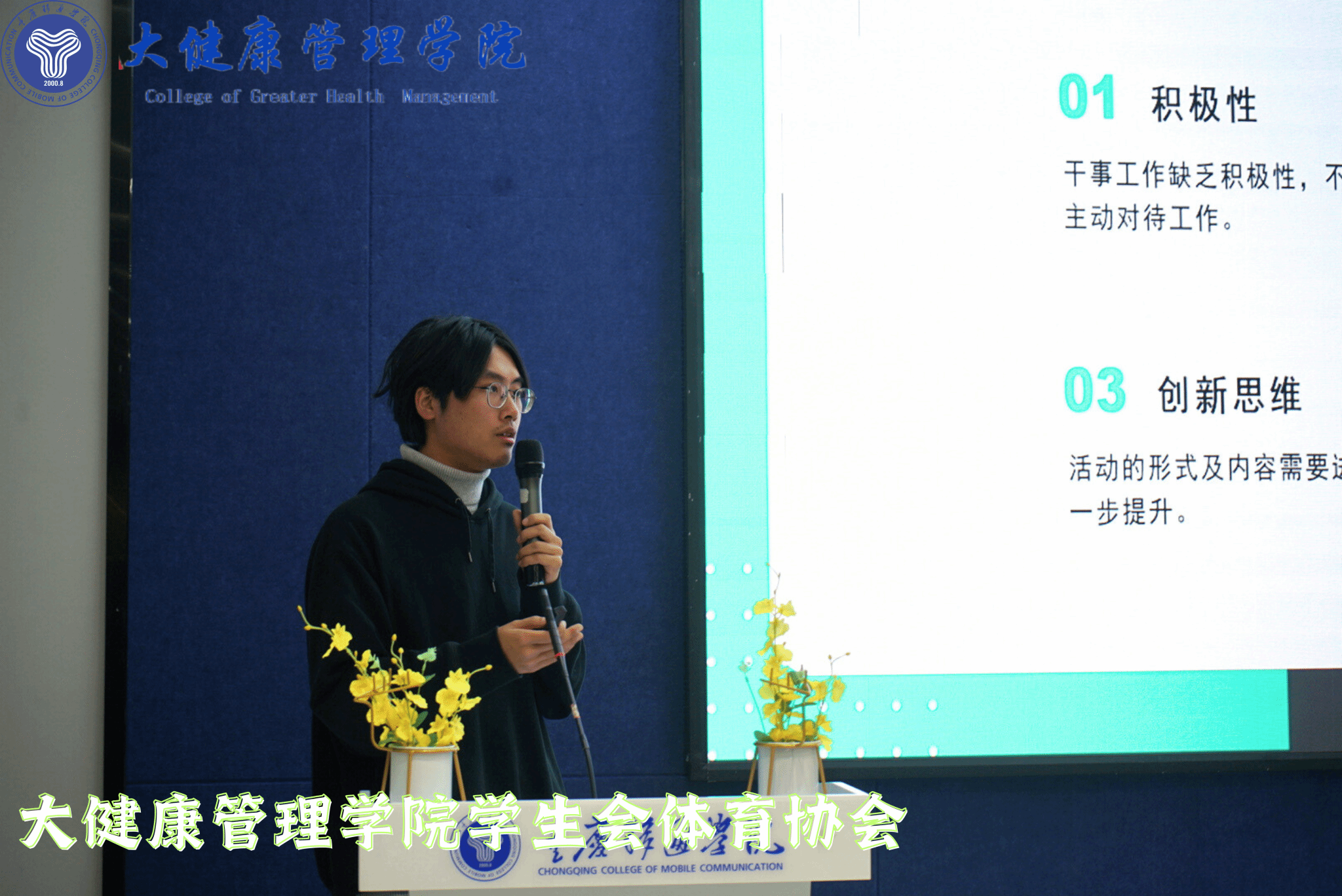时光转瞬即逝,回顾过去,这一学期中思考亦多,感慨亦多,收获亦多。在学期结束之际,大健康管理学院于2023年12月18日在綦河书院2号楼观涛多功能室举行本学期学生组织述职大会。本次述职大会不仅仅是回顾本学期工作内容,总结工作经验,更能让各部门在未来工作中继续注重团队协作,共同探索解决问题的最优解,提高工作效率和质量。此次述职大会邀请到大健康管理学院学工办主任童学容老师,竞技体育与艺术修养板块指导老师孙泽宇老师。