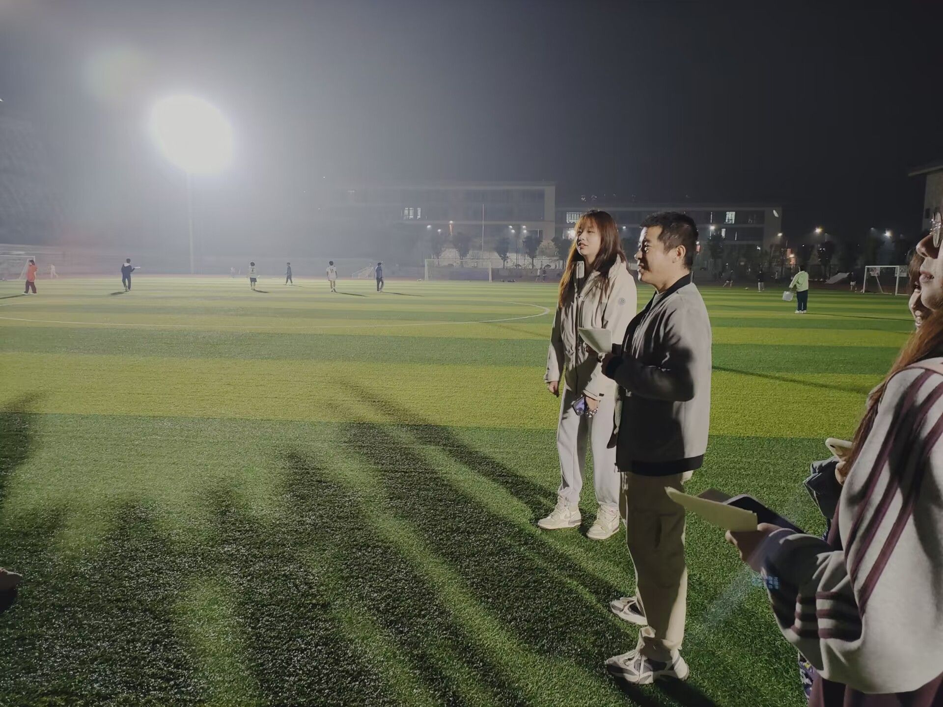 晚上师生们相聚在操场,虽然天公不作美,可是大家心依旧热烈,什么都无法阻止灵魂的共鸣。游戏项目丰富多样,包括你比划我来猜、团队接力顺口溜、听前奏猜歌名。在享受游戏的同时锻炼团队协作、沟通技巧。同学们分成两个队伍以积分制比拼,获胜队伍有丰厚的奖品,就算遗憾与冠军失之交臂也有可爱的参与奖。你比划我来猜的环节,比划的同学生动形象的表演和队友心照不宣的默契引得大家放声大笑,顺口溜接力更是考验大家的普通话水平,但是这也需要小组默契配合,共同努力才会制胜。猜歌名环节大家都很期待,但是凭前奏可不那么容易哦,每个人的歌单都可能截然不同,所以更需要大家齐心协力。