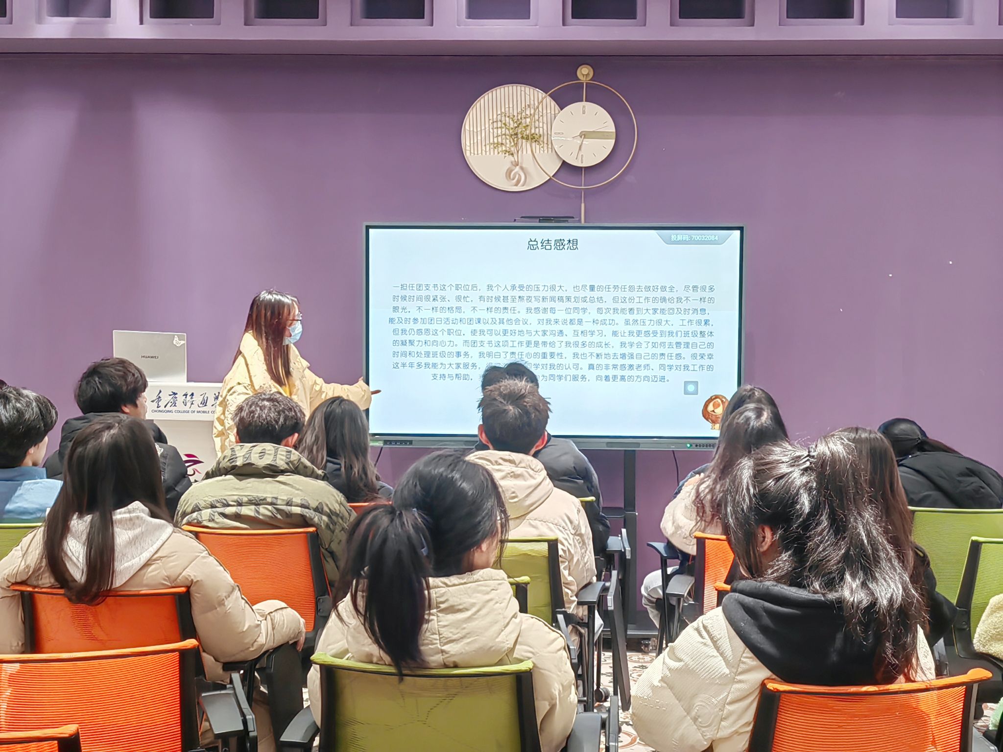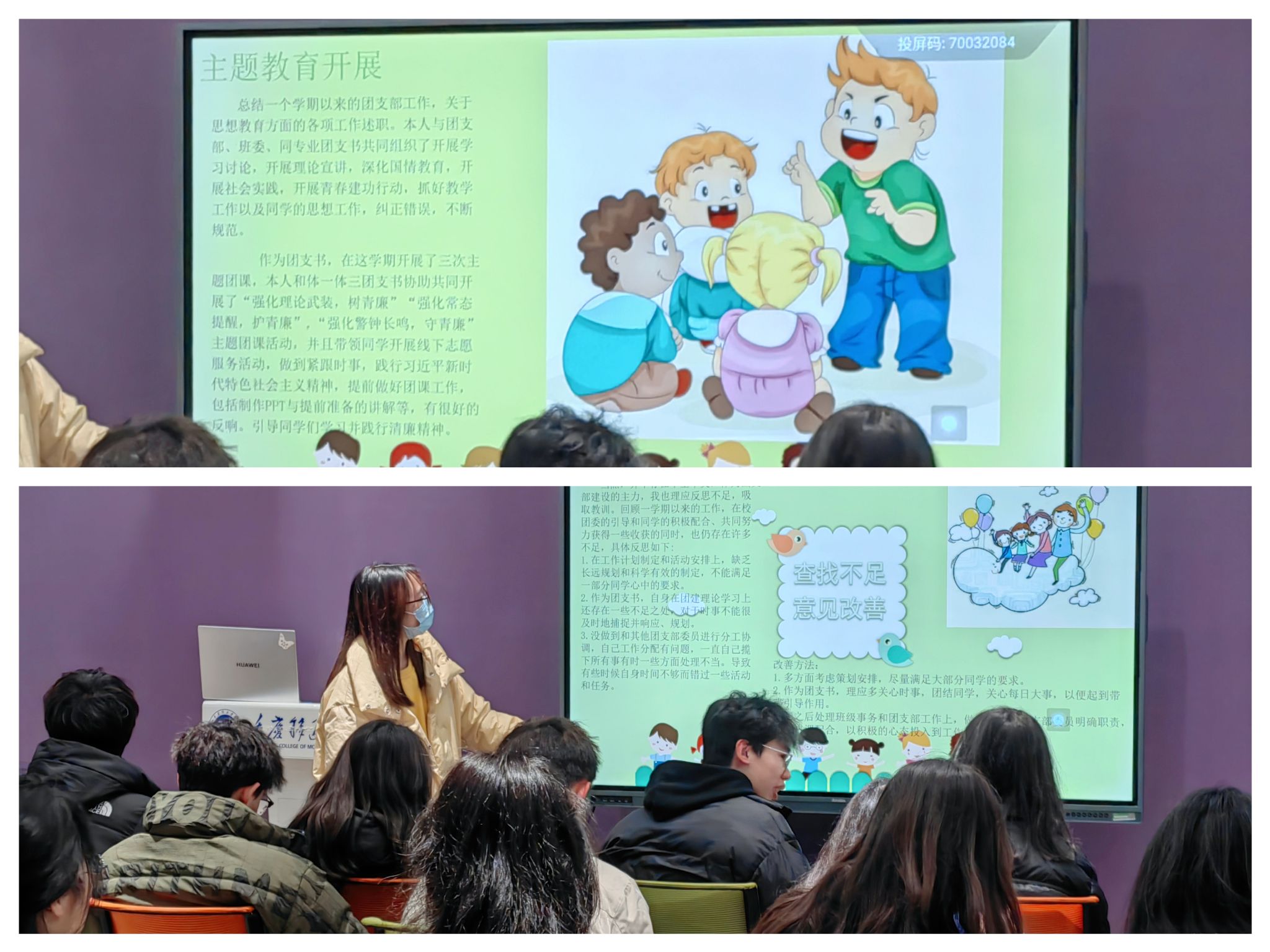 活动开始,团支部书记唐雪如为同学们总结了这一学期开展的理论宣讲、深化国情教育、开展社会实践、开展青春建功行动等活动。做好同学的思想工作,纠正错误,不断规范。并且带领同学开展线下志愿服务活动,做到紧跟时事,践行习近平新时代中国特色社会主义精神。引导同学们学习并践行清廉精神。同时谈到一些不足,如:在工作计划制定和活动安排上,缺乏长远规划和科学有效的制定。并且指出改正方,如:多方面考虑策划安排等。