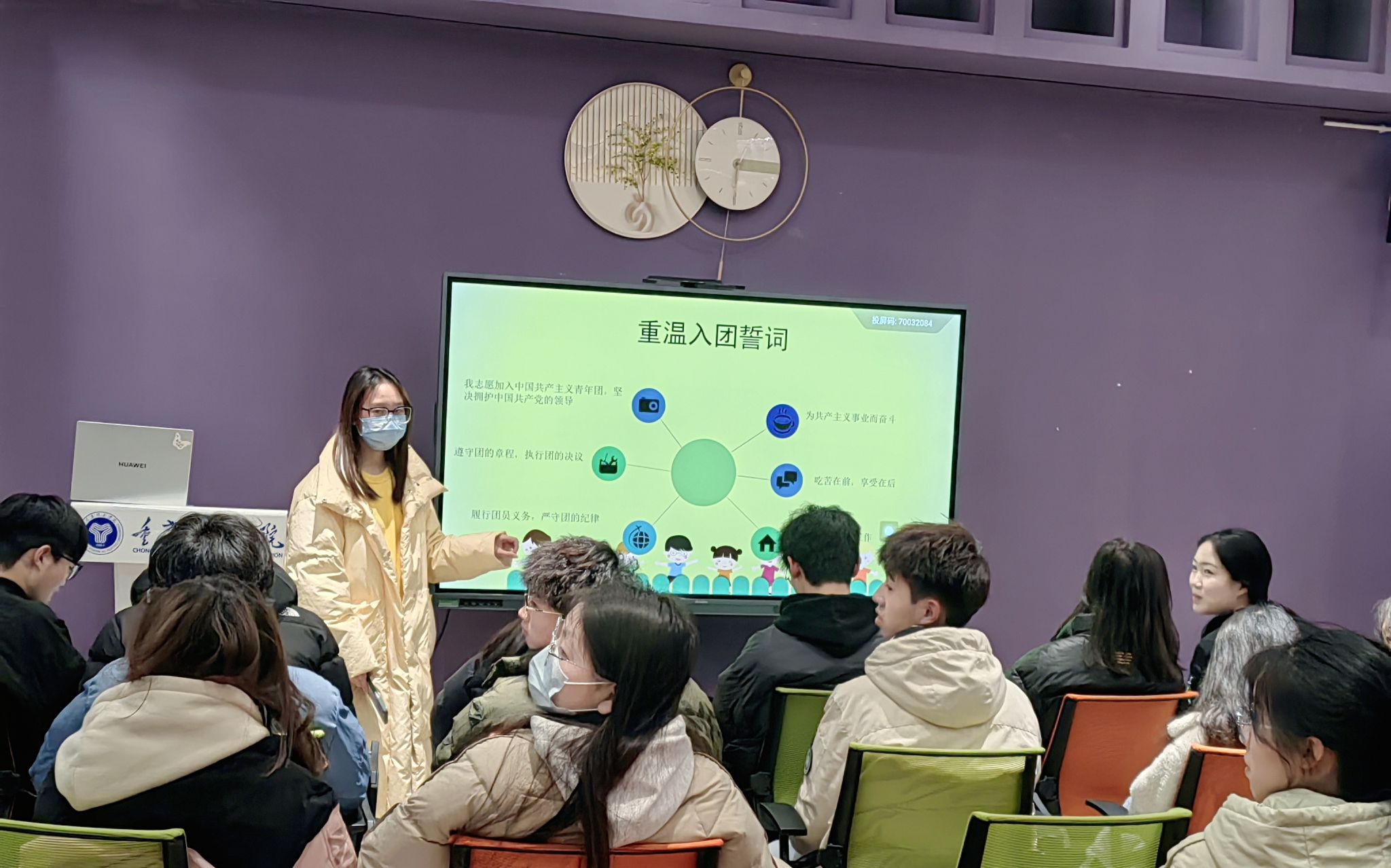 最后,在团支书唐雪如的带领下重温了入团誓词,唤起了每一位共青团员的团员意识,并时刻牢记自己的使命,自觉加强组织性、纪律性,进一步加强我们支部的向心力与战斗力。无论是当年入团宣誓还是现在重温誓词,虽只是一种形式,但有一点是共同的,那就是所立下的誓言,它曾经让我们热血沸腾,充满理想,感召我们努力实践,自觉奉献,激励我们不断进取,奋斗终身。重温的意义在于与时俱进,在于恪守承诺。作为一个共青团员,一定要保持奋斗不息的精神,坚定自己的理想信念,忠实践行自己的入团誓词。