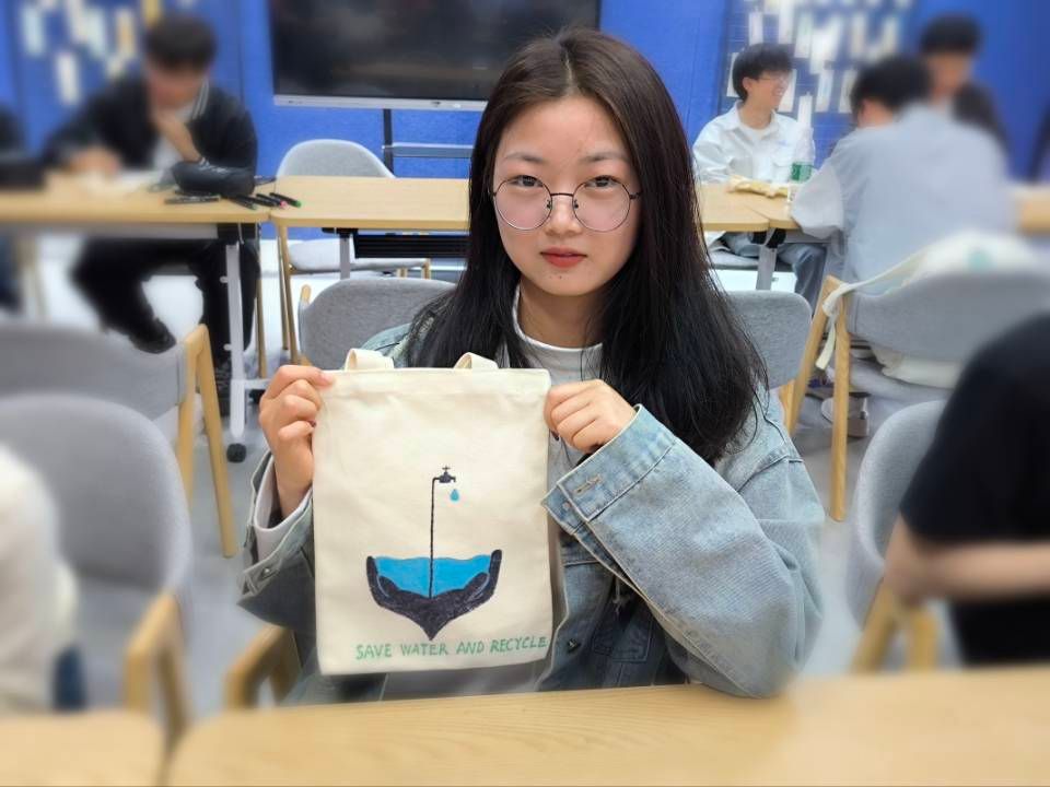 活动开始,同学们会以两人为一组的方式,领取志愿者为他们准备的白色帆布袋,纸杯及其他工具,现场作画。“漾漾浮轻波,悠悠汇远浦。”同学们以心中所想,绘画山河。在过程中沉浸式体验,走入水的世界,感受水的清澈,透亮,灵动与柔美。这让同学们深刻的体会到水的重要性。自觉爱护水源,传承保护水资源的美德。让我们将灰色的水源绘画成一幅充满绚烂色彩的画卷。