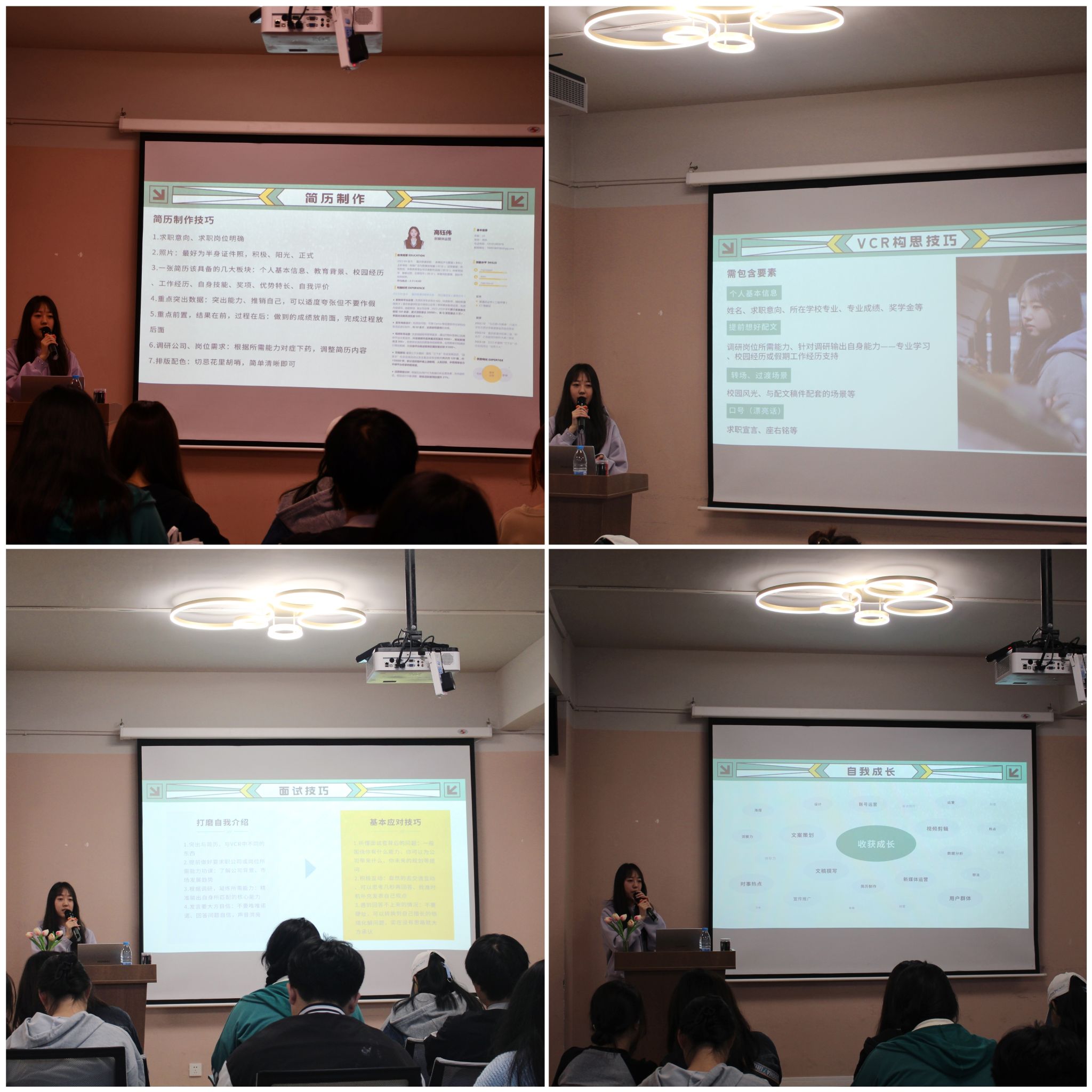 “面试如战,心酸漂泊。”活动伊始,由主持人张艺欣介绍本次活动嘉宾——高钰伟同学。高钰伟同学分别从简历制作、VCR构思技巧、面试技巧、自我成长等几方面展开讲解。只要有志向就会有事业,只要有本事就会有舞台。任何职业都不会埋没人才,也不会束缚人的创造力,关键在于对待职业的态度。选择职业,首先要了解社会的需求,这是每个人择业的基本出发点。这就要求大学生在面试时切实调研、做好准备工作。