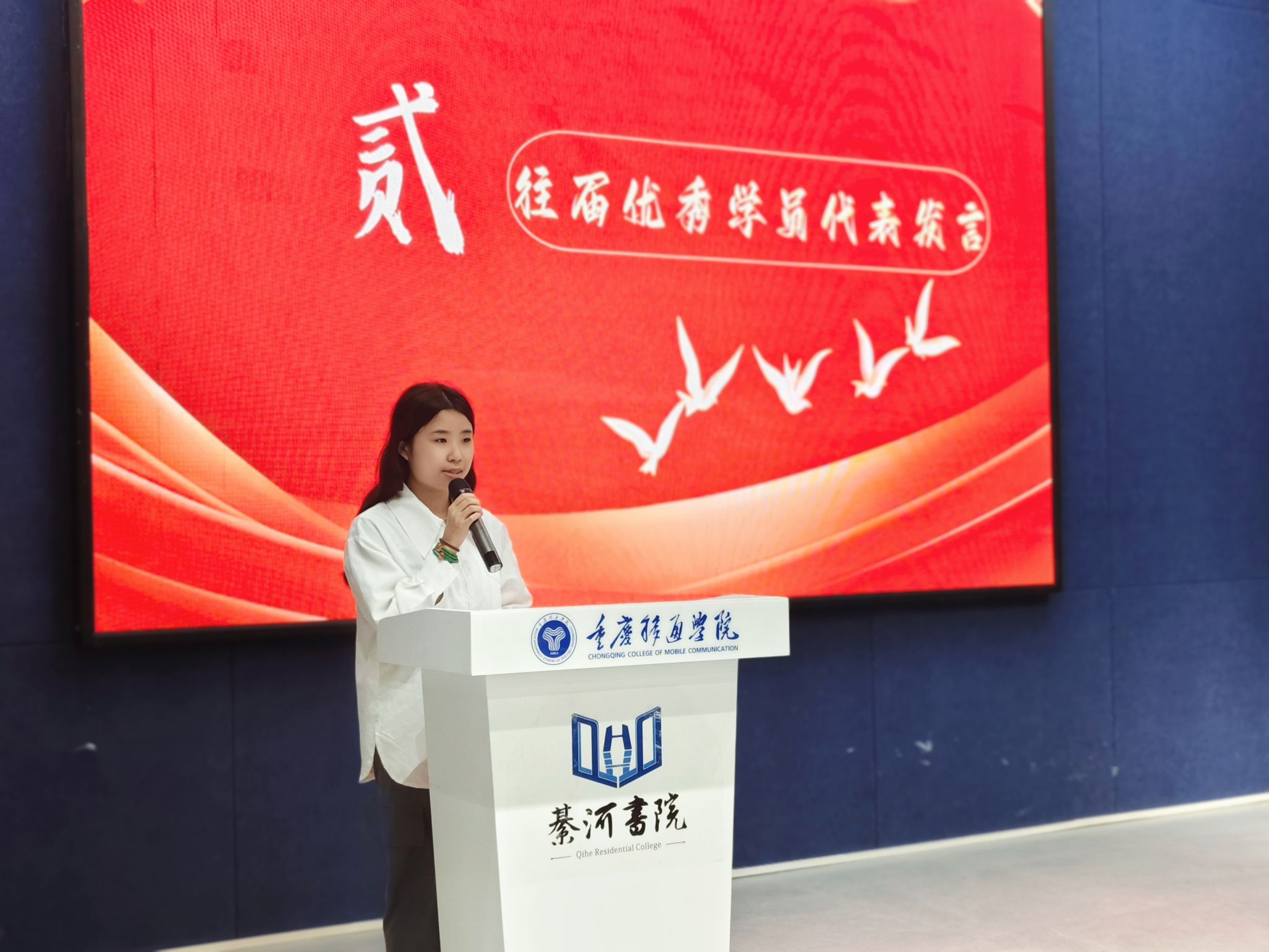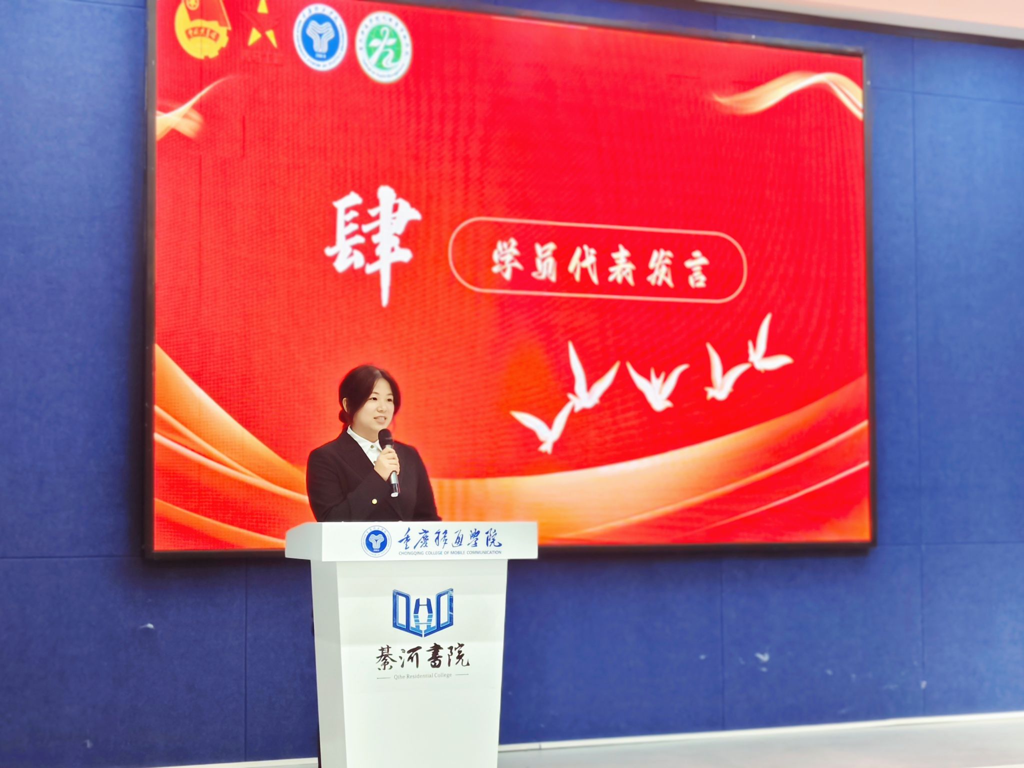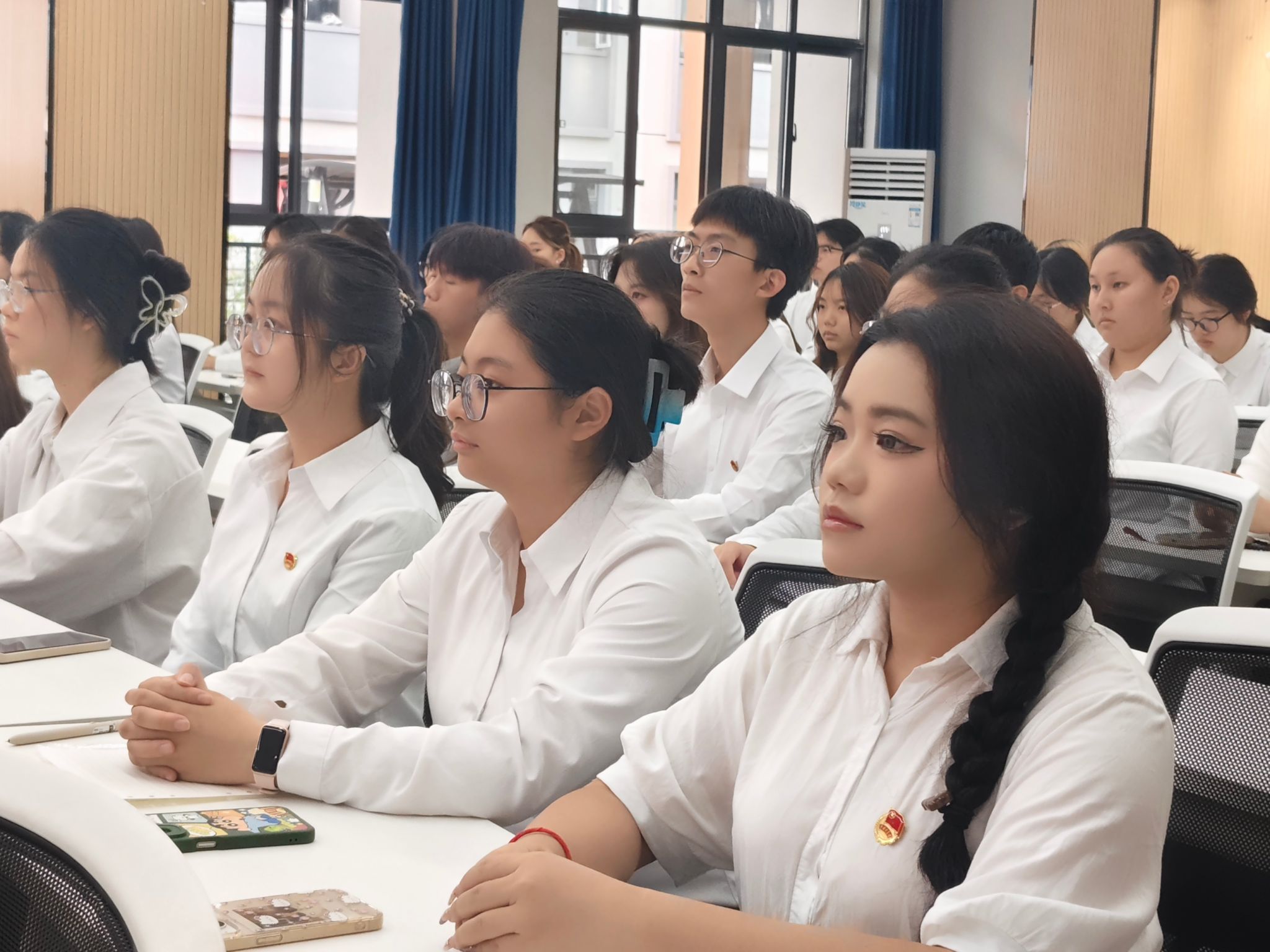 生而逢盛世,青年当有为。活动伊始,全体师生起立,奏唱团歌,激昂的旋律在现场回荡。它提醒着每一位学员,作为新时代的青年,要肩负起国家和民族的重任,应展现出青年学子的蓬勃朝气和坚定信念。随后,往届优秀学员代表许湘诗语发言,她以自己的亲身经历和成长故事,向新学员们传授了宝贵的学习经验,激励着新一届学员们勇往直前。予青春以梦想,一往无前,不掩光芒。她的发言引起学员们的强烈共鸣,她的经历与感悟为新一届学员们树立了榜样,也让大家更加深刻地认识到“青马工程”的重要意义。