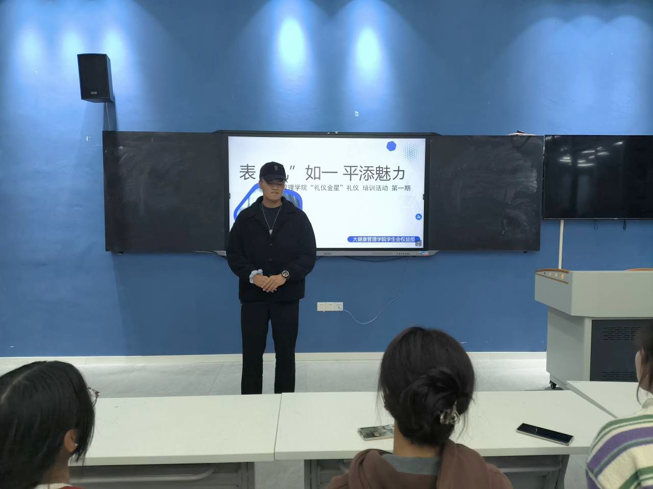 中国被称为礼仪之邦,在现代社会,礼仪修养几乎成为一个人和一个社会文明程度的标志。优雅的行为举止,得体的仪态和言语,真挚的情感和规范的礼仪,构建人与人之间沟通的桥梁,其力量和价值都是无可比拟的。因此培养一支礼仪小队,在进行服务和活动时代表大健康管理学院展示其良好的礼仪,有助于提高我们学院的形象。所以在草长莺飞的三月,大健康管理学院学生会权益部面向大健康管理学院全体学生进行礼仪培训活动,本次活动线下邀请了徐新智老师于3月23日晚8:50在綦河书院二号楼智慧教室进行培训。