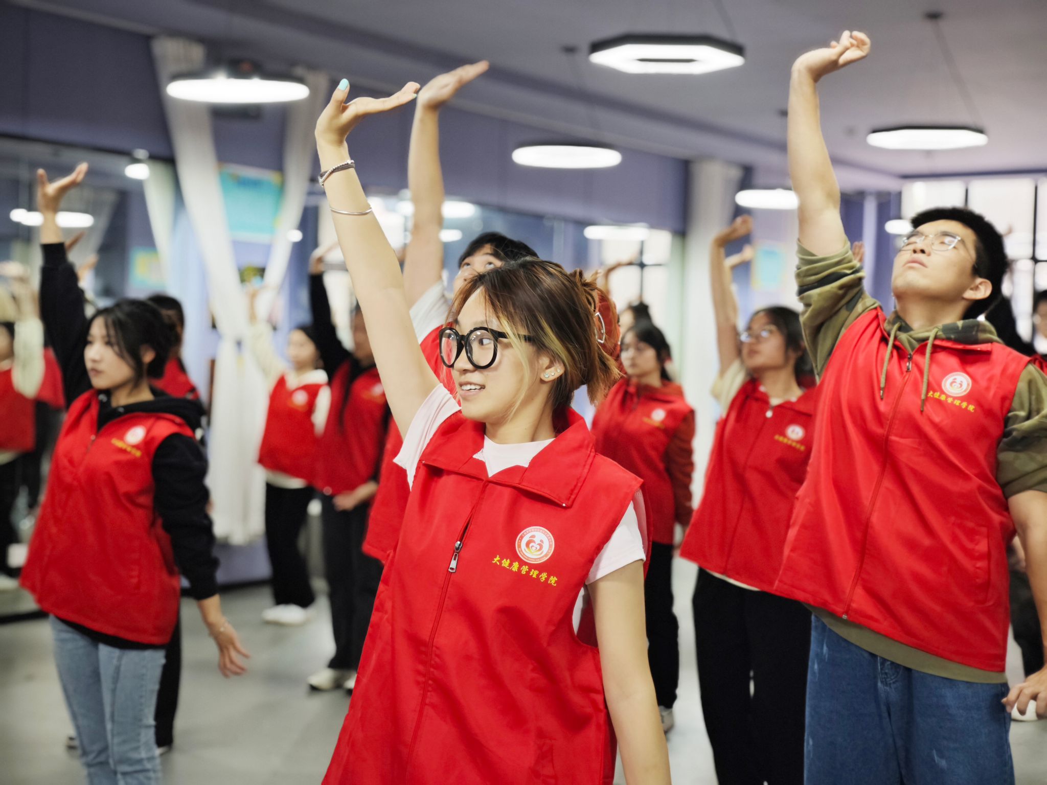 “宜未雨而绸缪,勿临渴而掘井”。随着现场古韵音乐的响起,参与者身着宽松舒适的运动服陆续聚集,原本安静的排练厅瞬间热闹起来。在向日葵医护服务志愿服务专项支队成员的带领下,大家开始热身,他们整齐地摆动双臂,高抬腿轻跃,为接下来的八段锦学习打下了良好的基础。同学们的脸上洋溢着热情的笑容,彼此交流着对八段锦的好奇与期待,那跃跃欲试的模样如同即将踏上新奇旅程的探索者。