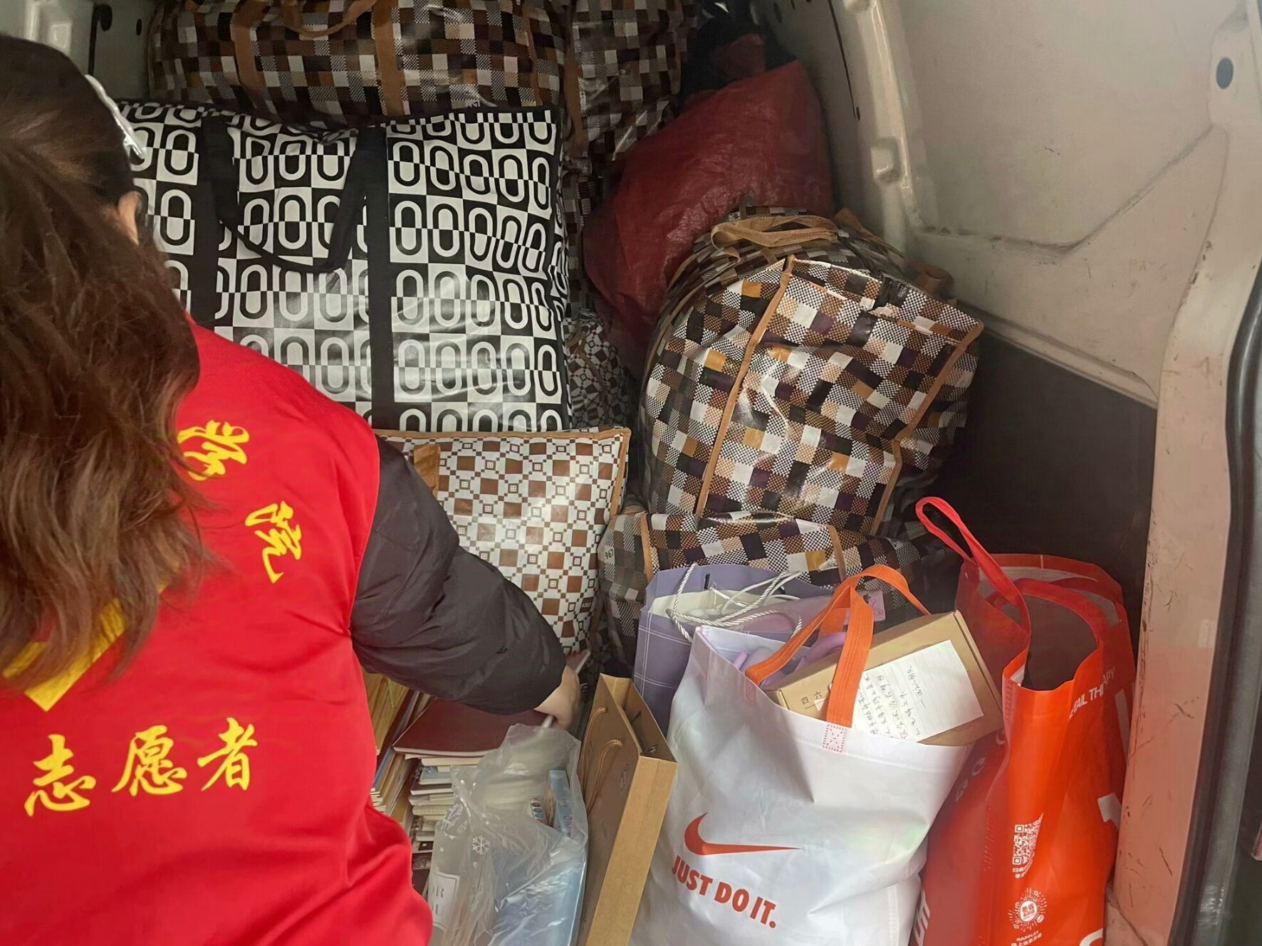 随后,志愿者们挑选大小合适的打包袋,将分类好的衣物放入其中。为防止长途运输过程中的颠簸导致衣物散乱,他们还细心地使用绳子将衣物和文具进行捆扎,并在标签上清晰地注明了物品的类型。