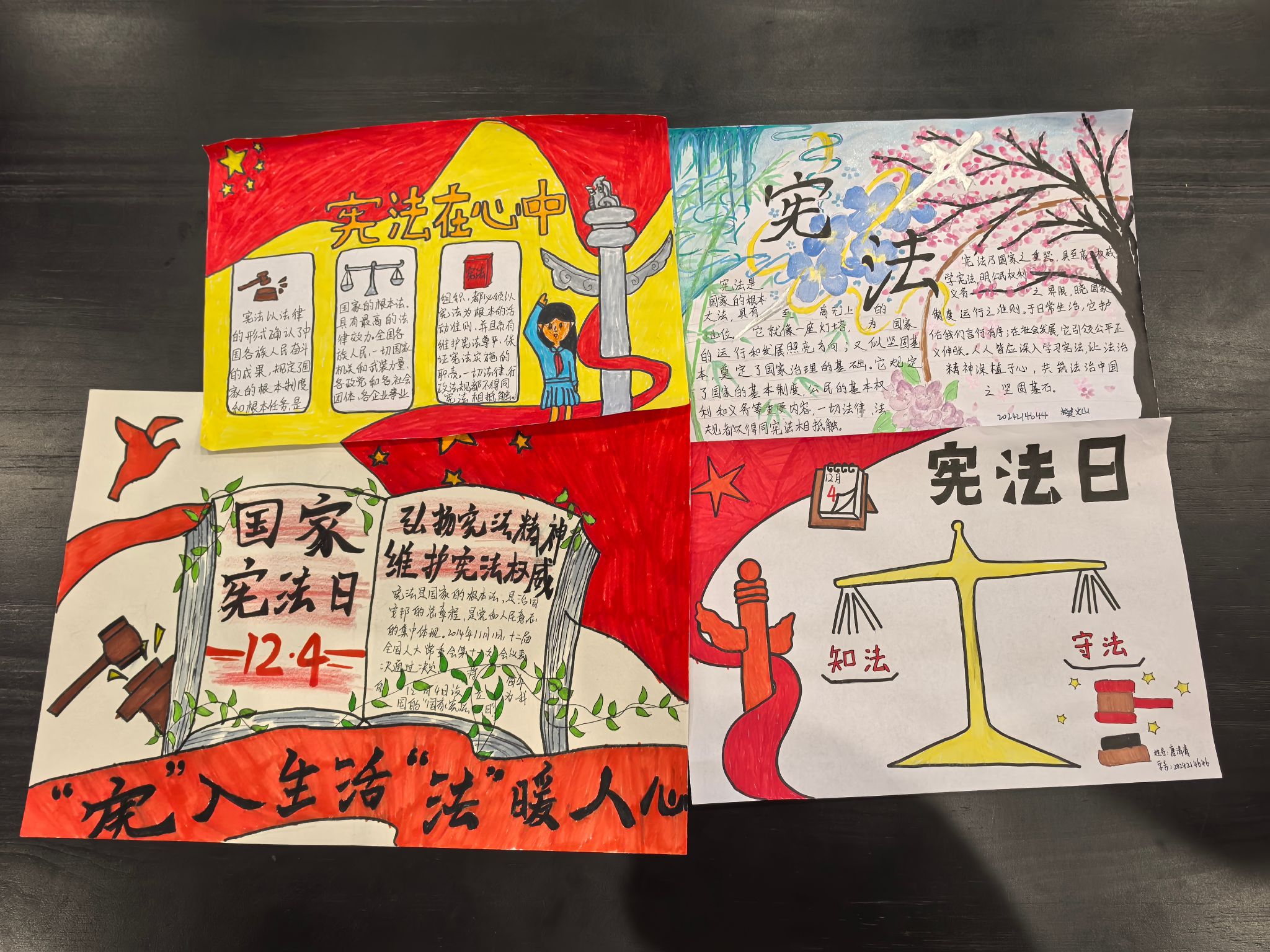 活动开始前,同学们利用课余时间广泛收集宪法相关资料,精心设计手抄报版面。有的同学以宪法的历史沿革为脉络,梳理了我国宪法发展的重要节点,展现了宪法与时俱进的时代特征;有的同学则聚焦宪法赋予公民的权利和义务,通过生动形象的插画和简洁明了的文字,让宪法条文变得通俗易懂;还有的同学结合社会热点案例,阐述宪法在维护社会公平正义、保障人民合法权益方面的强大力量,深刻体现了宪法与生活的紧密联系,在校园内掀起了一股学习宪法的热潮。
