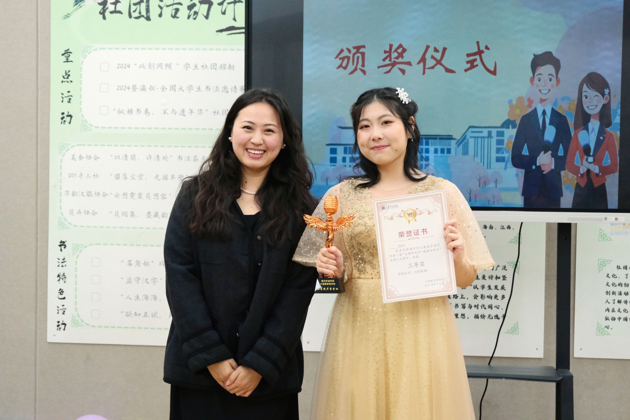 此外,评委们还特别设置了“最佳服装奖”“最佳台风奖”“最佳潜力奖”,分别授予了郭禹萱、田常青和李小华三位同学,他们的精彩表现也为本次大赛增添了不少光彩。圆满落幕 启航未来大健康管理学院首届主持人大赛圆满落幕。赛事为选手搭建展示与提升自我的舞台,充分展现主持艺术魅力与学子风采。比赛中,同学们语言表达和应变能力得以锻炼,收获诸多宝贵经验与深刻启发。相信在不久的将来,会有更多的才俊在这里崭露头角,成为主持、表演等领域的佼佼者。