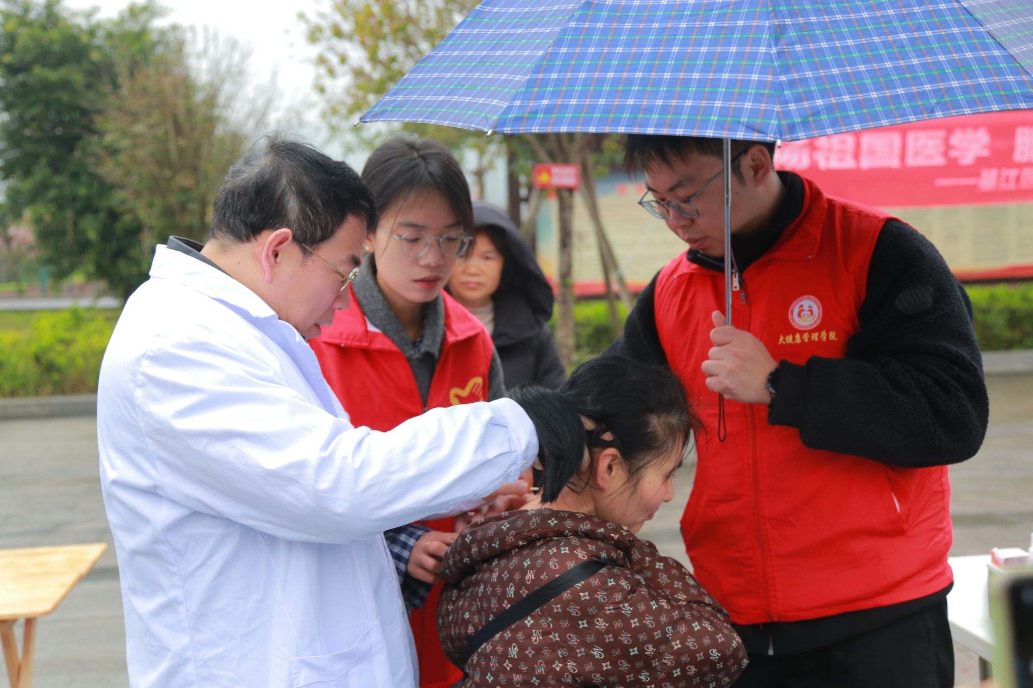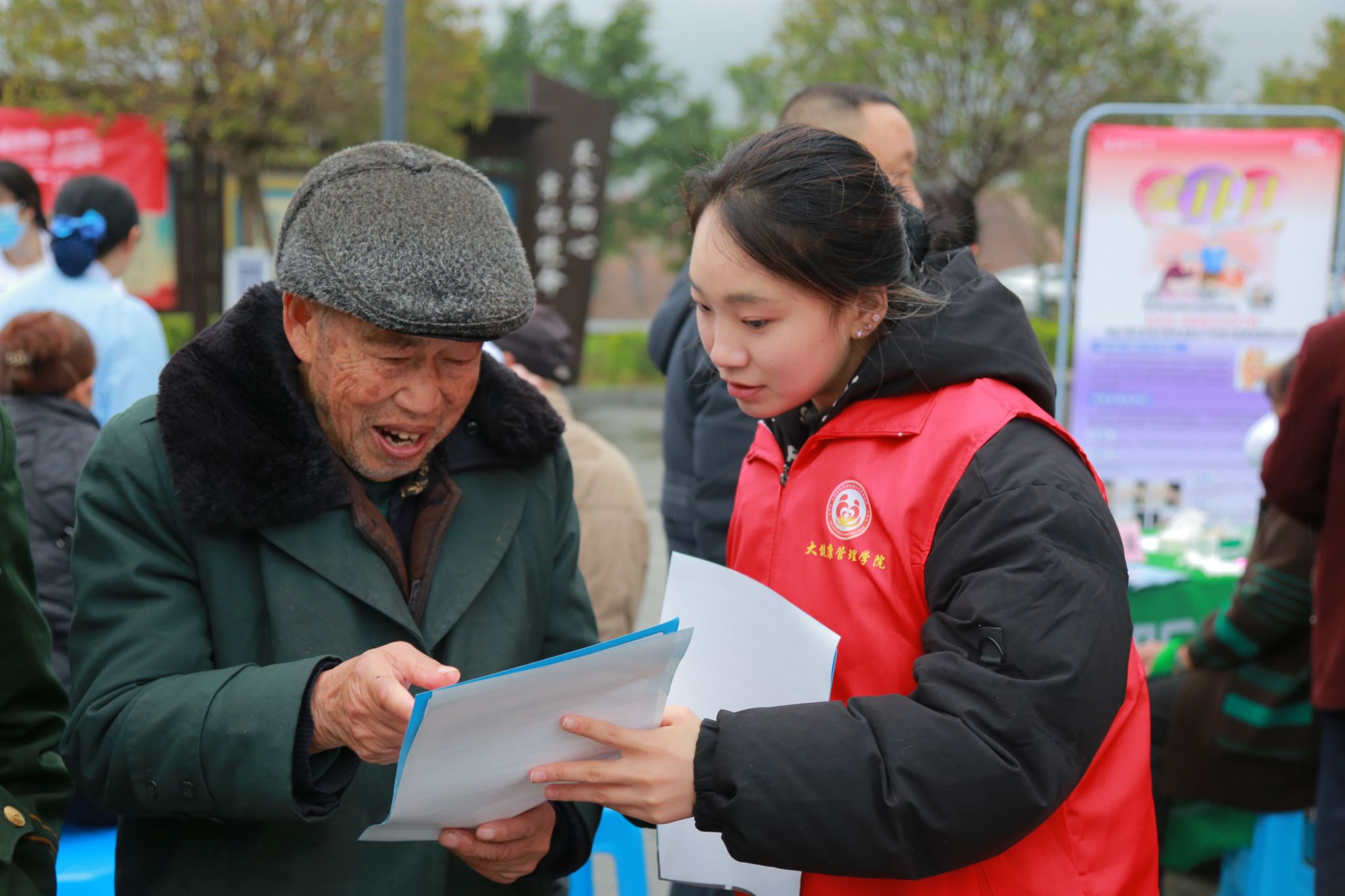 活动现场,大健康管理学院“向日葵”医护服务志愿服务支队的志愿者协助綦江区中医院的医护团队搭建义诊台,面对人流高峰,志愿者们用“微笑提醒+分流引导”化解拥挤,向居民介绍义诊流程。志愿者们主动承担起“专属陪护”任务,搀扶行动不便的老人测量血压,用方言亲切讲解注意事项,为现场活动有序开展提供重要保障。