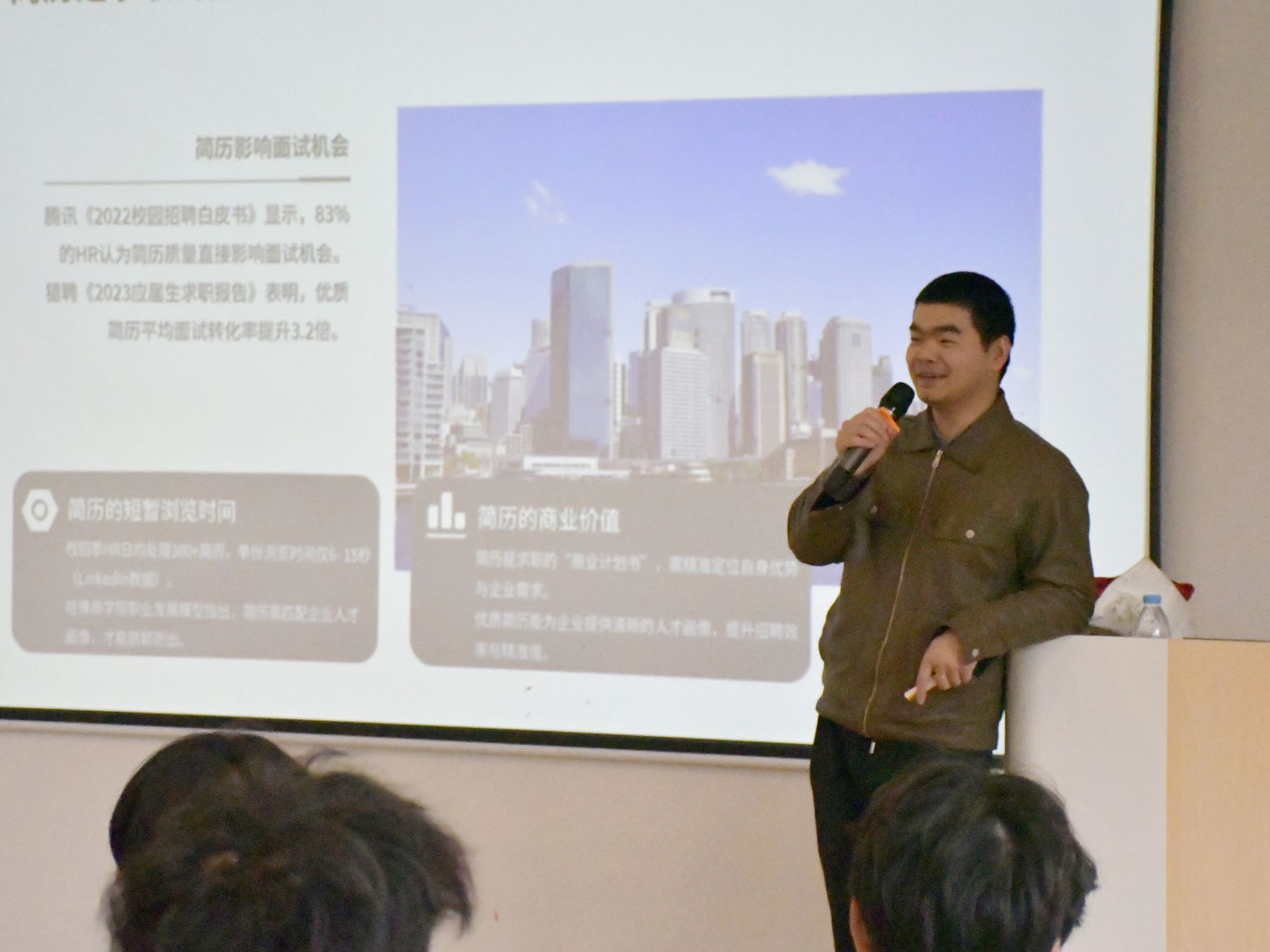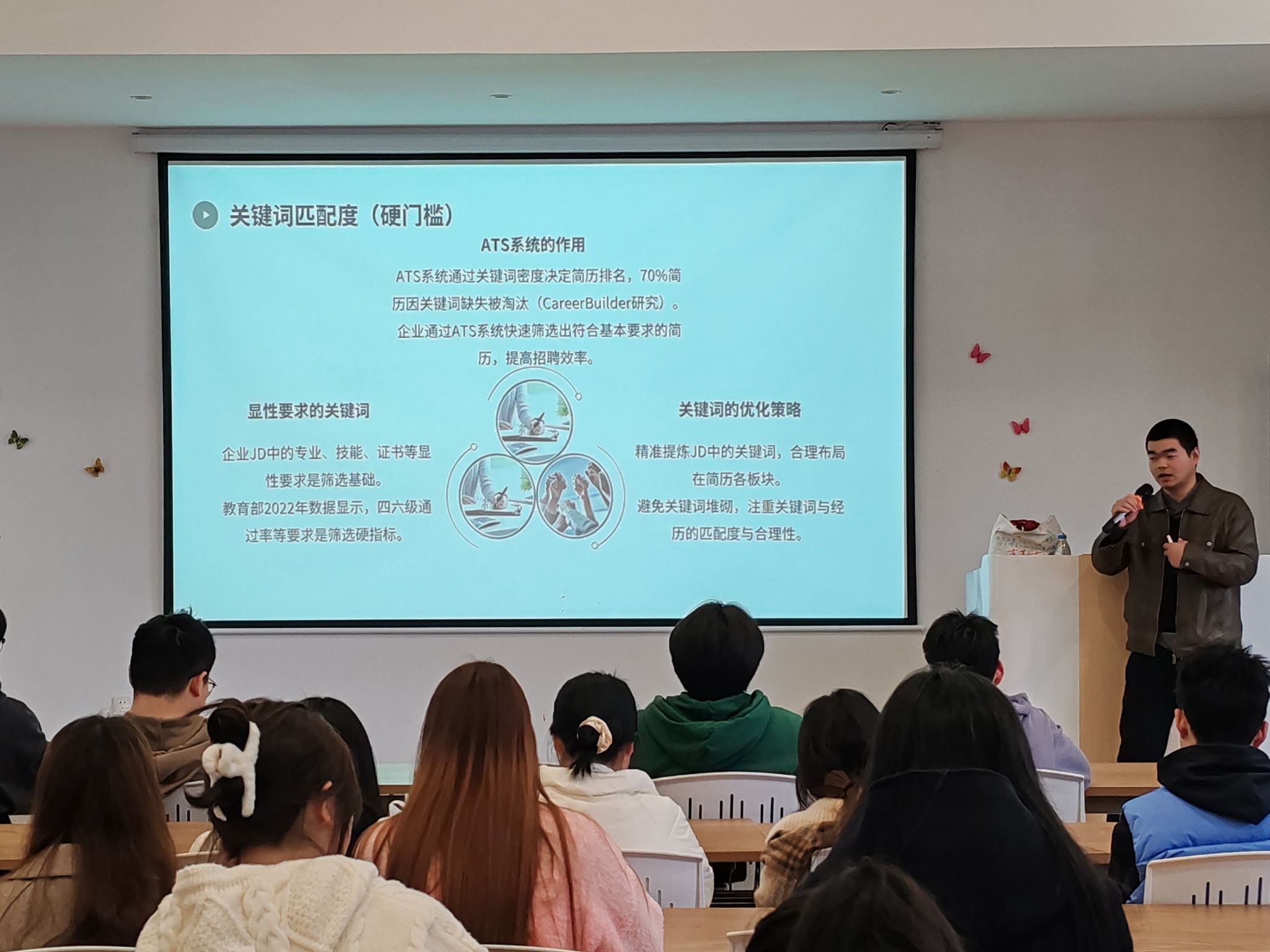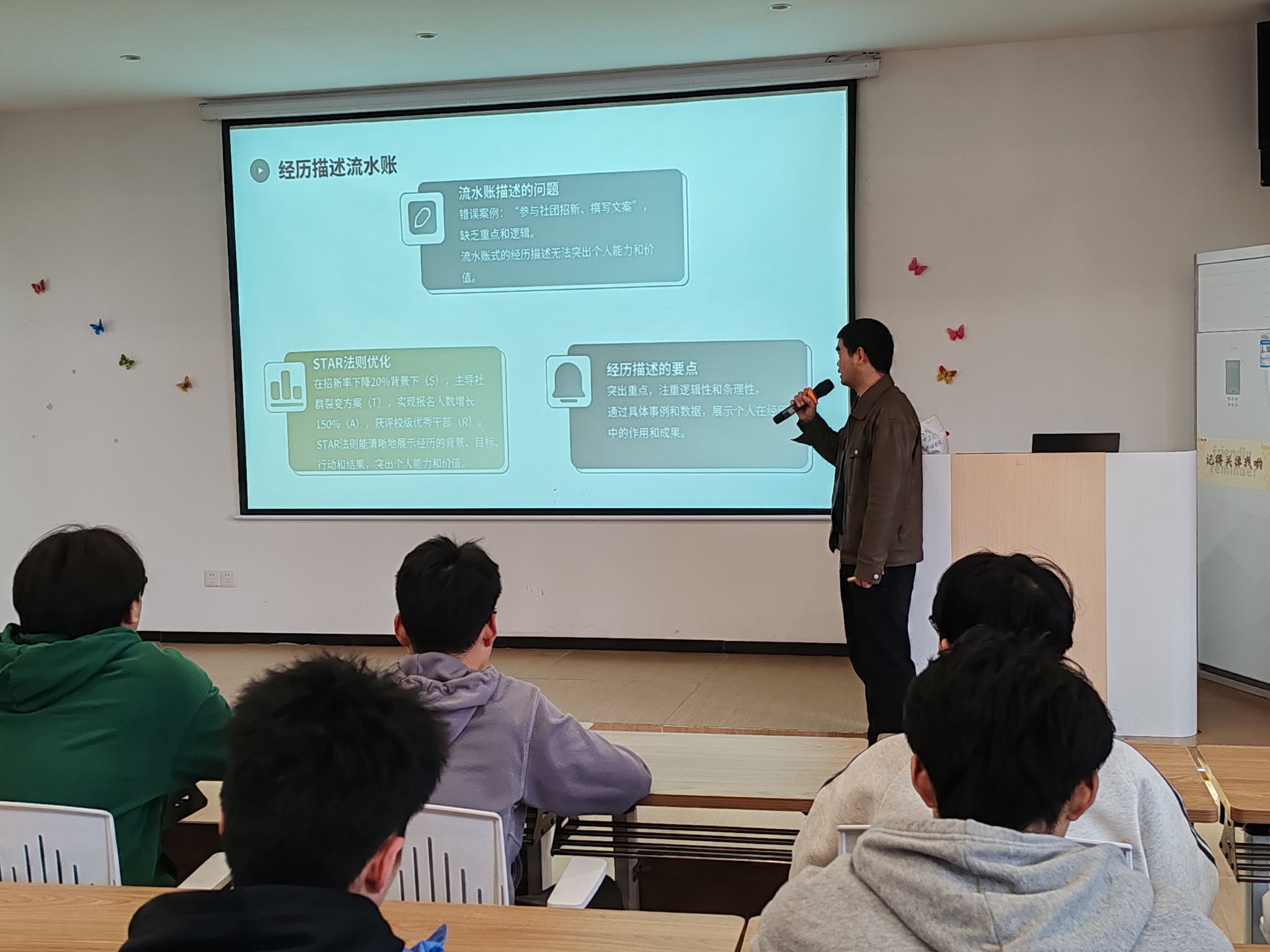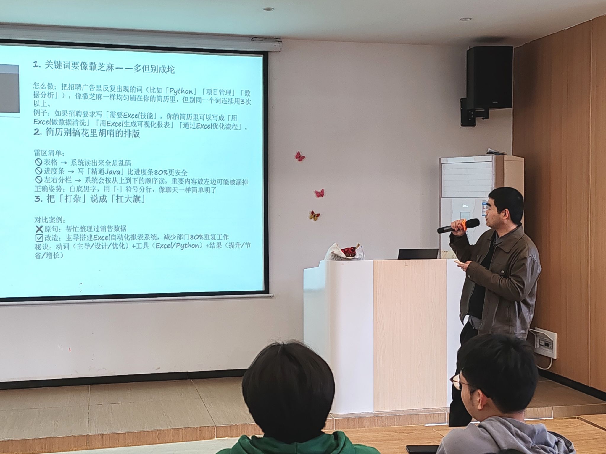 特别着重强调了五个高频出现的 “雷区”:模板陈旧、无效信息堆砌、自我评价空洞、经历描述如流水账以及格式一致性缺失。同时,他还点明,与岗位适配的关键技能和项目经验,是决定简历能否顺利通过筛选的关键所在。为了让同学们更直观地理解,李跃老师分享了诸多实际筛选案例,使同学们对常见的简历误区一目了然。