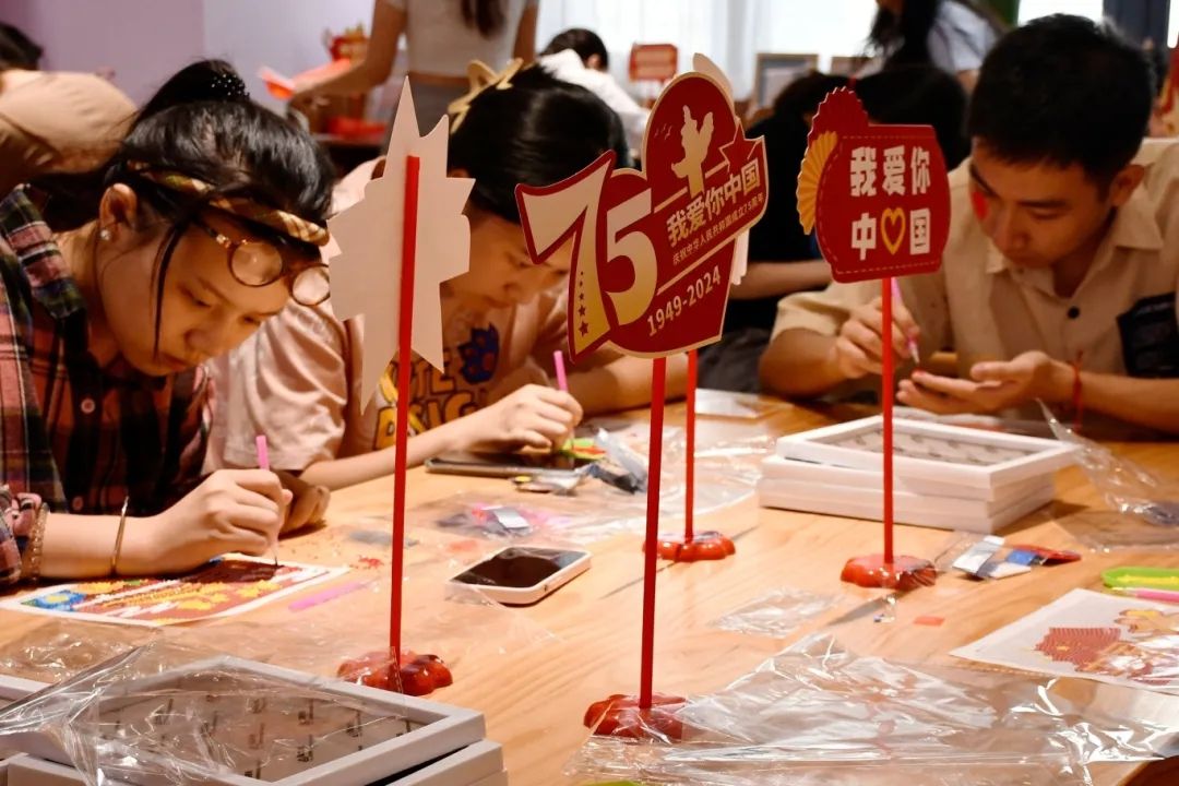 钻画璀璨辉国志,画韵悠长颂党恩。活动现场,同学们以画为媒,用钻石画传递着对党和国家的热爱。在新中国成立75周年的光辉节点下,这一幅幅饱含深情的画作,仿佛是一颗颗炽热的心,诉说着同学们对中华人民共和国成立75年来伟大成就的自豪,以及自身的理想与担当。他们用手中的材料,描绘出祖国的壮丽山河、党的伟大征程,展现着75年来祖国大地的沧桑巨变与辉煌成就。
