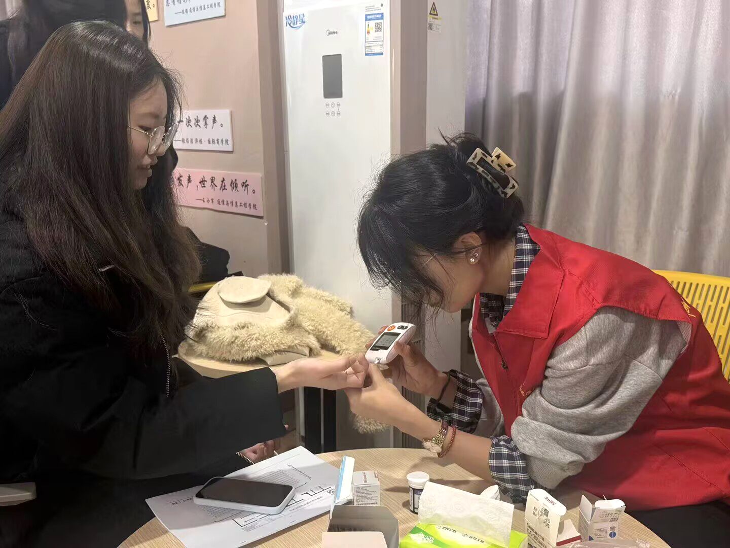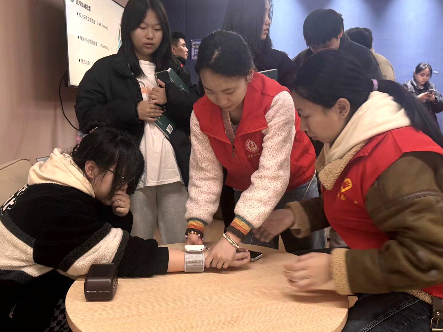 随着生活水平提高和生活节奏的加快,高血压、高血糖等慢性疾病呈现年轻化趋势,为有效提升大学生对血压、血糖健康知识的认知水平,大健康管理学院“向日葵”医护服务志愿服务专项支队于3月19日在綦河书院3号楼创客交流空间开展“血压血糖齐检测,健康生活共收获”主题活动,参与者们在志愿者的讲解下开启了一场健康探索之旅。