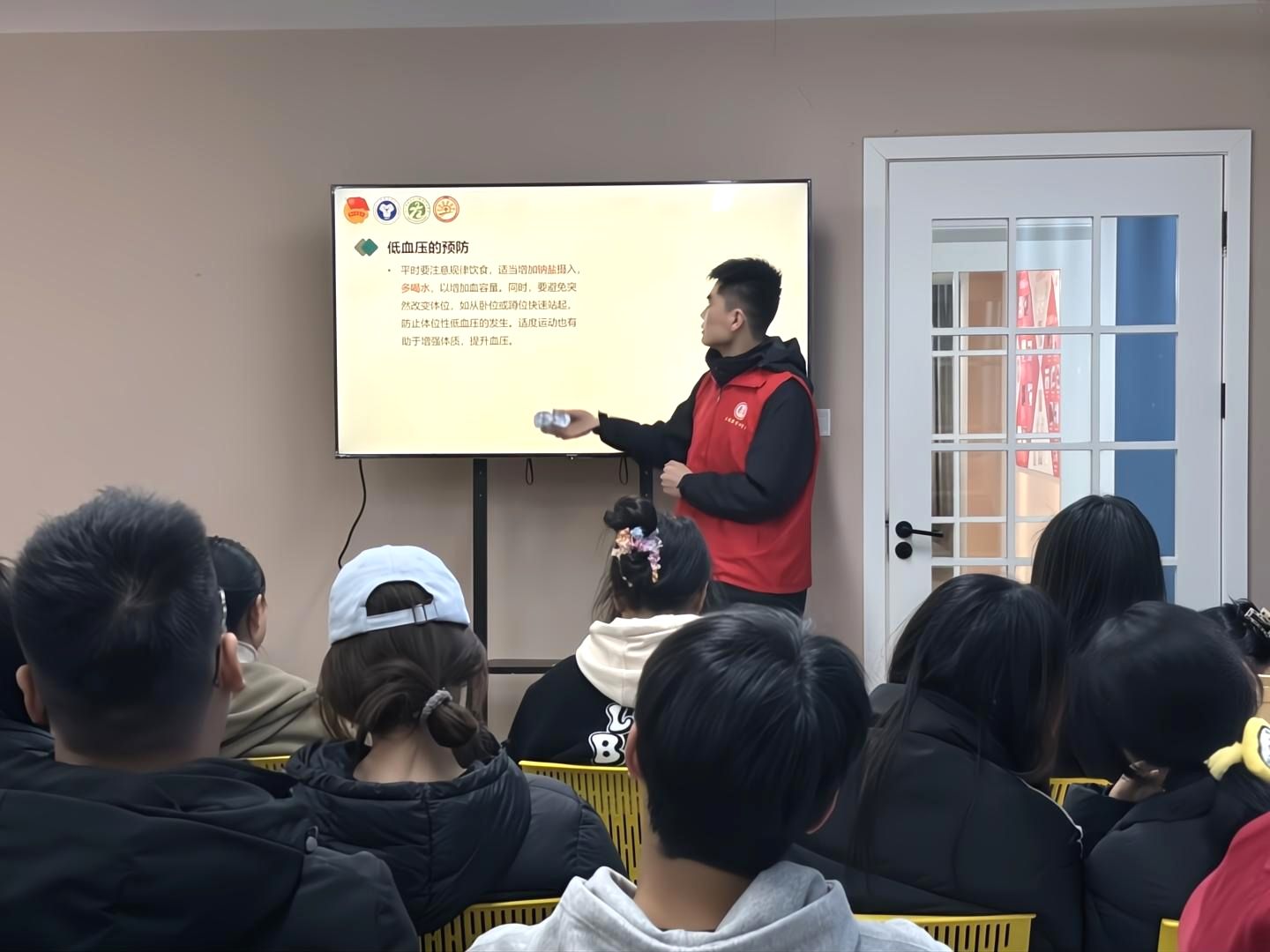 在实操环节,志愿者演示了血糖仪与血压仪的使用方法并耐心指导同学们如何正确使用测量仪器。同学们积极参与,纷纷排队等待检测,现场气氛热烈而有序。