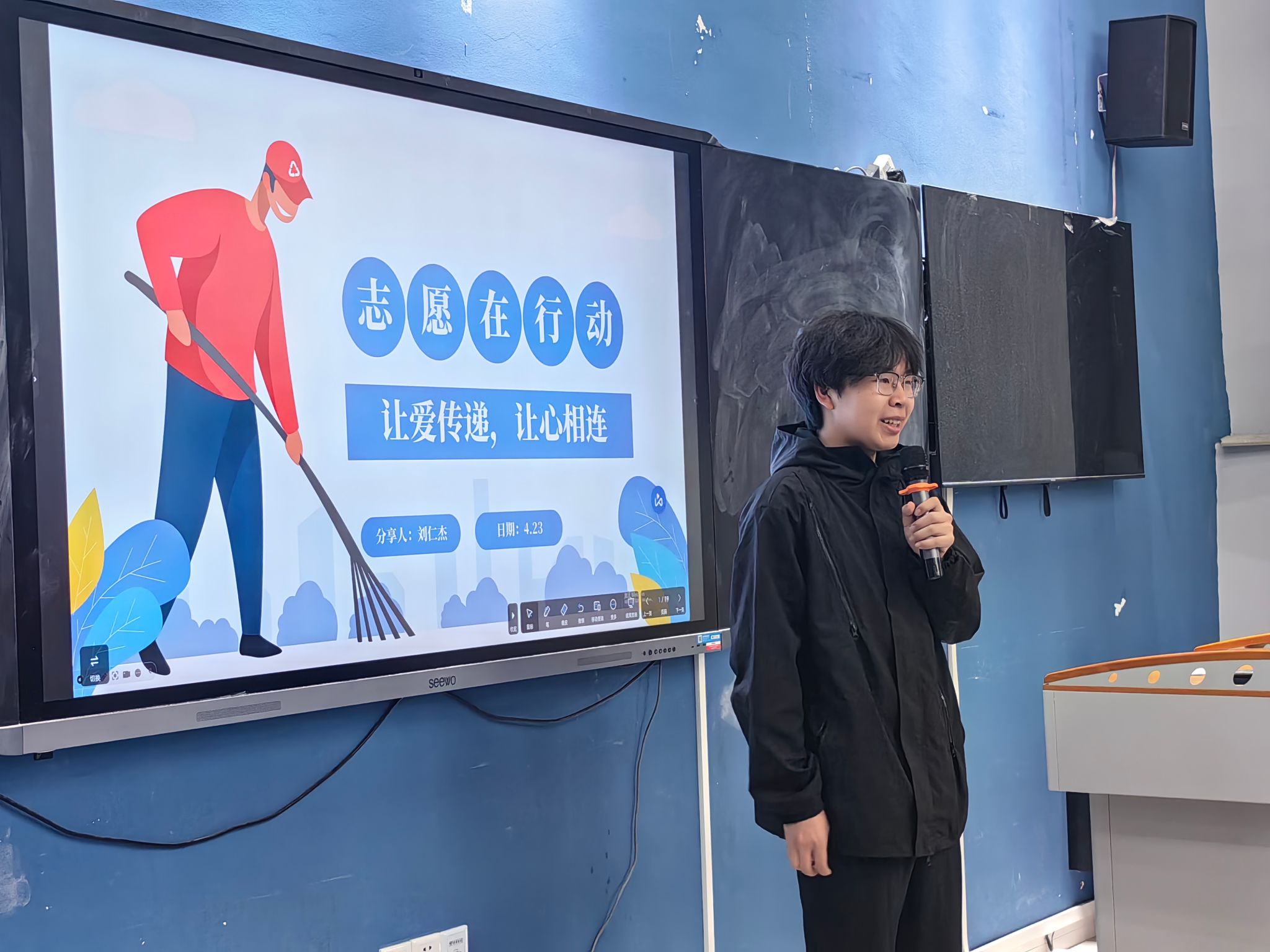 刘仁杰同学紧接着分享了参加志愿活动对自己的帮助。志愿服务是为志愿者提供实践锻炼的平台,在实践中有助于提升个人的综合素质和能力水平。通过参与志愿服务,志愿者们能够锻炼自己的沟通能力、团队协作能力、解决问题的能力等,并且志愿服务还能让志愿者们体验到帮助他人的快乐,增强自我认同感和成就感,促进个人价值的实现。他分享到自己在重庆移通学院大健康管理学院近一年时间内参与的多场志愿活动,认识了许多来自五湖四海的志愿者伙伴,不仅拓展了人际关系网络,同时也为个人的未来发展打下坚实基础。