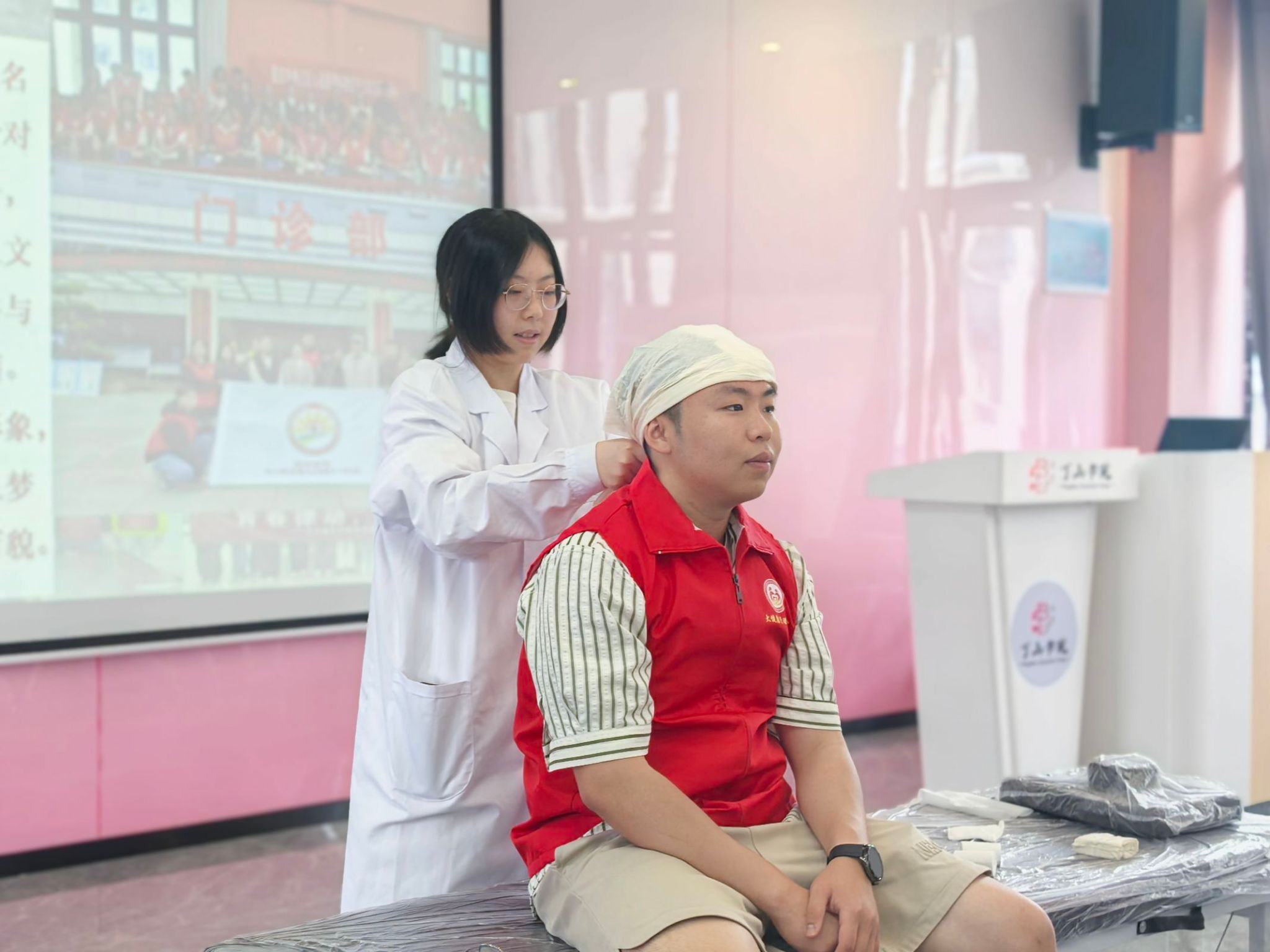 在实操环节,学生们分组轮换学习,确保精准掌握关键急救操作要点。西医急救教学区,志愿者精准把控胸外按压节奏,规范展示人工呼吸动作,并通过情景模拟“异物卡喉”突发状况,让学生两两搭档,反复练习腹部冲击手法,熟练掌握自救与互救的实用技巧;三角巾包扎教学中,学生们积极动手,实践“8字包扎法”等不同部位的包扎方式,有效提升应急处理能力。