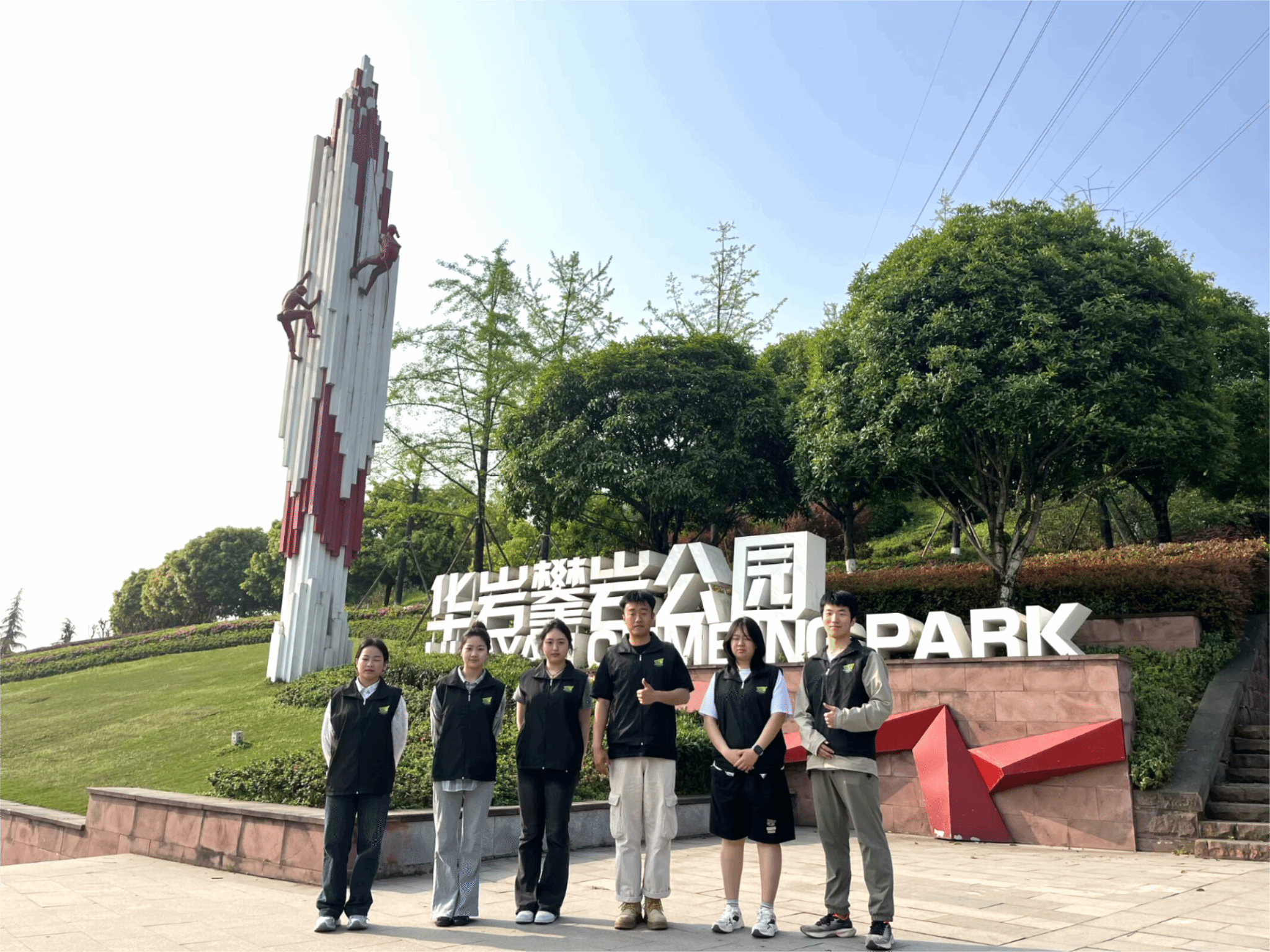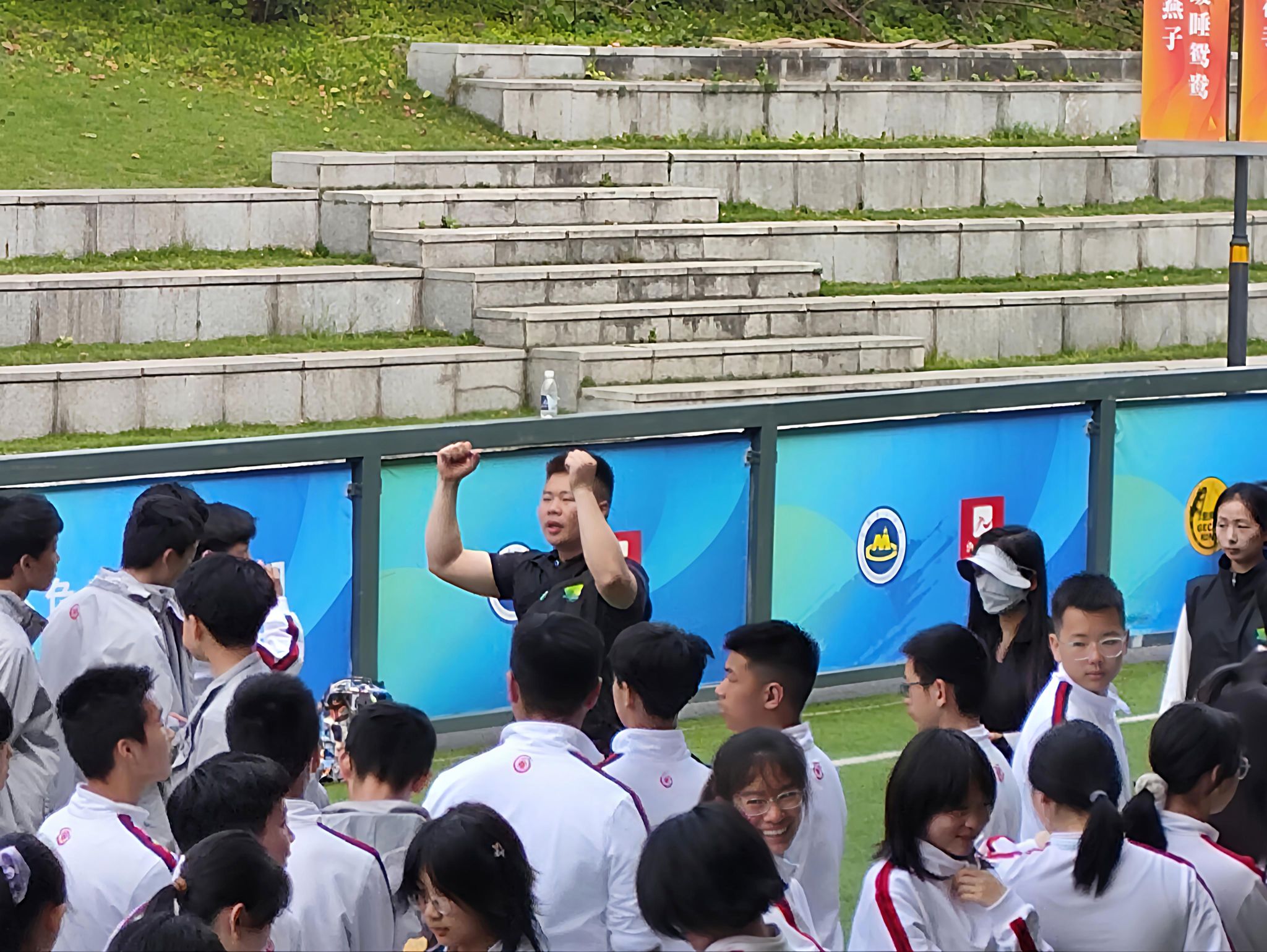 活动首日恰逢重庆发布高温预警,户外气温突破30℃。健管学子在韦涵译、王宇航两位队长带领下,建立起动态防护体系:每15分钟组织集体补水,实时调整防晒设施,随身医疗包时刻待命。在岩壁教学区,他们以“双检制”确保每名学员装备安全,独创“三阶鼓励法”帮助学员突破心理极限。当其他学生在树荫下休憩时,这群“蓝衣守护者”仍在烈日下校准设备、复盘动线。
