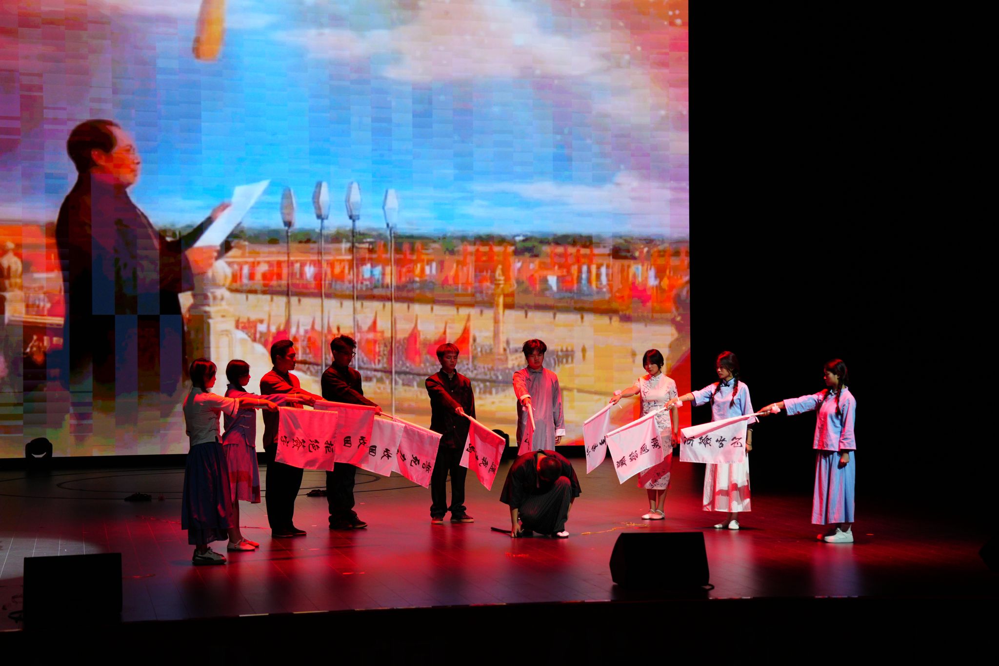 随着剧情推至高潮,一曲《紫荆花盛开》悠然而起,观众席两侧学生高举鲜红横幅、奋力挥洒传单,如潮水般冲上舞台。漫天纸页与炽热呐喊交织,剧场内热血青年的呐喊声层层激荡,与百年前五四游行的怒吼遥相呼应。台上青年振臂高呼,台下观众热血沸腾,时空界限在此刻消融!