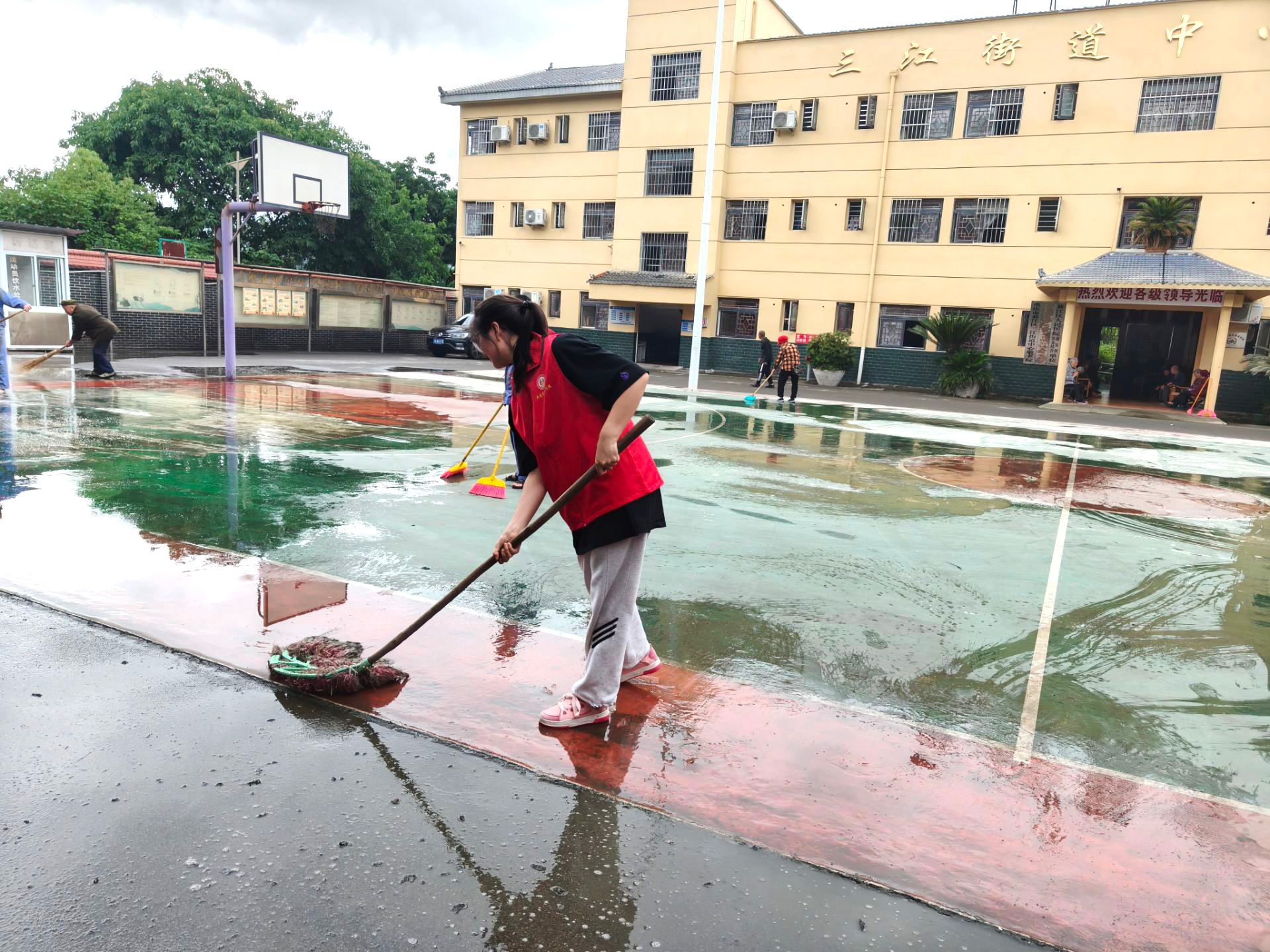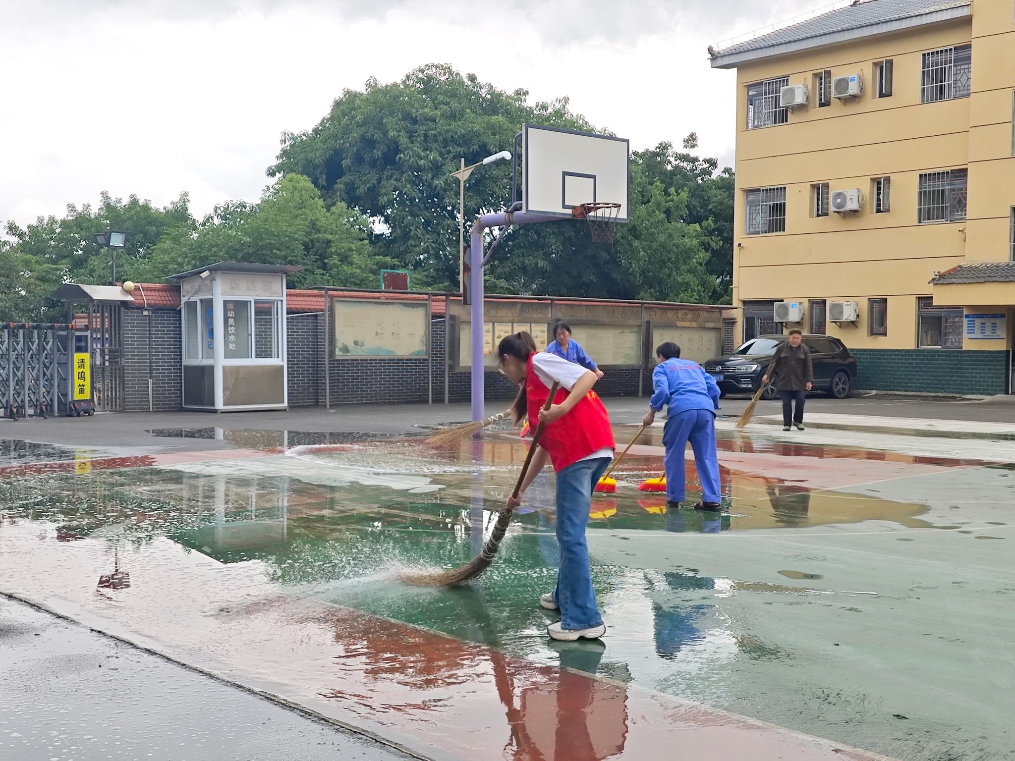 活动伊始,学生志愿者们悄然行动——雨后敬老院运动场积水未退,年轻的身影迅速拿起清扫工具,与敬老院工作人员一同仔细清理地面,为老人们的安全活动空间提供保障。积水映照出他们俯身的背影,无声传递着对长者安康的守护。