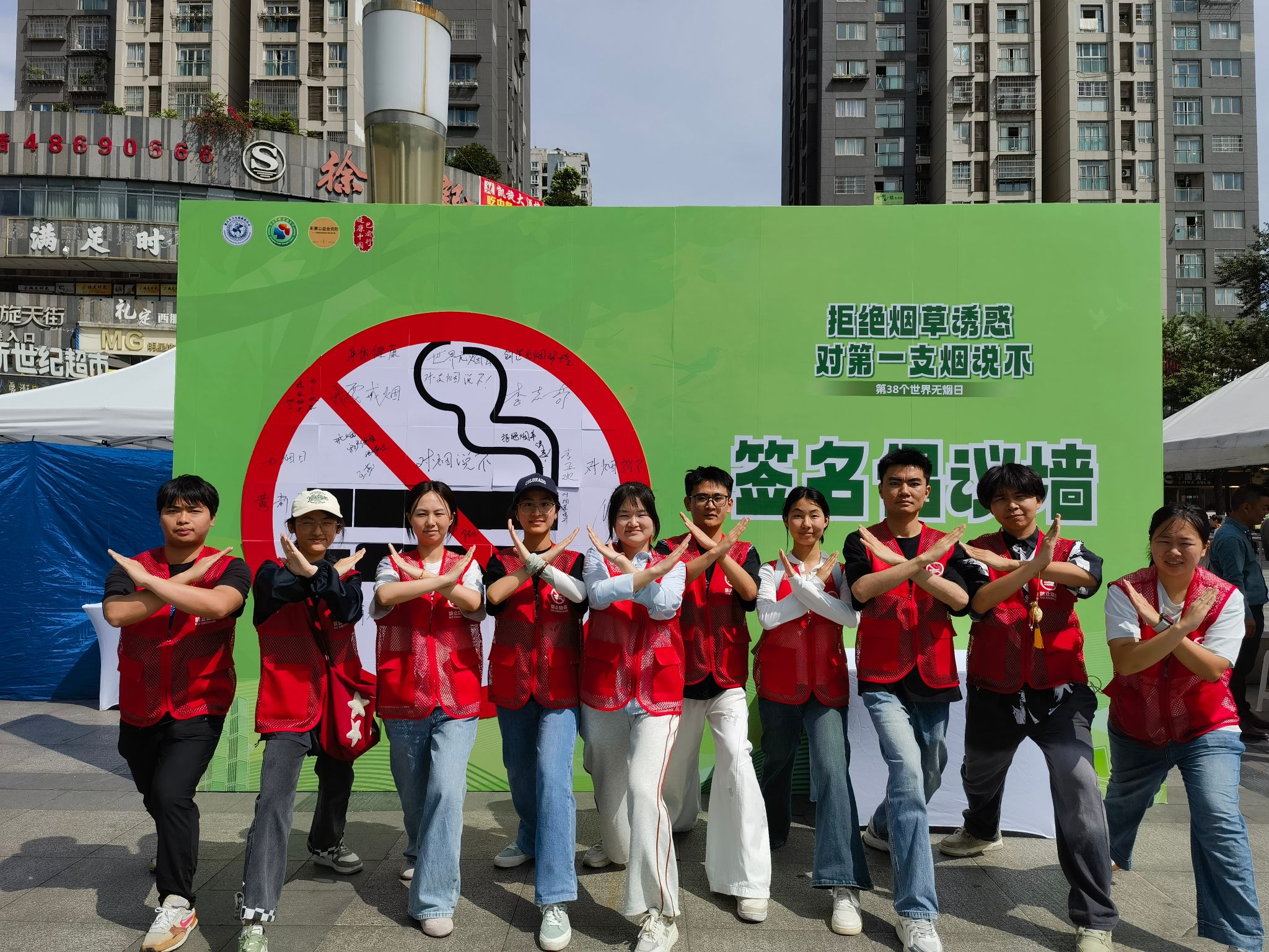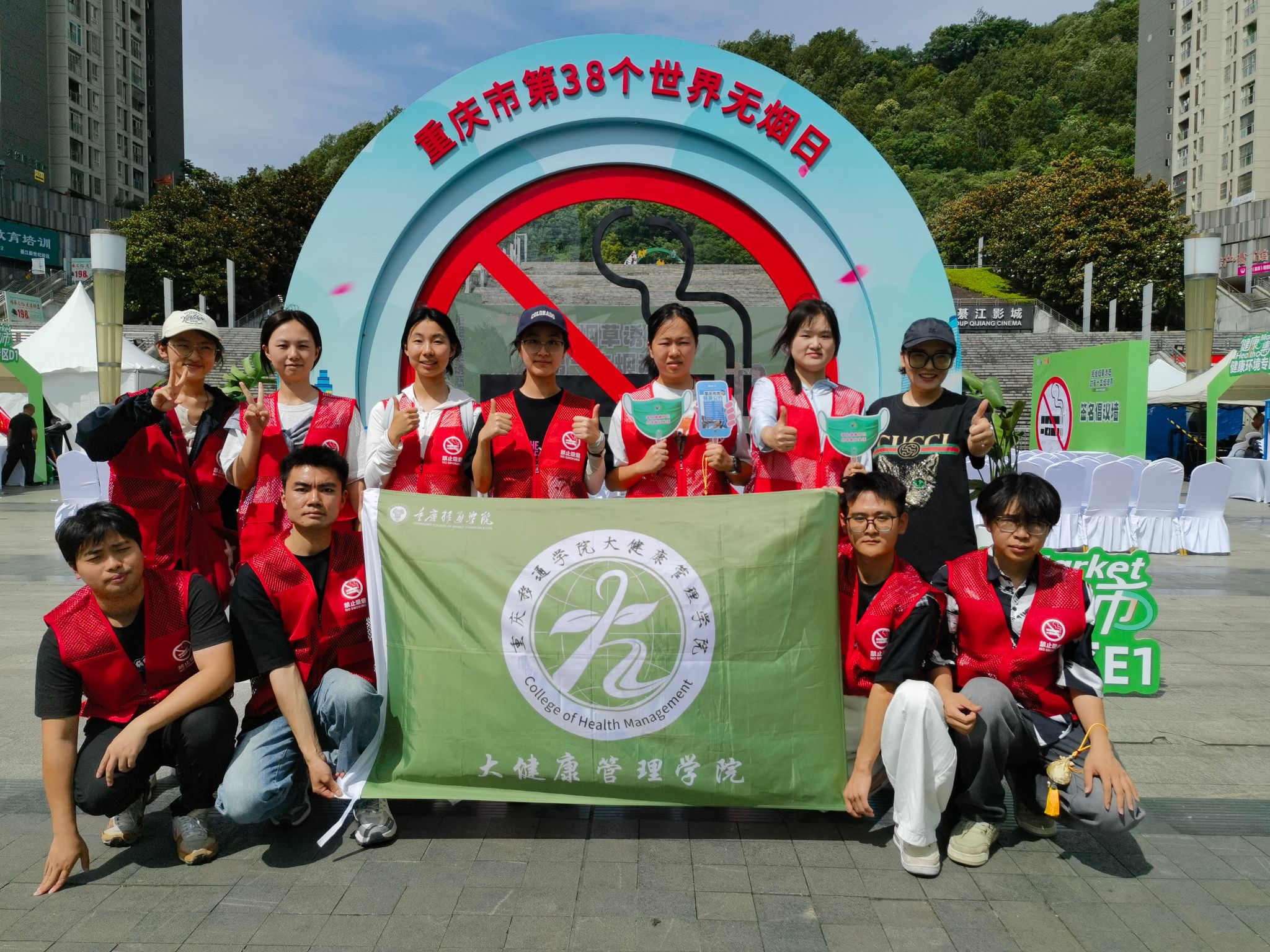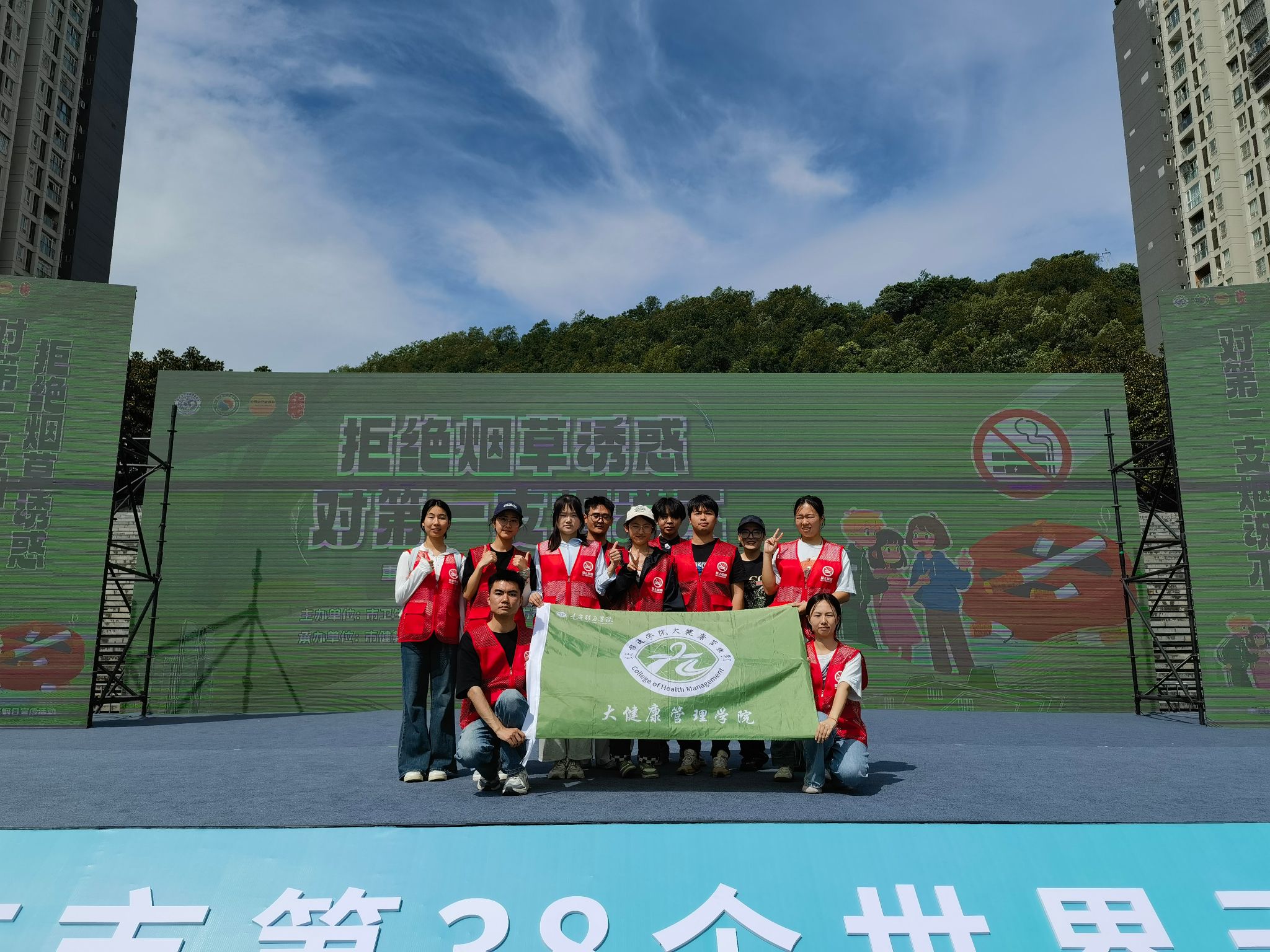 2025年5月30日上午,重庆市第38个“世界无烟日”集中宣传活动在綦江区营盘山广场隆重举行。大健康管理学院积极响应綦江区中医院邀请,组织养老服务管理专业和体育经济与管理专业的10名优秀学子组成志愿者服务队,深度参与活动后勤保障与“健康集市”特色展区服务,以专业素养和青春热情为控烟行动注入新活力。
