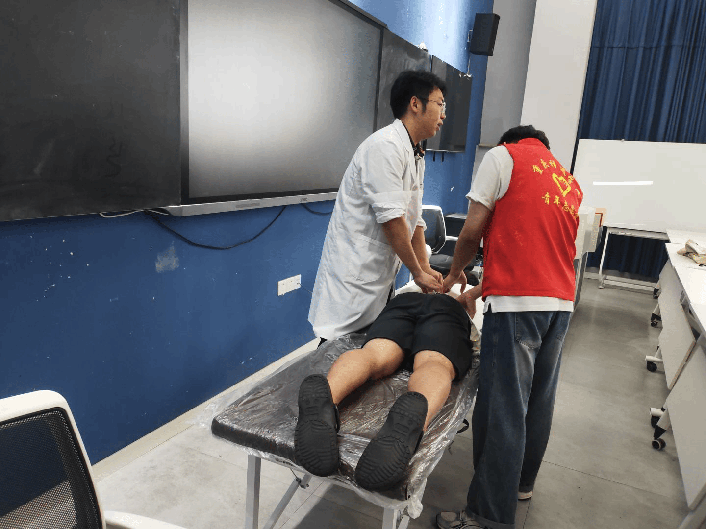 实操教学环节成为本次活动的一大亮点。志愿者在现场专业示范揉法、按法、滚法等基本推拿手法,边演示边讲解技术要点。随后志愿者热情邀请同学们上台,进行一对一指导练习并亲身体验感受中医推拿的魅力。