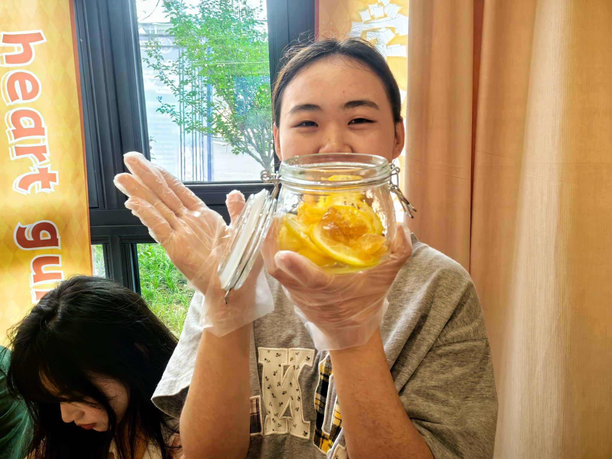 志愿者们穿梭其间,耐心指导酿造技巧,并适时穿插讲解青梅酒的历史文化与健康功效,成为一堂生动的节气文化实践课。活动尾声,所有作品整齐陈列,汇成一片“初夏酒园”,参与者们围绕作品合影留念,脸上洋溢着收获的喜悦。
