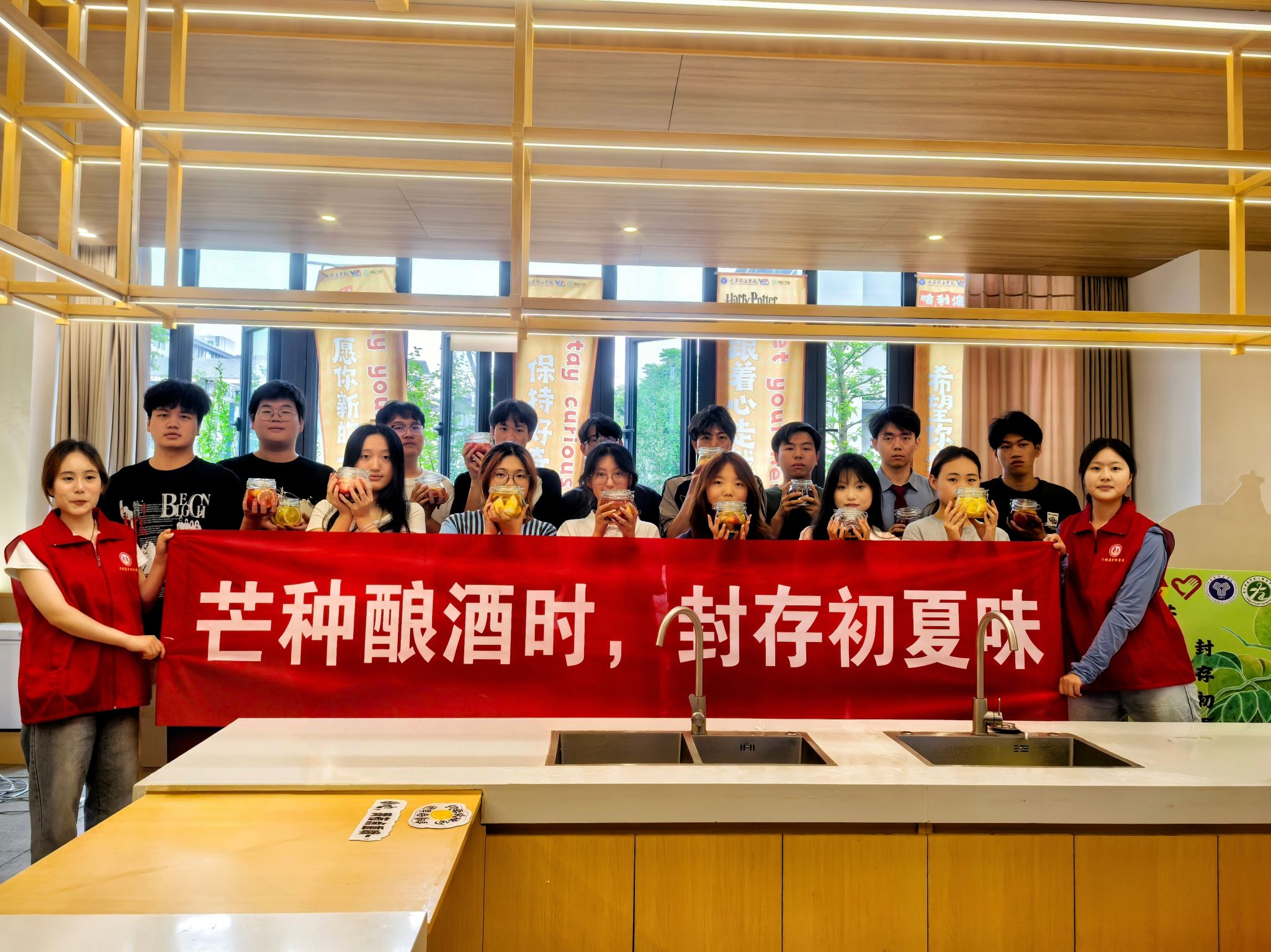 芒种,二十四节气中的第九个节气,标志着仲夏伊始。此时正值江南梅雨时节,亦是青梅成熟佳期。大健康管理学院青年志愿者协会于6月6日在南江书院笃行·共享生活厨房成功举办“芒种酿酒时・封存初夏味”主题活动。活动以传统酿酒为载体,引导同学们亲手酿造青梅酒,通过沉浸式体验,深入传承芒种节气文化。