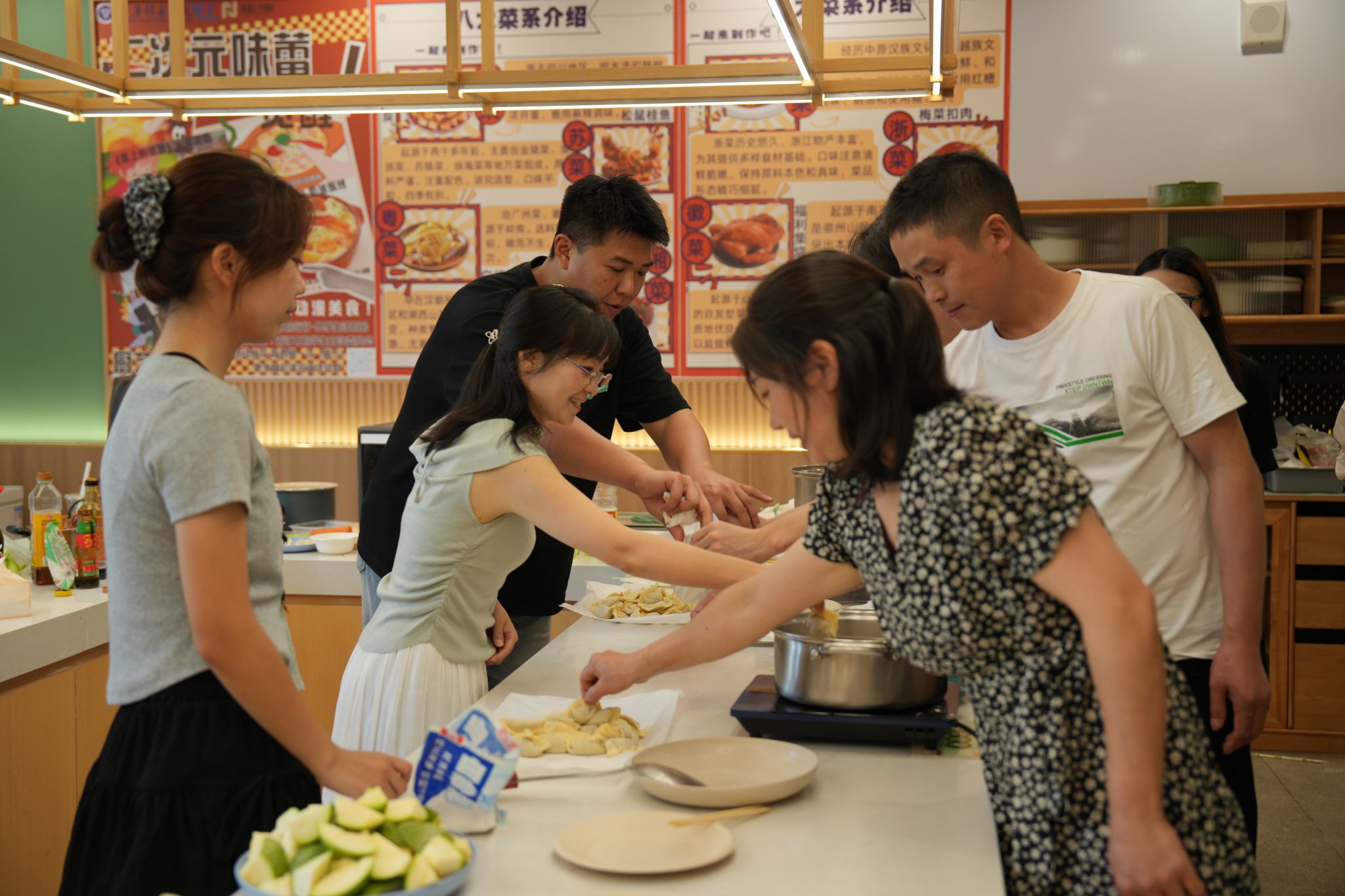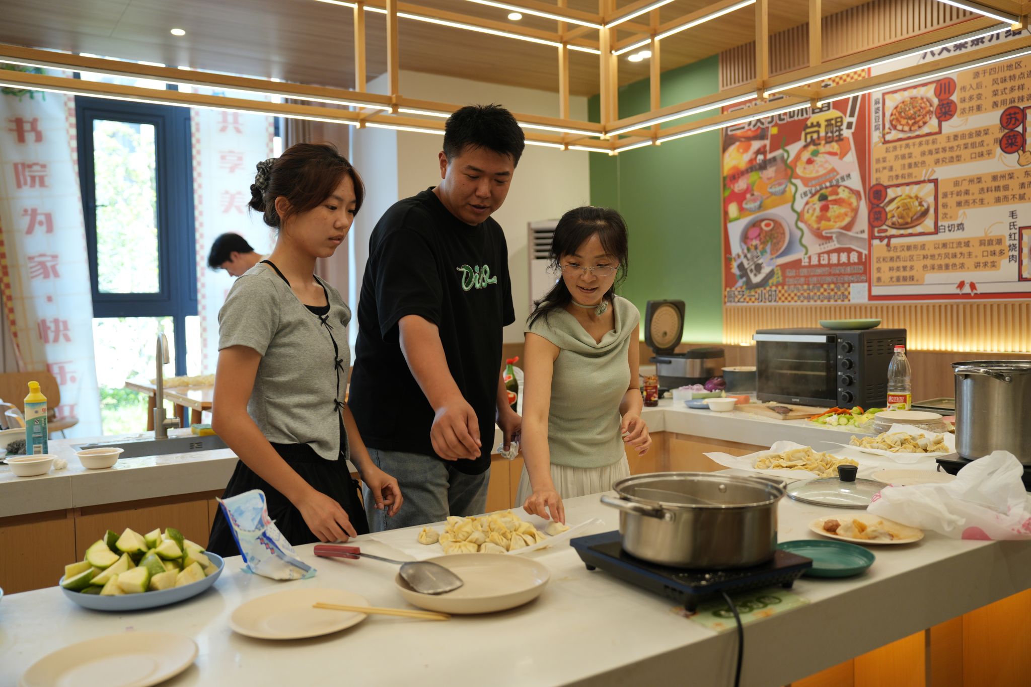 南江书院笃行·共享生活厨房内,家长与孩子协作烹饪、共享午餐,袅袅炊烟中是亲子互动的温馨。辅导员借此契机与家长围坐恳谈,围绕学生学业进展、生活适应等话题展开深入交流,有效畅通了家校沟通渠道。