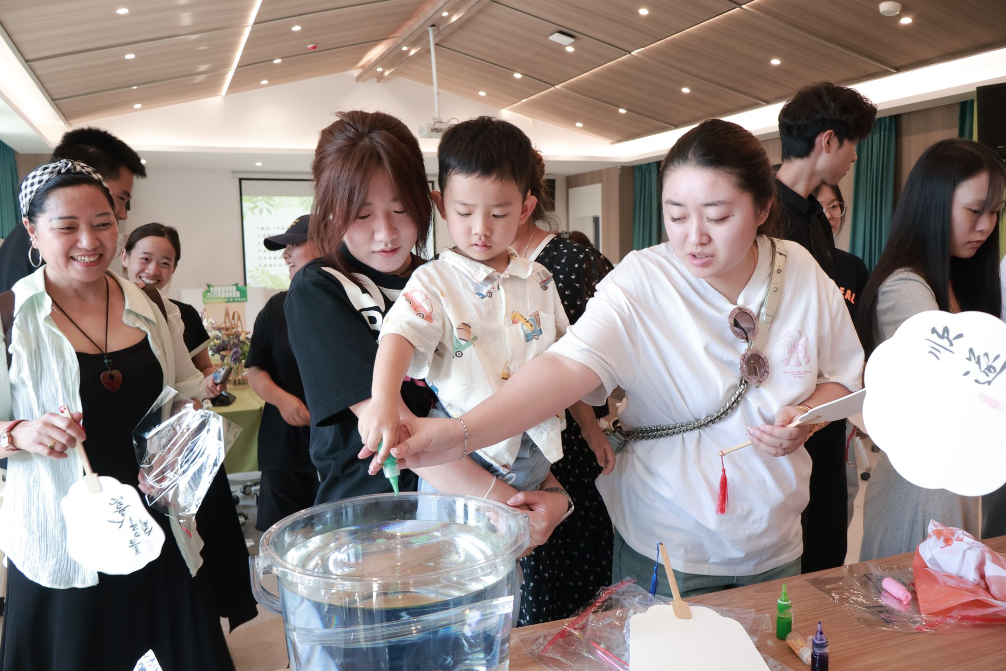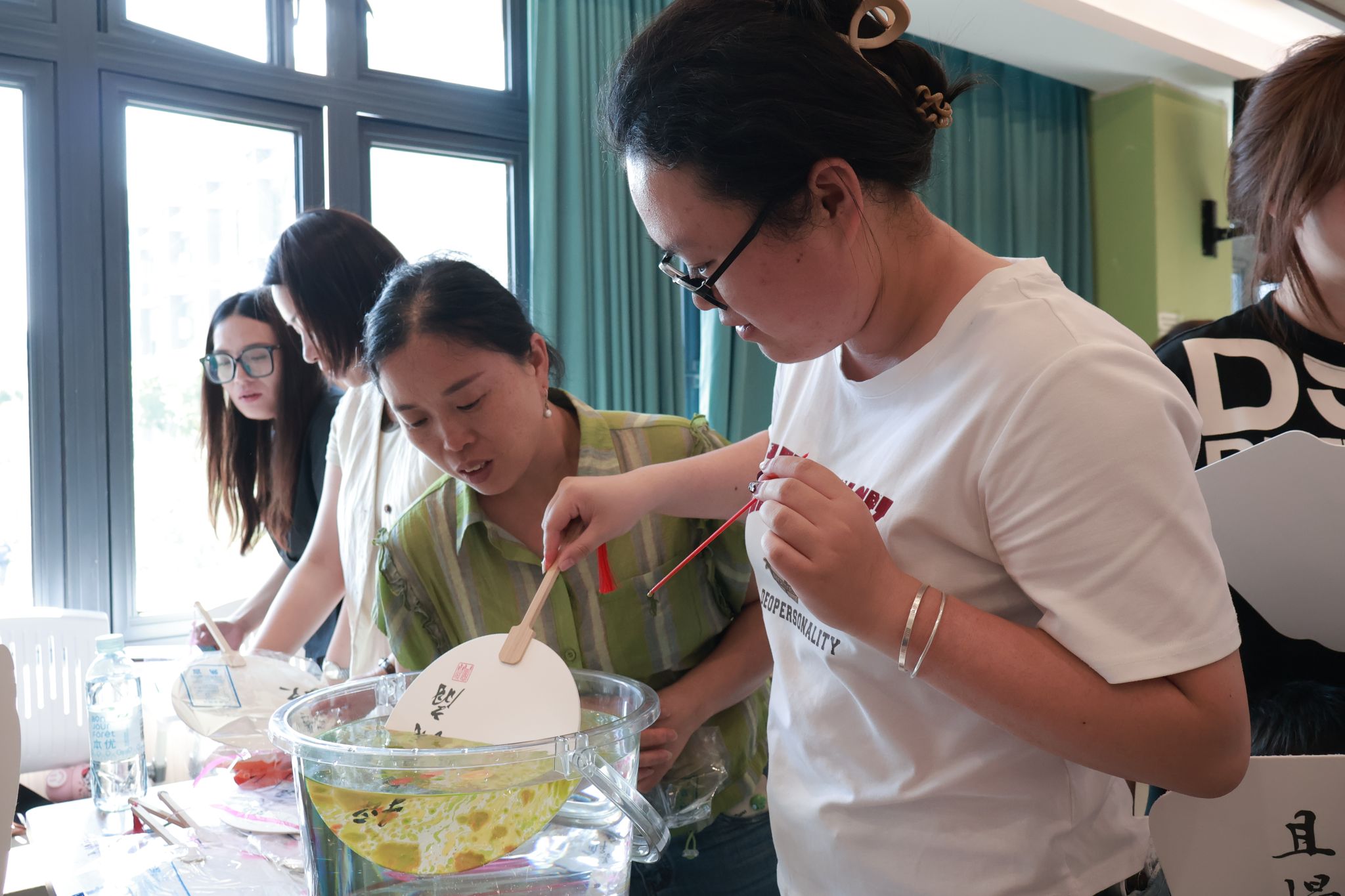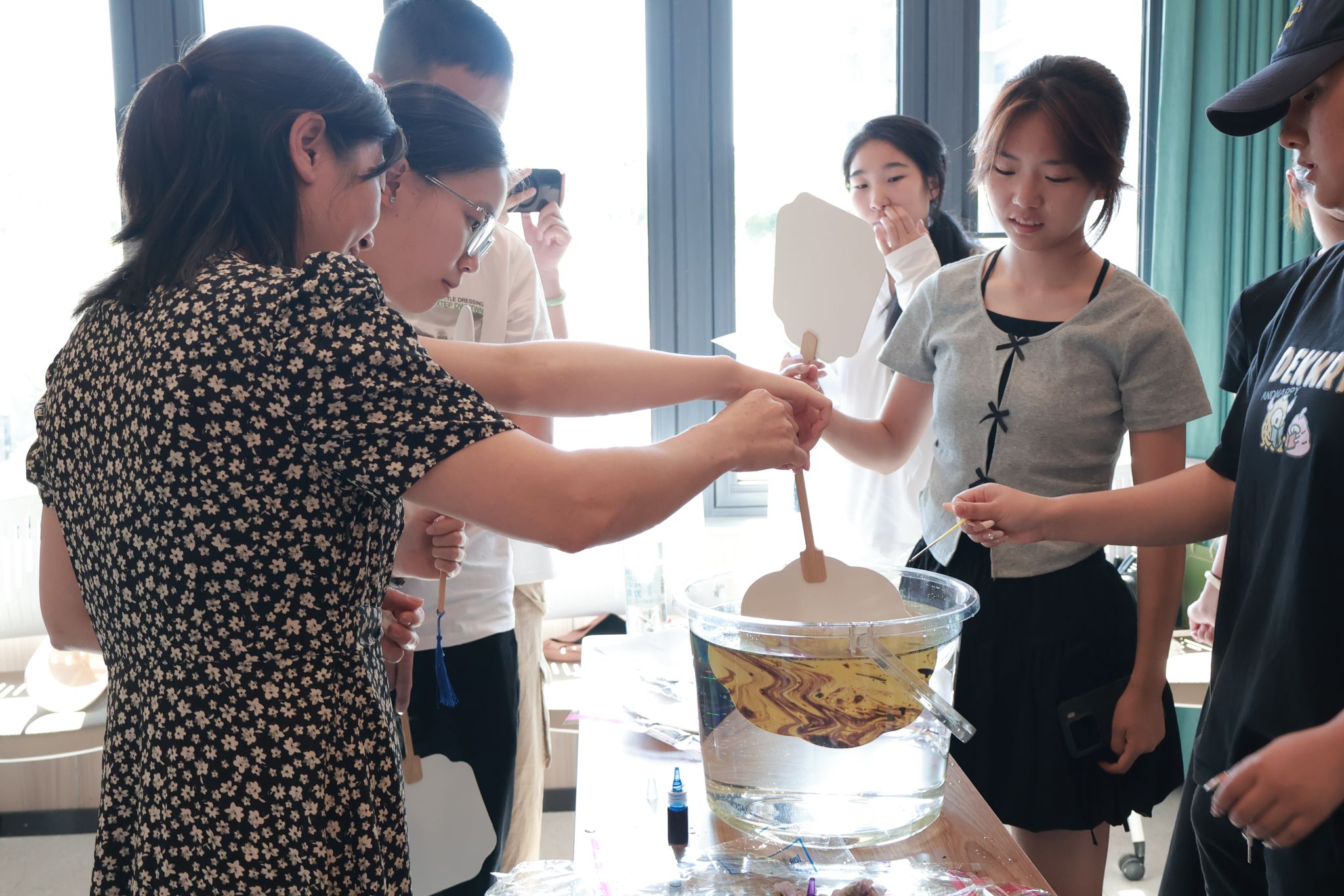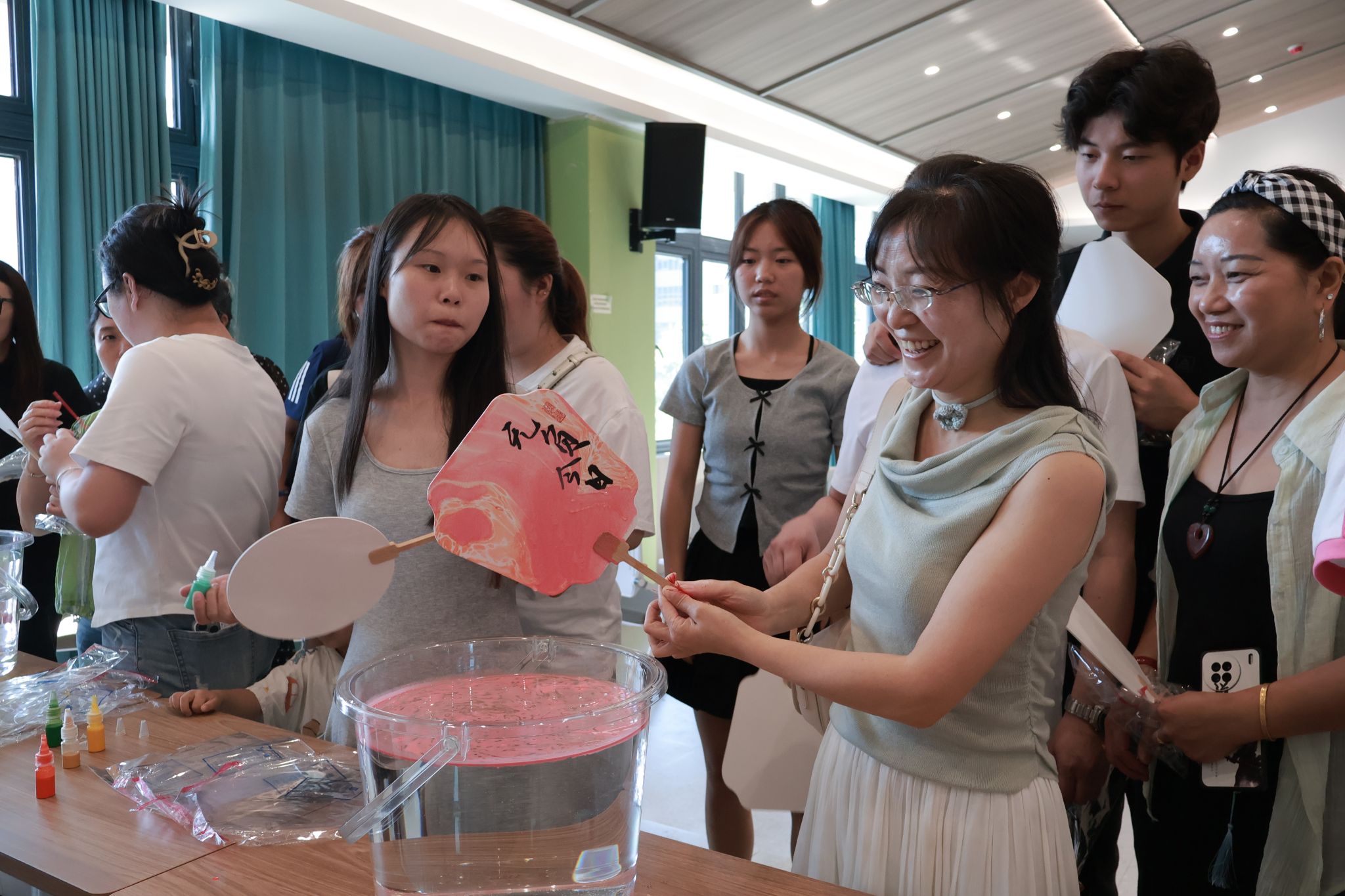 活动最后,“健合融情”手工亲子作坊,让文化传承成为亲情的纽带。家长与学子共同体验非遗漆扇制作,在调漆、描绘的专注协作中,色彩流淌于绢面,亲情与文化在指尖交融,为开放日画上充满温度与创造力的句点。