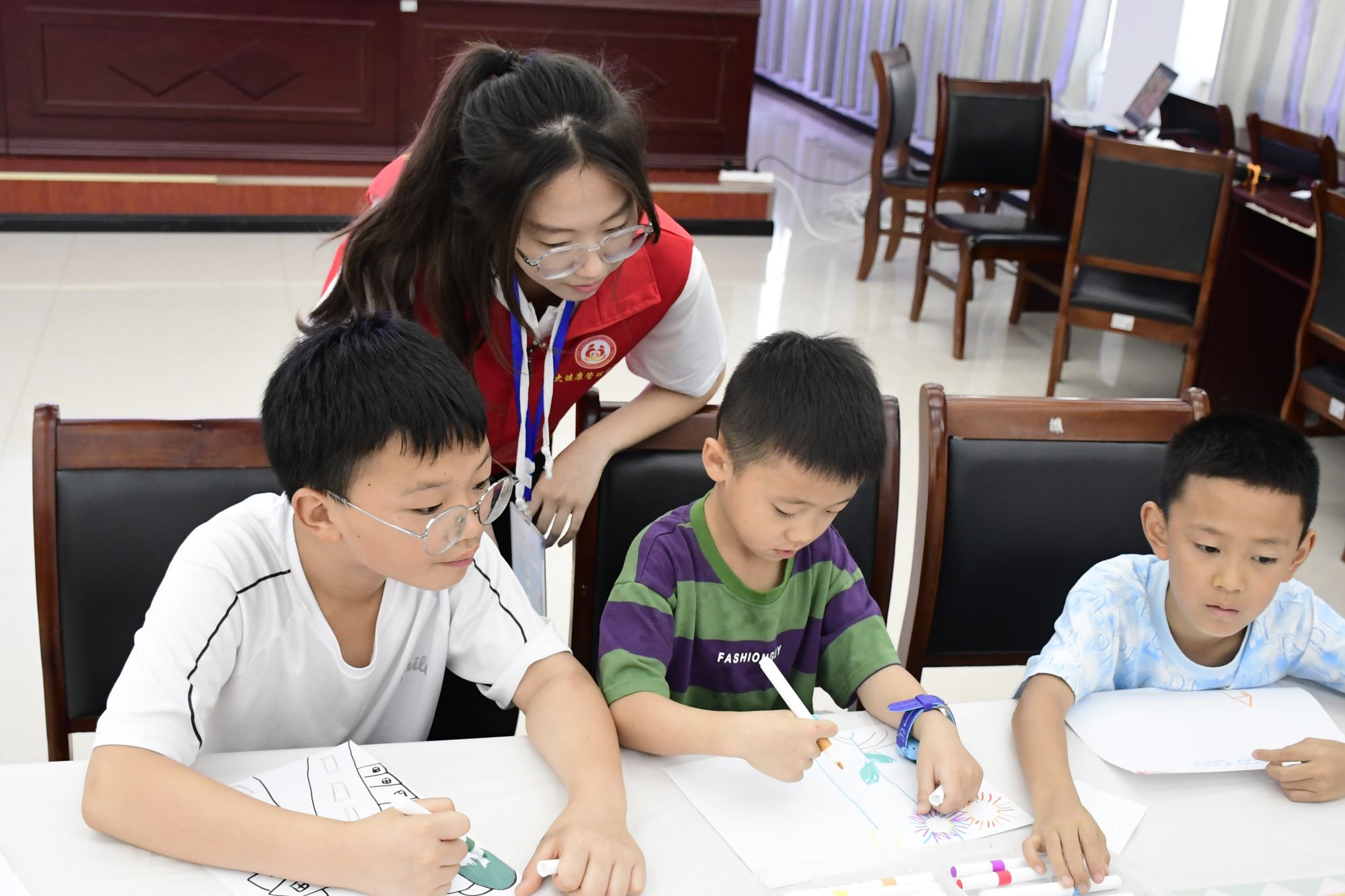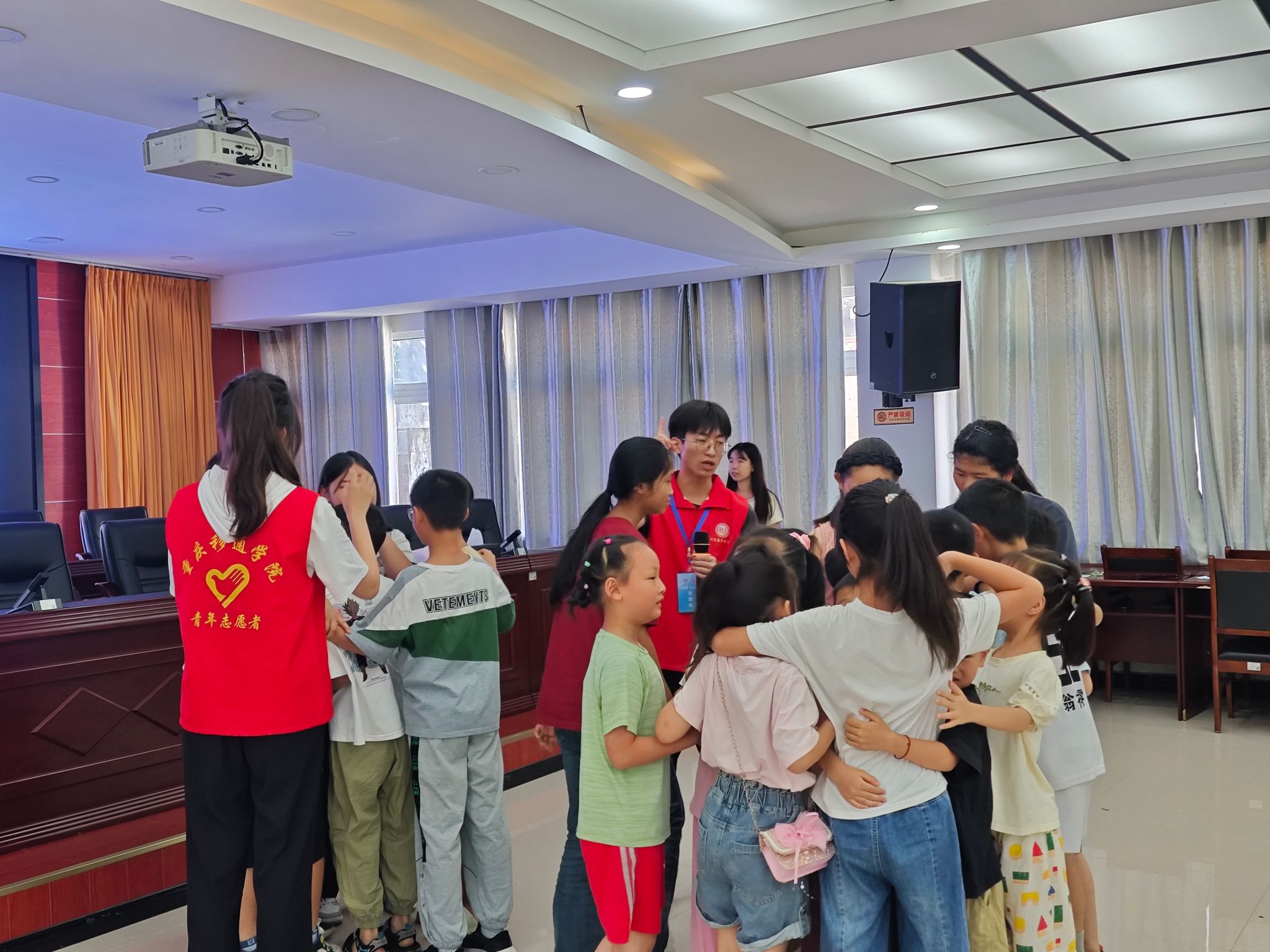 活动伊始,服务团师生召开行前部署会,精心策划活动流程。在随后的破冰环节,志愿者们组织“天气预报”“五角一元”等趣味团辅游戏,迅速拉近了与孩子们的距离,现场气氛热烈融洽。