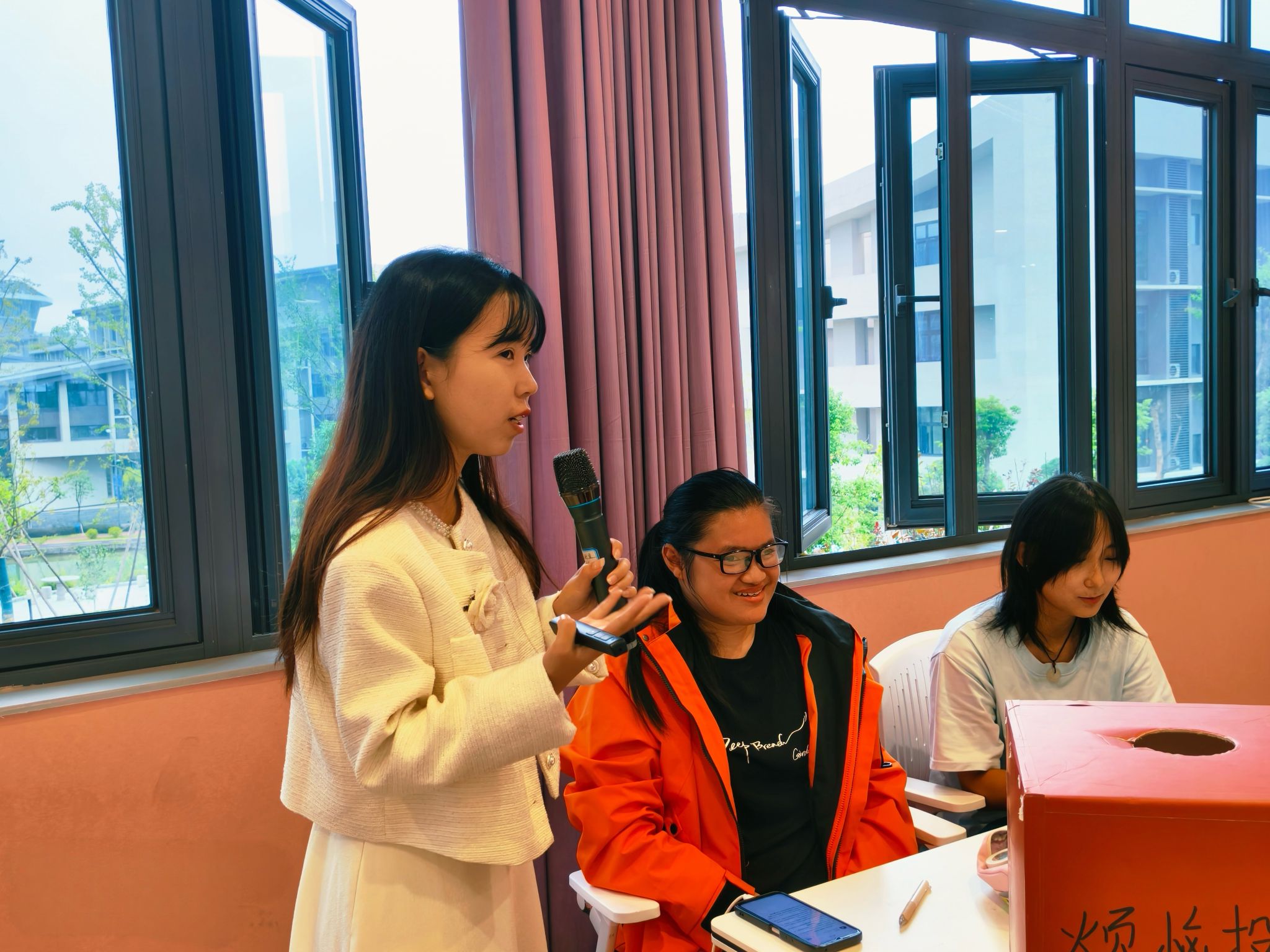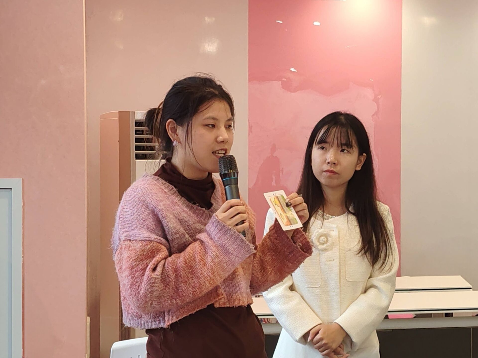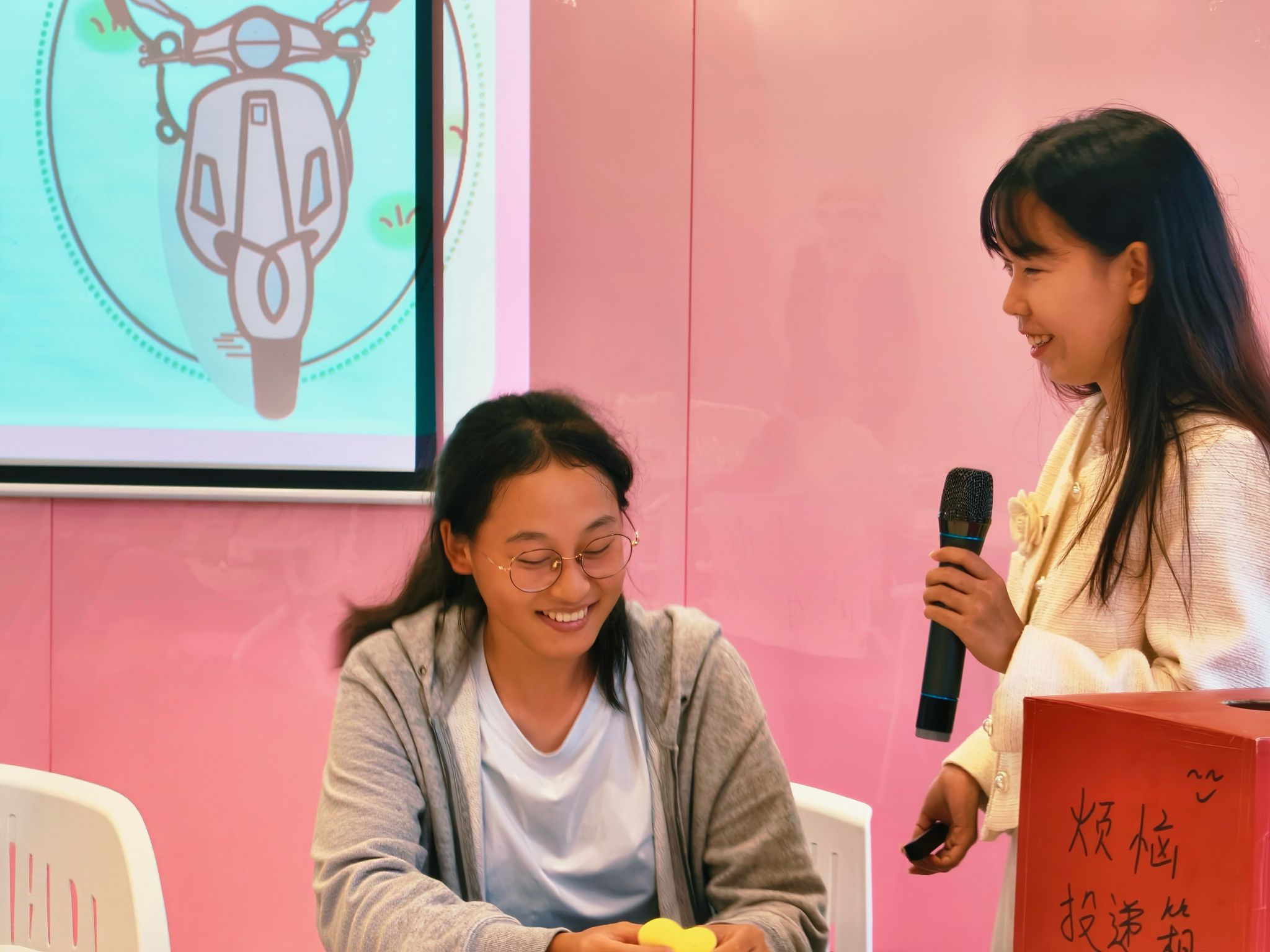 活动以“解忧杂货铺”为主线,分为五个环节逐步展开。在“走进杂货铺”环节,同学们将“近期小烦恼”写在“烦恼纸条”上投入“烦恼投递箱”,正式开启“解忧探心”之旅;随后在“解锁情绪转化工具箱”环节,邱璐老师讲解情绪ABC理论,并通过“想法转一转”活动,让同学们抽取纸条,引导同学们认识到真正决定情绪的并非事件本身,而是对事件的信念和想法;在“开启我的烦恼杂货铺”环节,同学们借助OH卡进行自我探索,勇敢表达内心真实感受;紧接着,在“组建解忧杂货铺分店”环节,大家两人一组,通过抽牌、换牌、说牌,扮演“心灵顾问”,用卡牌帮助对方转换想法、改变情绪。最后,在“解忧杂货铺打烊”环节,两位同学分享了自己的活动感受。