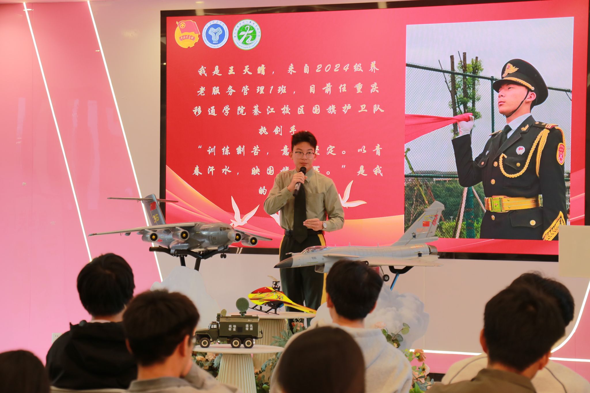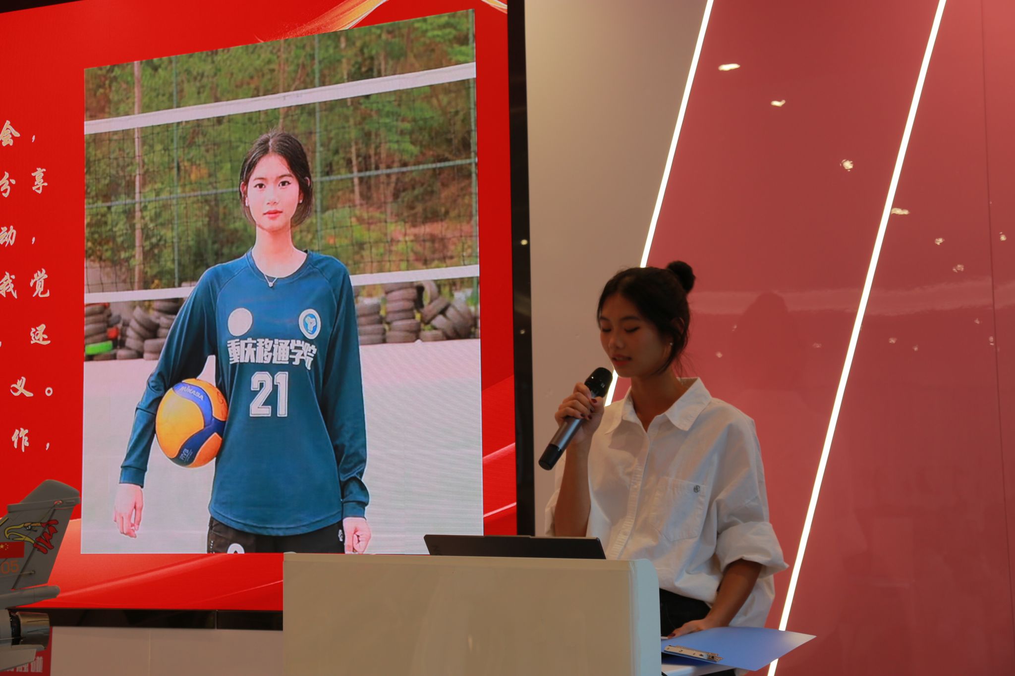 ”身边故事“环节,王天晴生动介绍了中国各型新式战机,展现其对军事知识的了解与热情。他用通俗语言科普,既体现军旅梦想,更传递爱国情怀。陆春会同学讲述排球训练克服瓶颈、锤炼意志的经历,将“自立坚韧”与“爱国担当”关联,让学子明白平凡奋斗于国防、赛场皆是爱国实践。