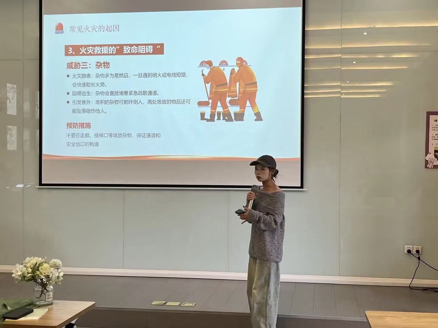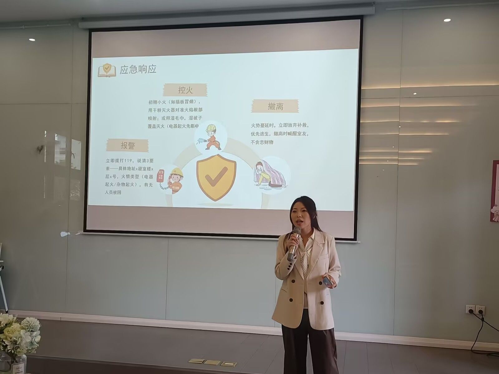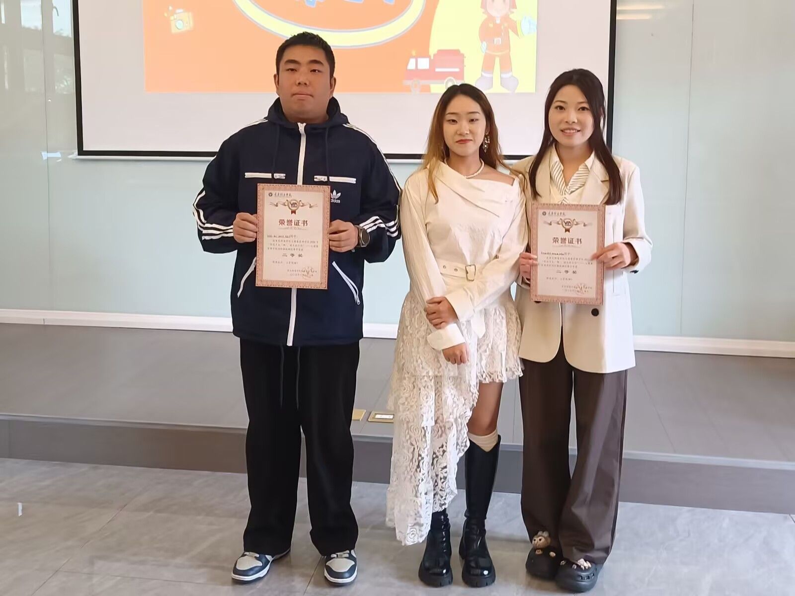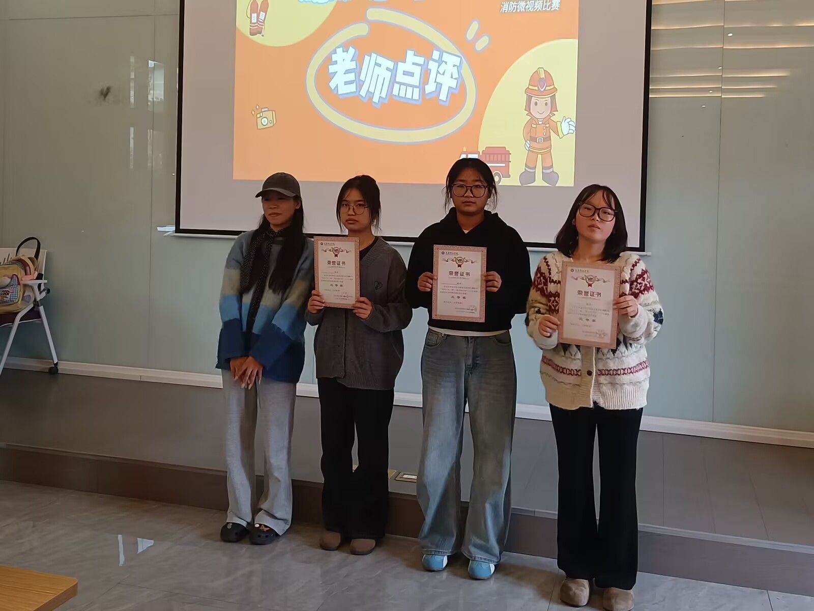 答辩现场气氛热烈。各参赛团队依次登台围绕作品创作理念、消防知识亮点与场景设计思路进行阐述。有的团队聚焦宿舍电气过载隐患,通过情景剧还原“断电、报警、疏散”的标准流程;有的团队则将镜头对准实验室危化品管理,用动画形式拆解灭火器材使用方法;更有团队创新融合“消防问答+实操演示”,让专业内容更具传播性。