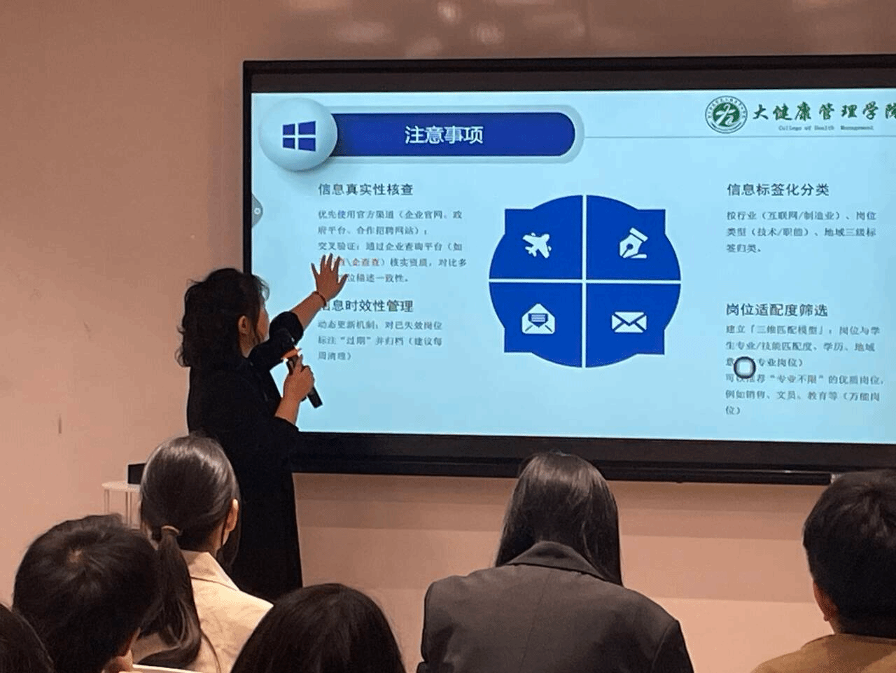 讲座中,杨铭主任围绕岗位认知这一核心,从三个方面展开深入解析。在“岗位定义”环节,她结合行业实例,清晰阐述了岗位的核心价值与定位逻辑;针对“岗位职责”,她剖析了岗位核心任务与能力要求,引导学生规划能力提升路径;关于“岗位收获”,她则强调了职业成长与技能迭代等隐性收获的重要性。