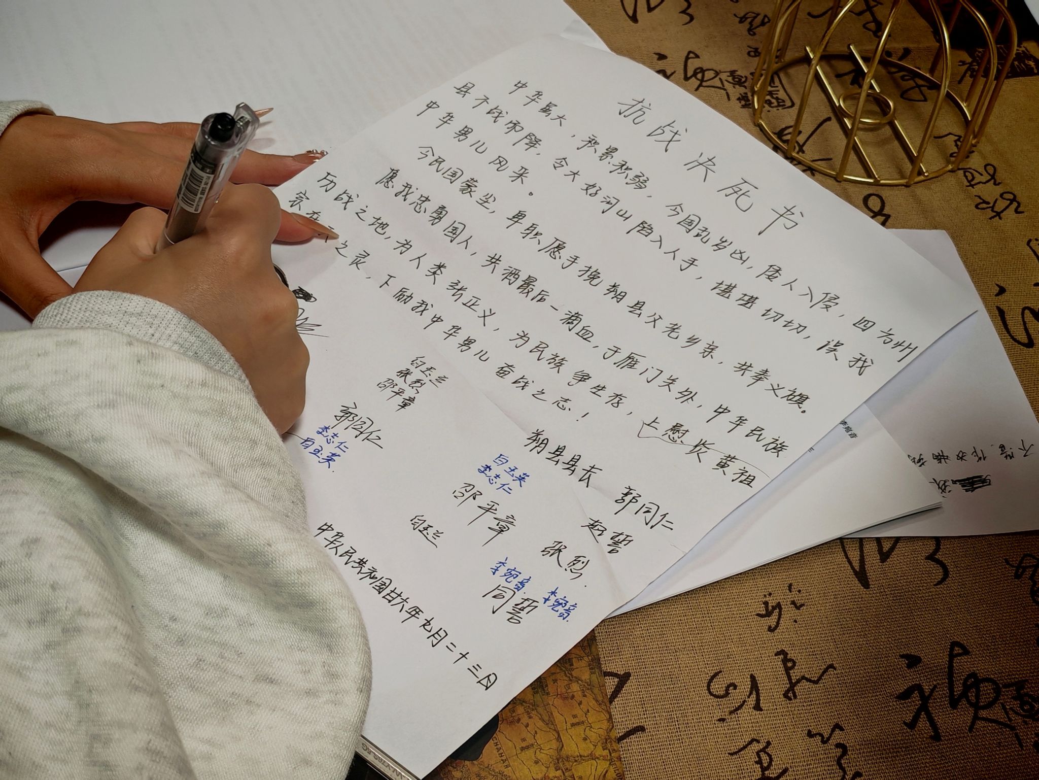 随着剧本的开启,同学们化身成为历史洪流中的关键人物,在与他人激烈的讨论中破解谜题、完成任务,在最后的决定时刻大家都不约而同地签下抗战决死书,誓死保卫国家,这份坚定与当时革命先辈们的想法不谋而合。