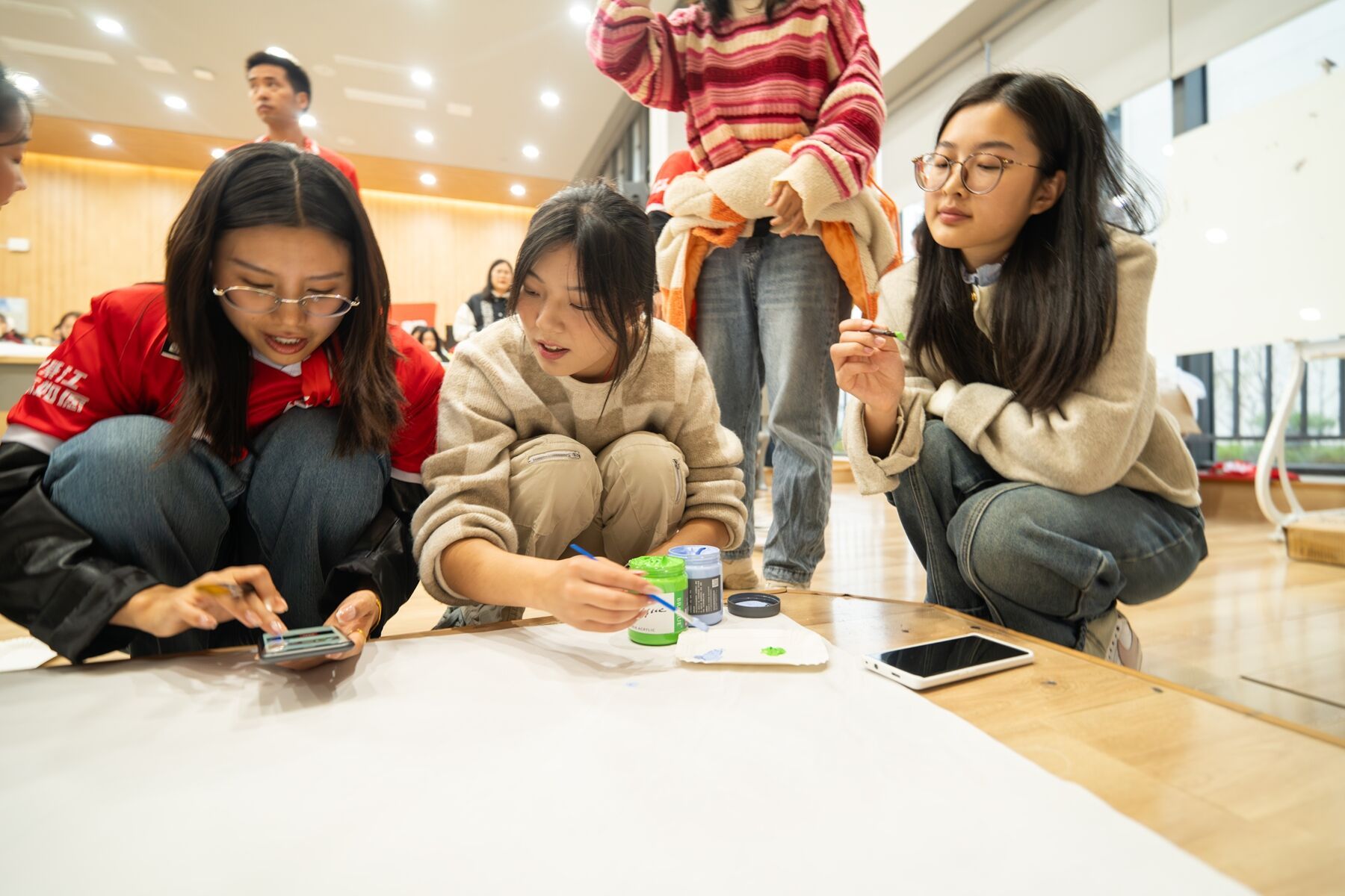 助威过后,门旗绘制实践环节温馨开启。同学们分组协作,用多彩颜料勾勒出足球运动的动感瞬间。同学们将对足球的热爱与对球队的祝福融入每一笔色彩,在实践中感受球迷文化的创意魅力,打造出专属门旗,成为了本次活动最珍贵的纪念。