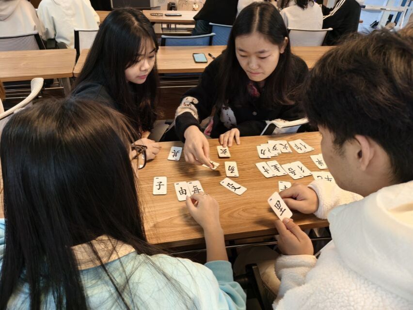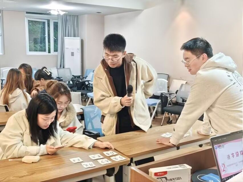 本次活动精心设计三大趣味互动环节,以不同的形式展现文字的魅力,让同学们在欢声笑语间感受知识的魅力,让知识在欢乐的氛围中得以传播。“成语接龙”环节,大家展开脑力交锋,在一轮轮接龙中比拼词汇储备量;“拼字游戏”限时玩转汉字结构,在动手动脑间深化对汉字构造的理解;“你比我猜”则聚焦协作与表达,在配合中打破知识传递的固有模式。