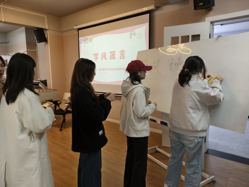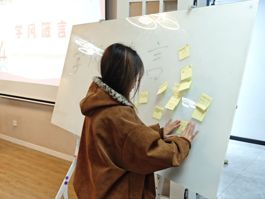 趣味互动后,同学们聚焦于“学”这一主题,在留言便签上写下学风箴言。一份份个人感悟在笔尖流淌、在集体中汇聚,最终化作共促成长的集体共识,为校园学风建设注入源源不断的青春力量。
