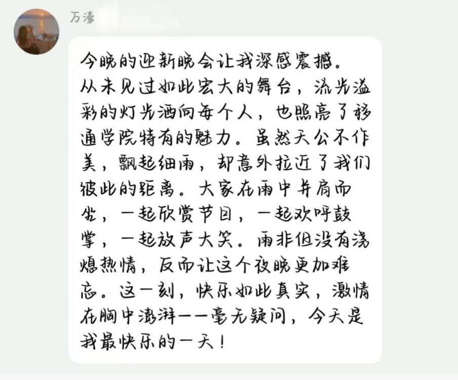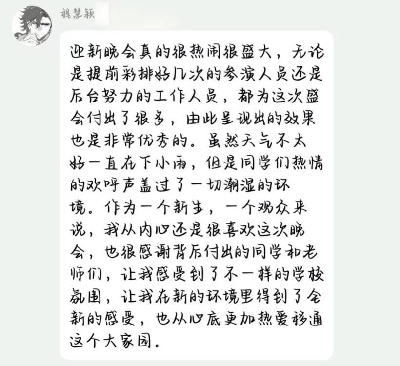 迎新晚会不仅是一场文艺演出,更是新生适应校园生活的“实践课堂”:“无论是台前的展示、台下的体验,还是幕后的付出,这些平凡却温暖的“第一次”,如同点点星光,照亮了新生们的大学起点,也让移通校园的迎新故事更加鲜活动人。