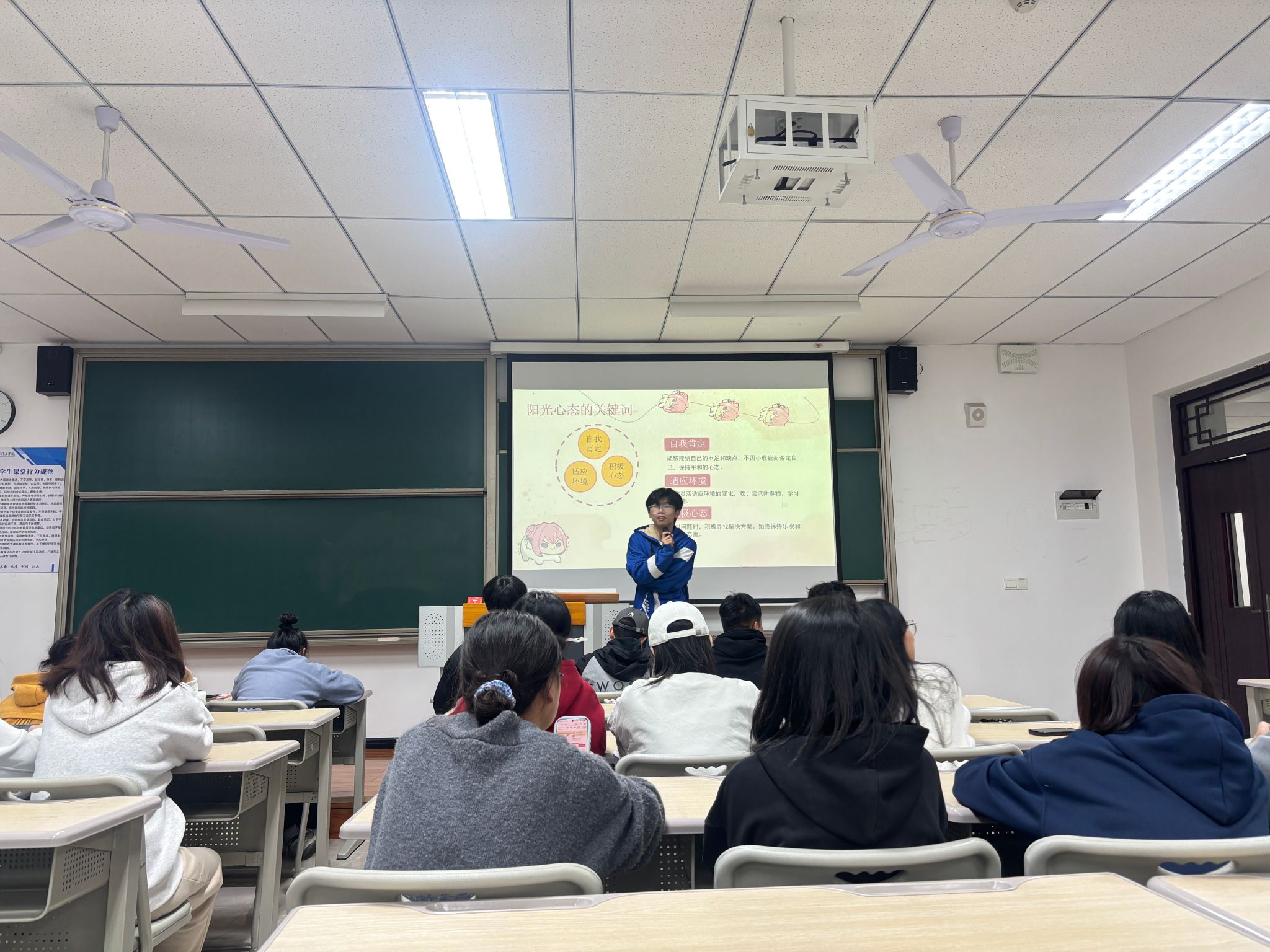 班会伊始,王申昊同学以一段轻松幽默的开场白,引出了当代大学生普遍面临的学业、人际、未来规划等多重压力话题,迅速拉近了与同学们的距离,活跃了现场气氛。